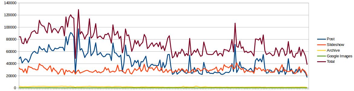 Here is an update from Google Analytics. Number of visitors is pretty much unchanged but we are serving at least 50% more images than couple of years ago. I suspect since hosting move to Singapore, images are loading quicker and visitors tend to view more images as a result.