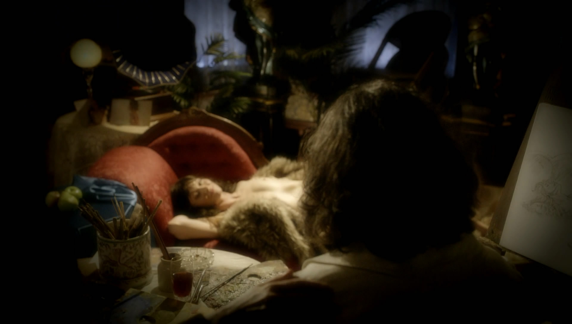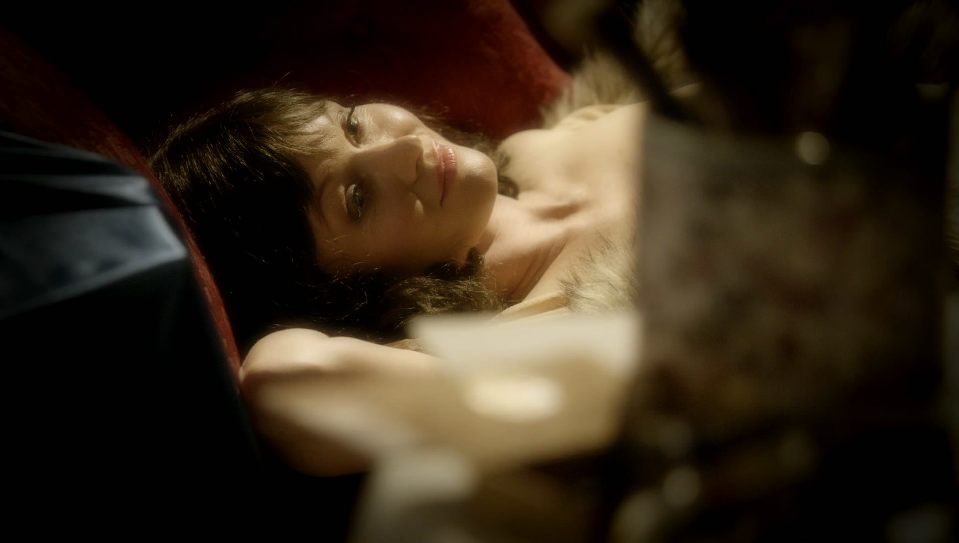 If anyone every catches it, there was an episode in the last season where she played her lover, a French artist, nude model and flashed some breasts.