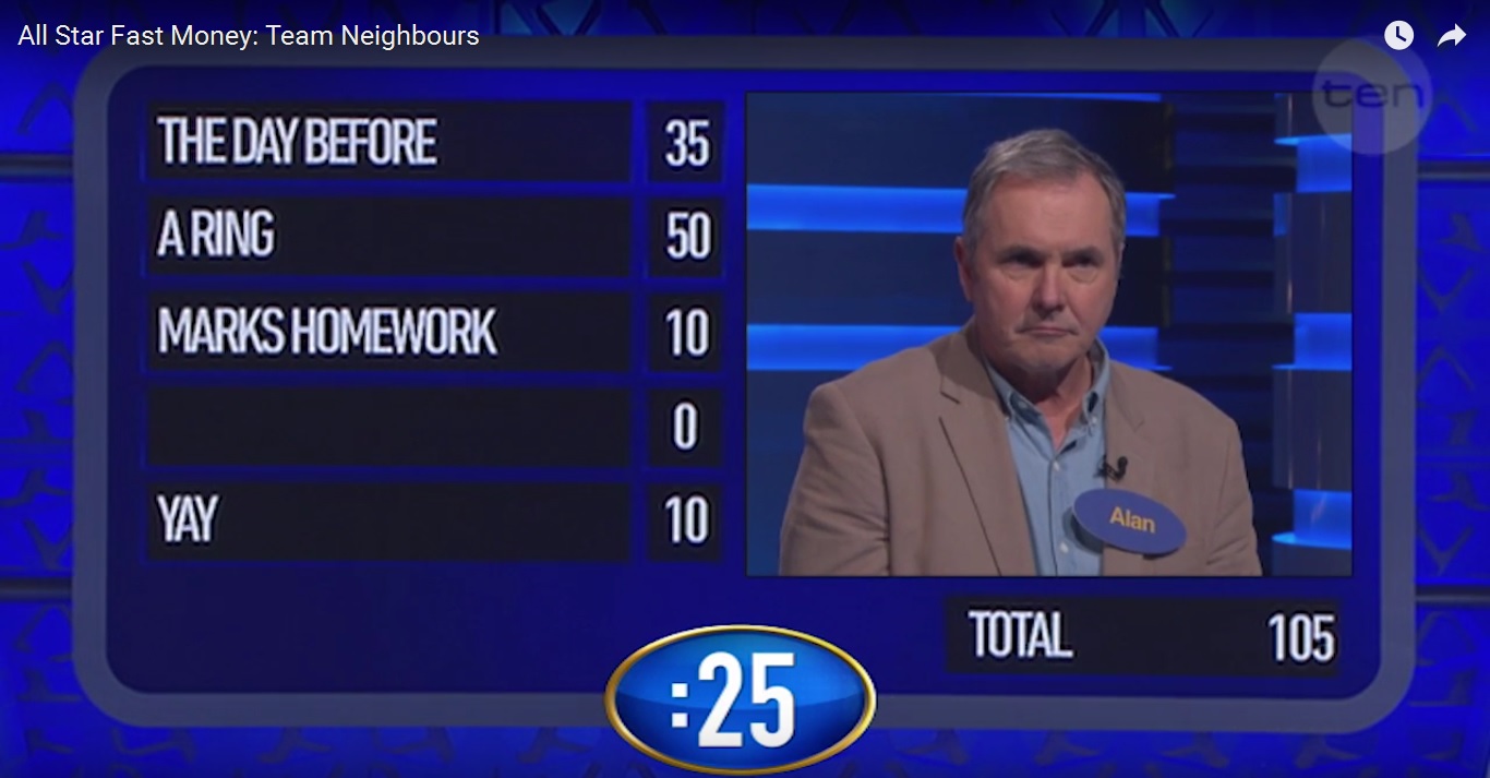 All Star Family Feud: TV's most enduring couple Karl and Susan from Neighbours! https://www.youtube.com/watch?v=X8whhn7 ... tml5=FalseAll Star Fast Money: Team Neighbours https://www.youtube.com/watch?v=9aDw4Tt ... tml5=False