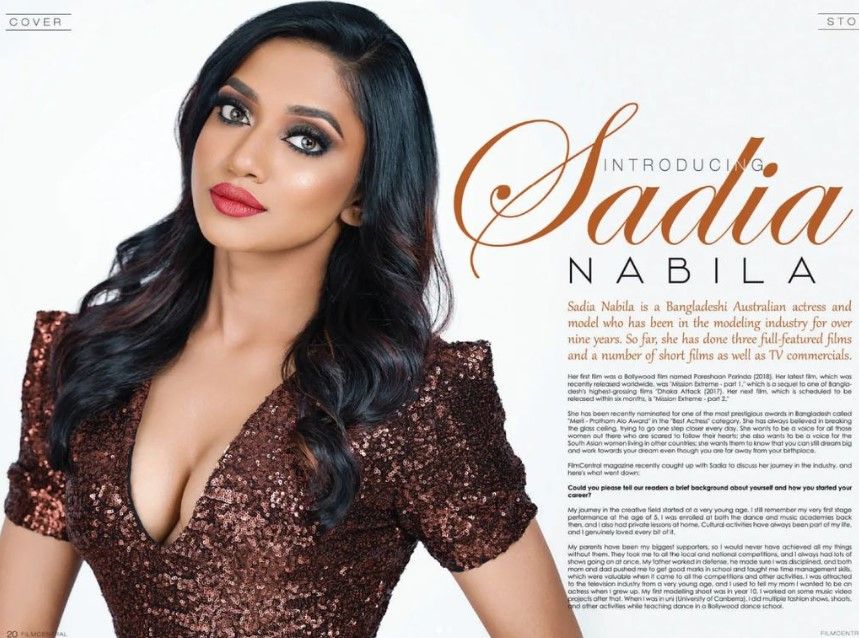 Sadia Andalib Nabila is a Bangladeshi Australian actress and model widely known as Sadia Nabila. She is known for her Bollywood debut in Pareshaan Parinda and Bangladeshi film Mission Extreme alongside Arifin Shuvoo.Mission Extreme is the sequel to one of Bangladesh's highest-grossing films Dhaka Attack (2017). She was nominated for the Best New Actress category of the Meril-Prothom Alo Awards in 2021, for her Bangladeshi debut. She completed her higher studies at the University of Canberra