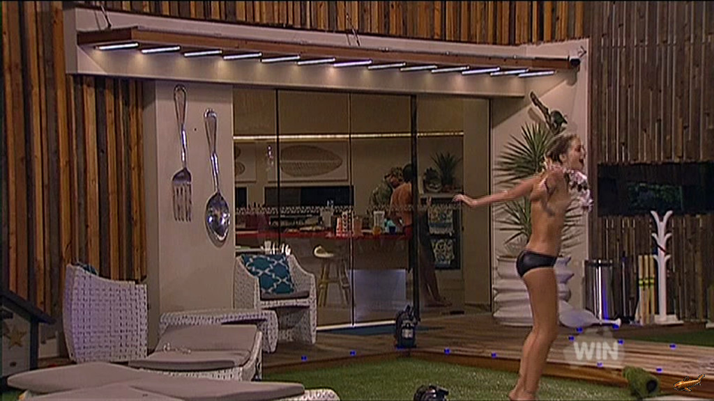 A GIF would be about 9Mb, so have done a 1.3Mb AVI instead, and uploaded to Rapidshare. I have a Premium account so no download limits etc BBAU_S10_Tully_Topless.avihttp://rapidshare.com/files/4102125056/ ... opless.aviNote: Link has changed because I changed the title slightly.plus 3 caps...