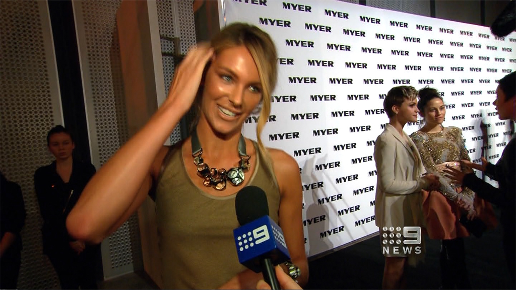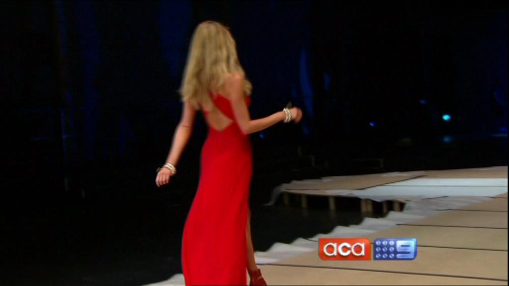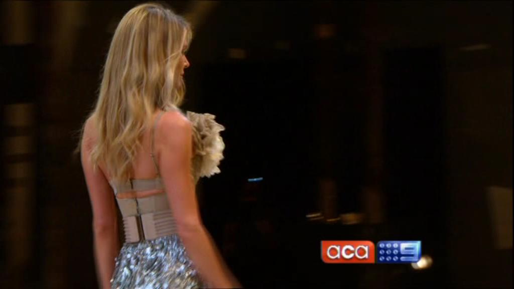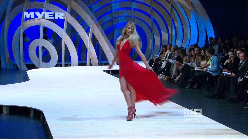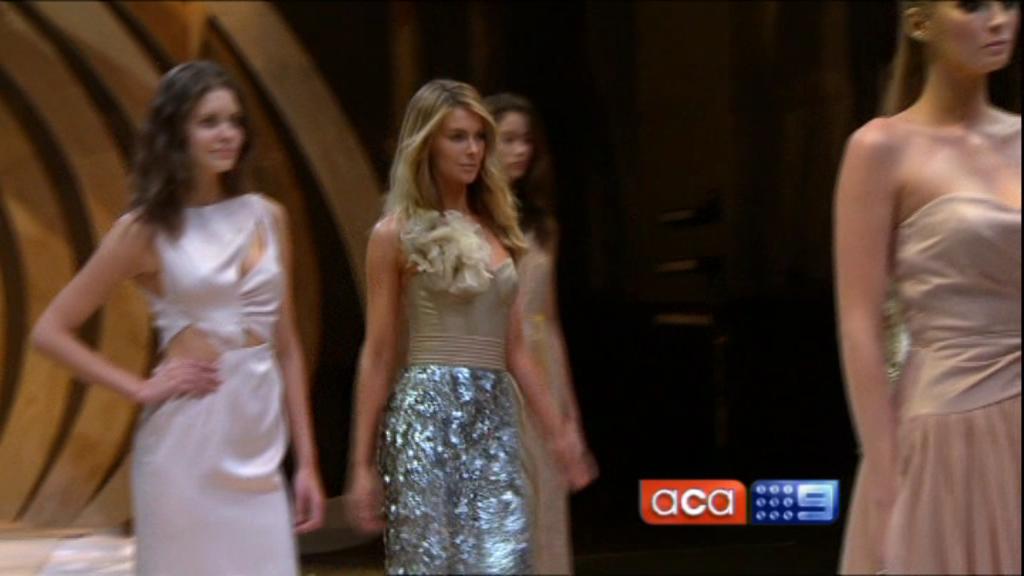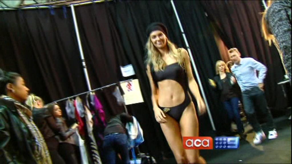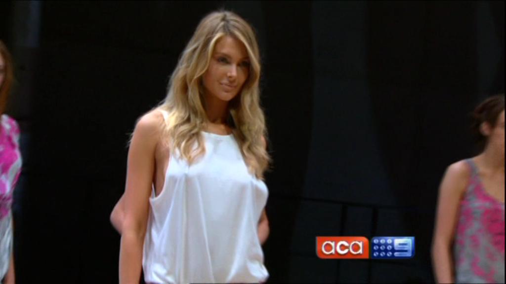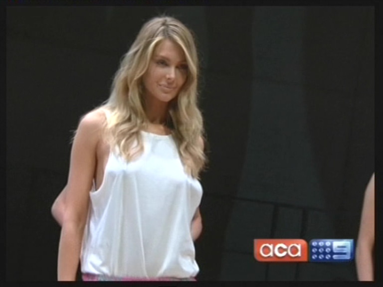 I saw on Today Tonight Jen walking up and down the catwalk at the Myer launch with a white shirt on, no bra and a good view down the side of her boobs. Anyone get a cap?