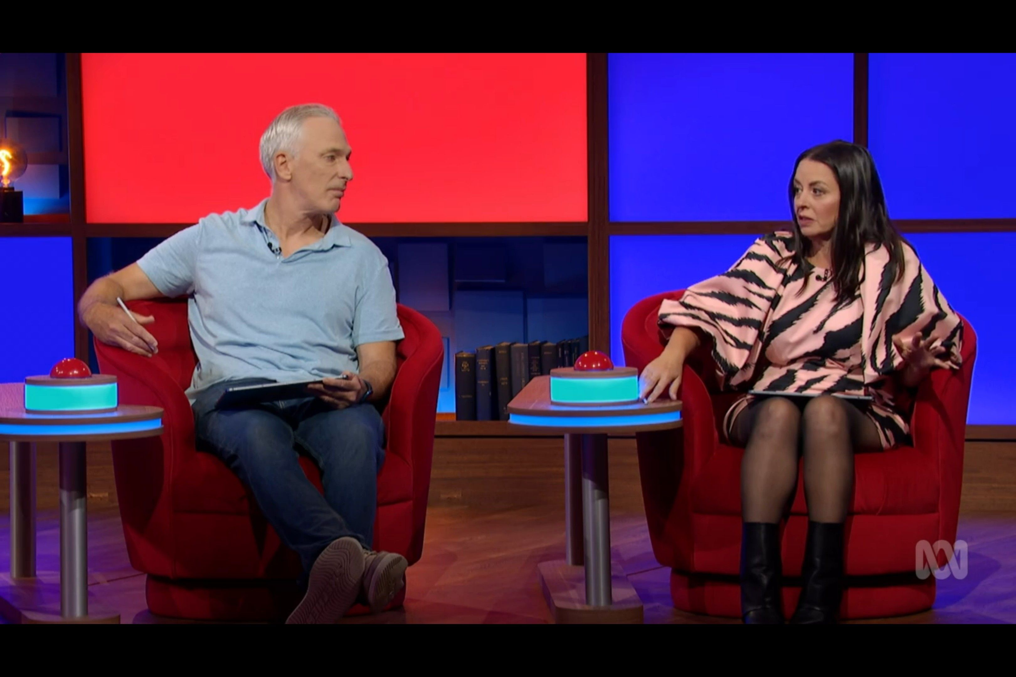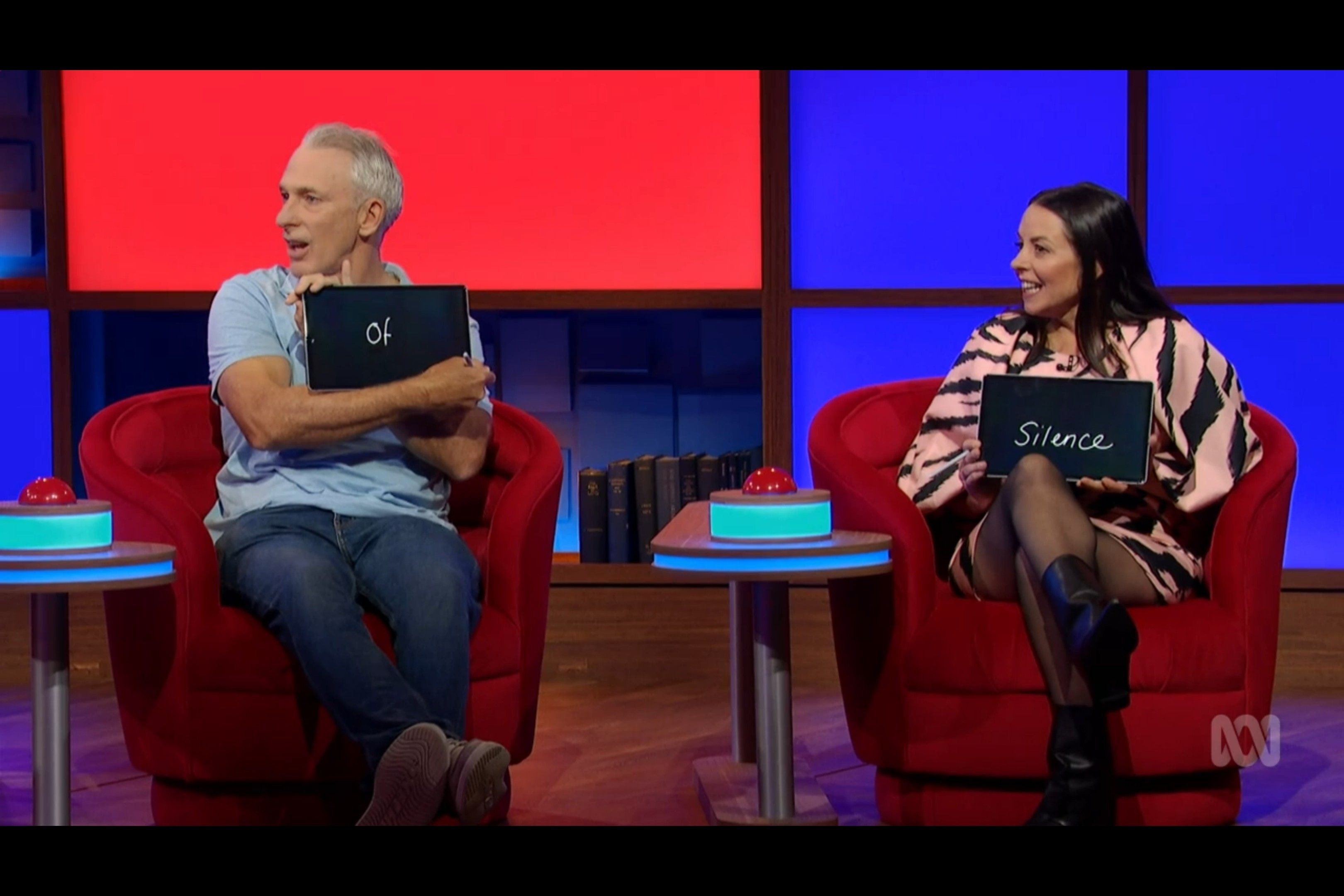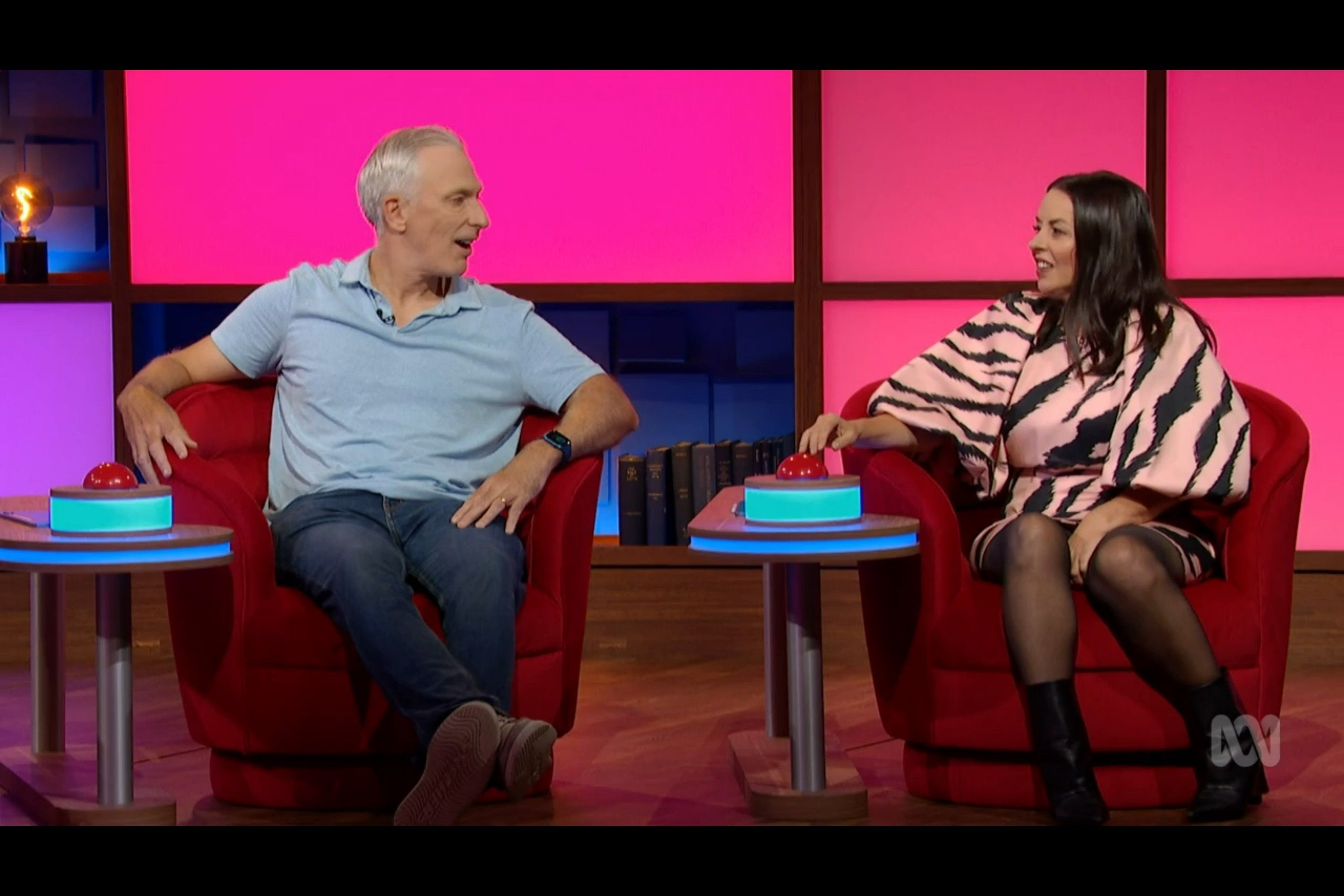 Myf showing a bit of thigh on an ABC game show hosted by Claire Hooper I came across.