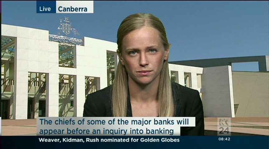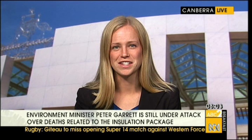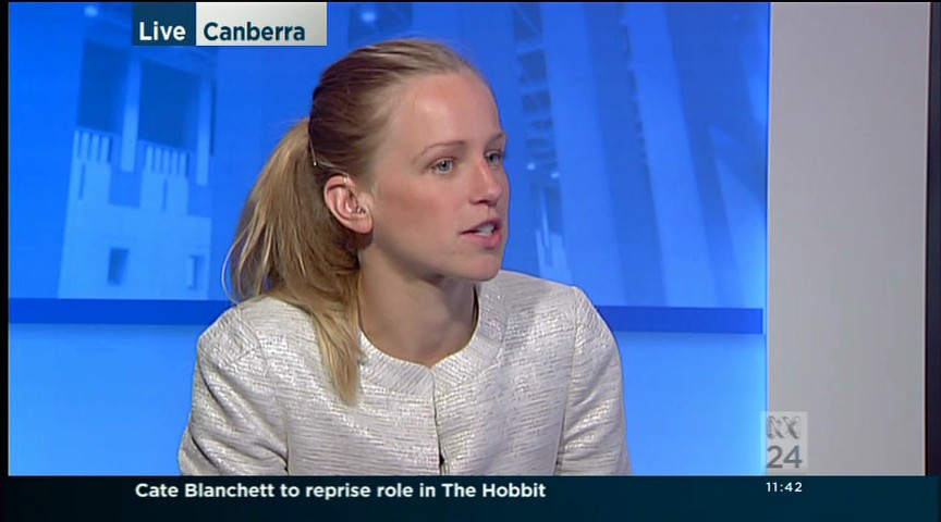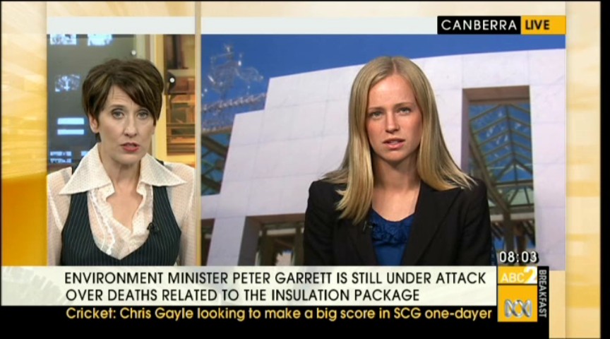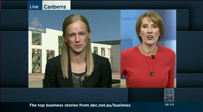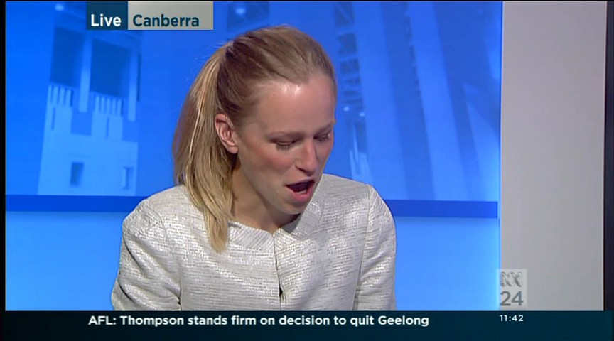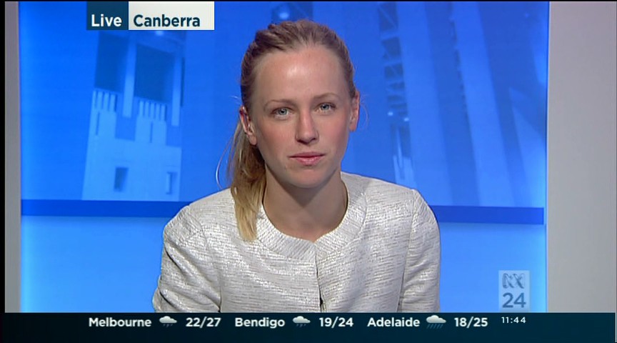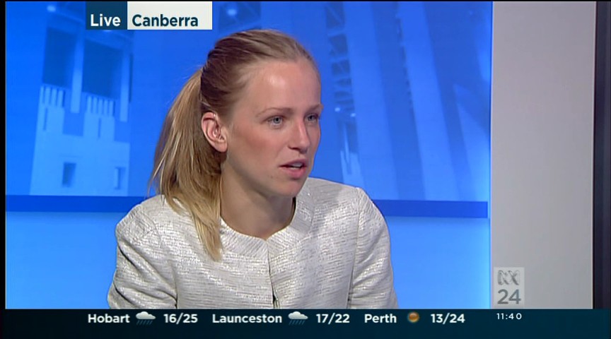 You could try the evening news for some bannerless caps from different spots around parliament. Have seen her on the evening news recently.