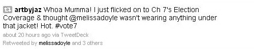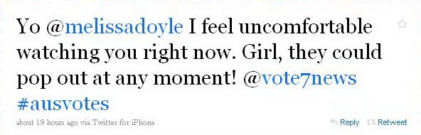 spazzenger wrote: Mels undertop tonight looks like she isn't wearing one! Haha, I was shocked at first sight. I nearly fell off my chair when switching to Channel Seven suddenly at around 5:30 pm