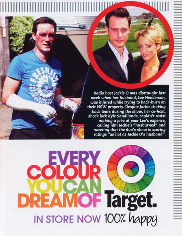 an article about Jackie O's husband's accident; followed by a poorly placed ad