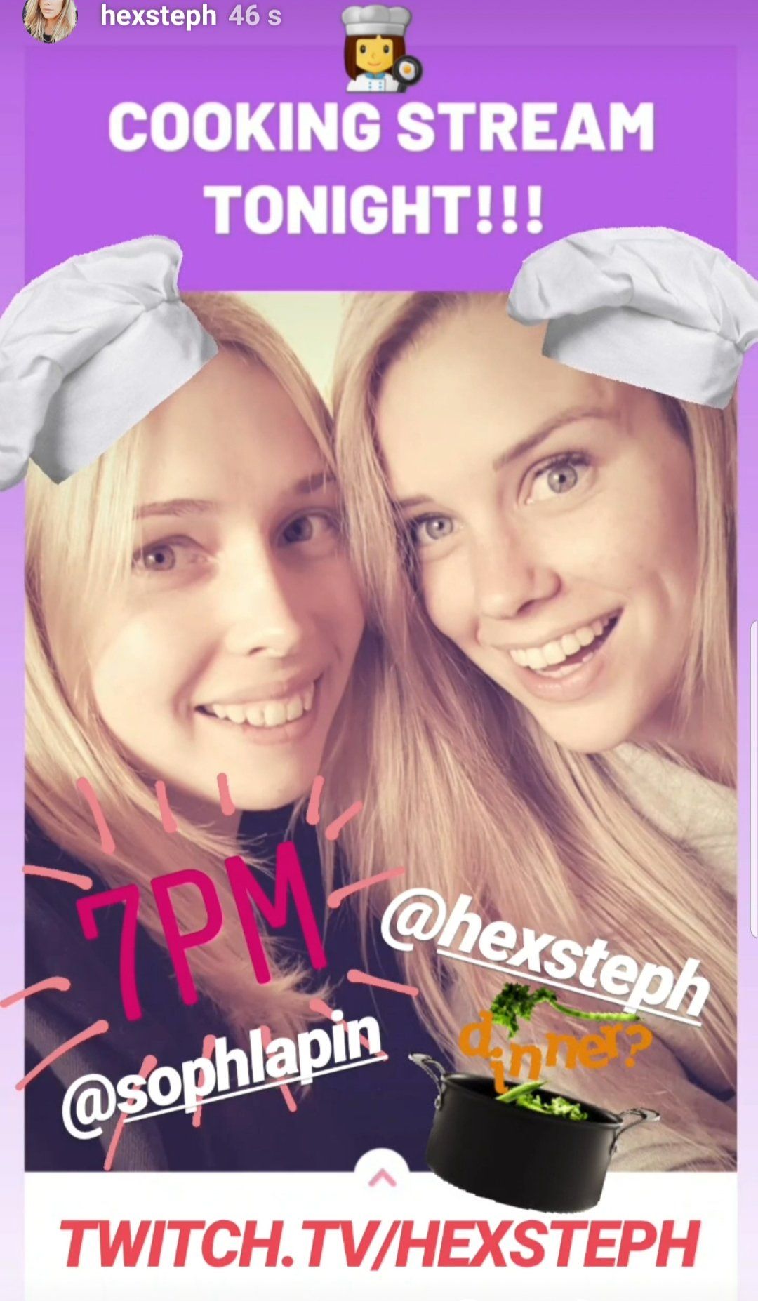 My lovely friend @sophielapin is joining me tonight for my first ever cooking stream! It will likely be a disaster but it's happening! 7PM http://twitch.tv/hexsteph