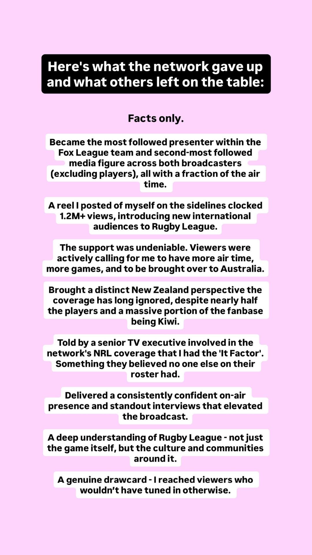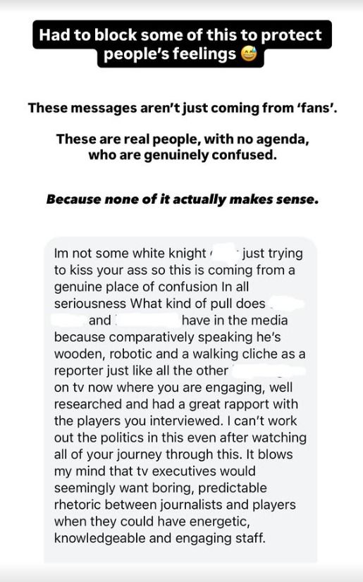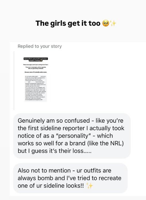 Honestly think some of those replies are from herself on new accounts, she literally had a 10 second cameo every 40 mins for a half time report and maybe an injury report that takes 5 seconds, 99% of people watching the footy wouldn't even know who you are or give a fuck.
