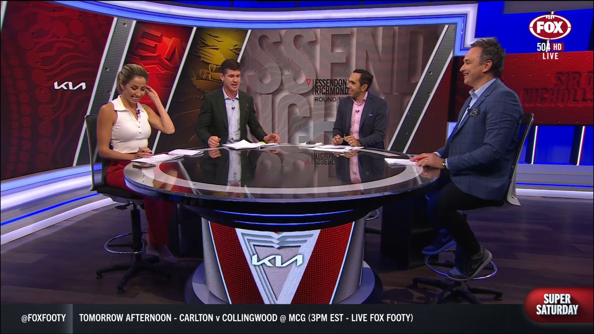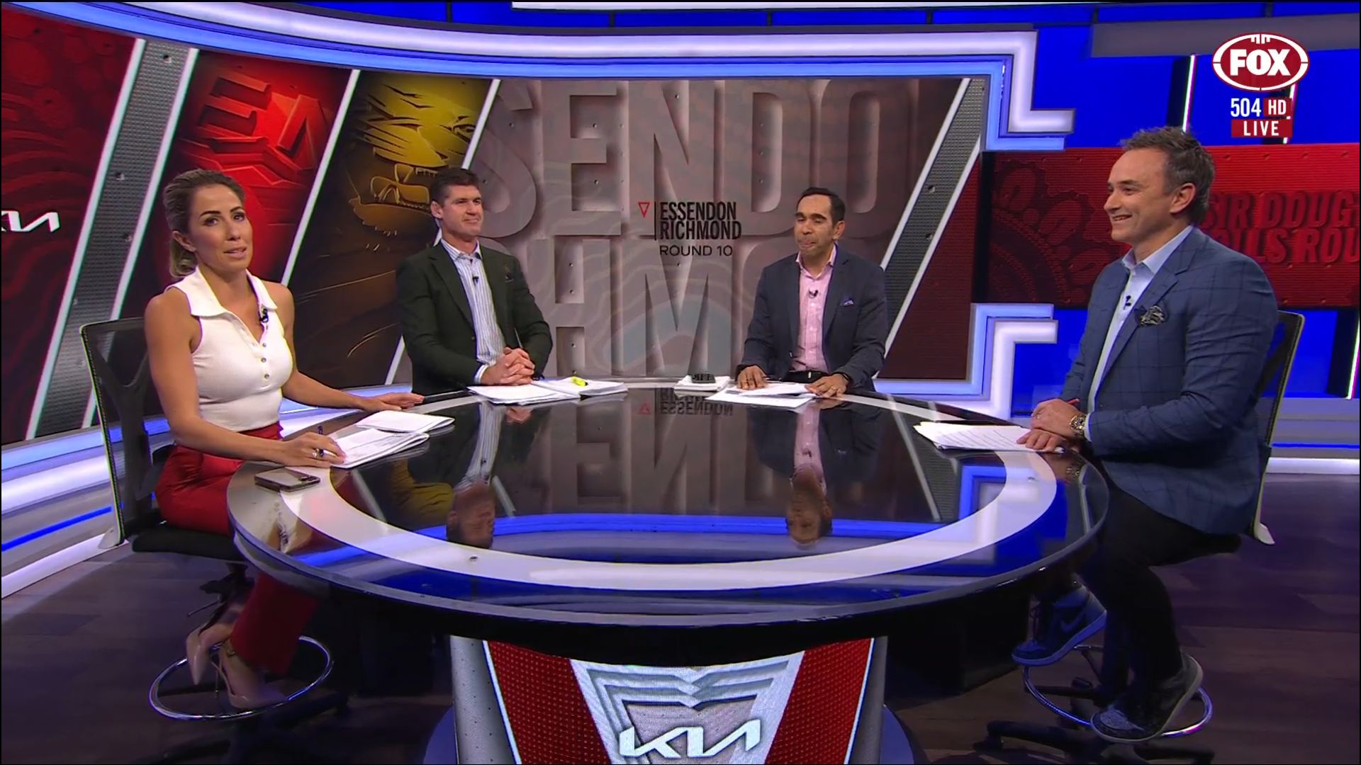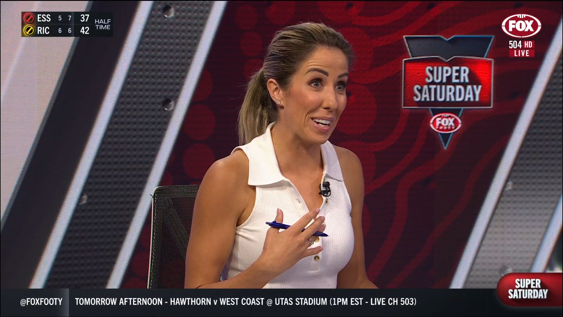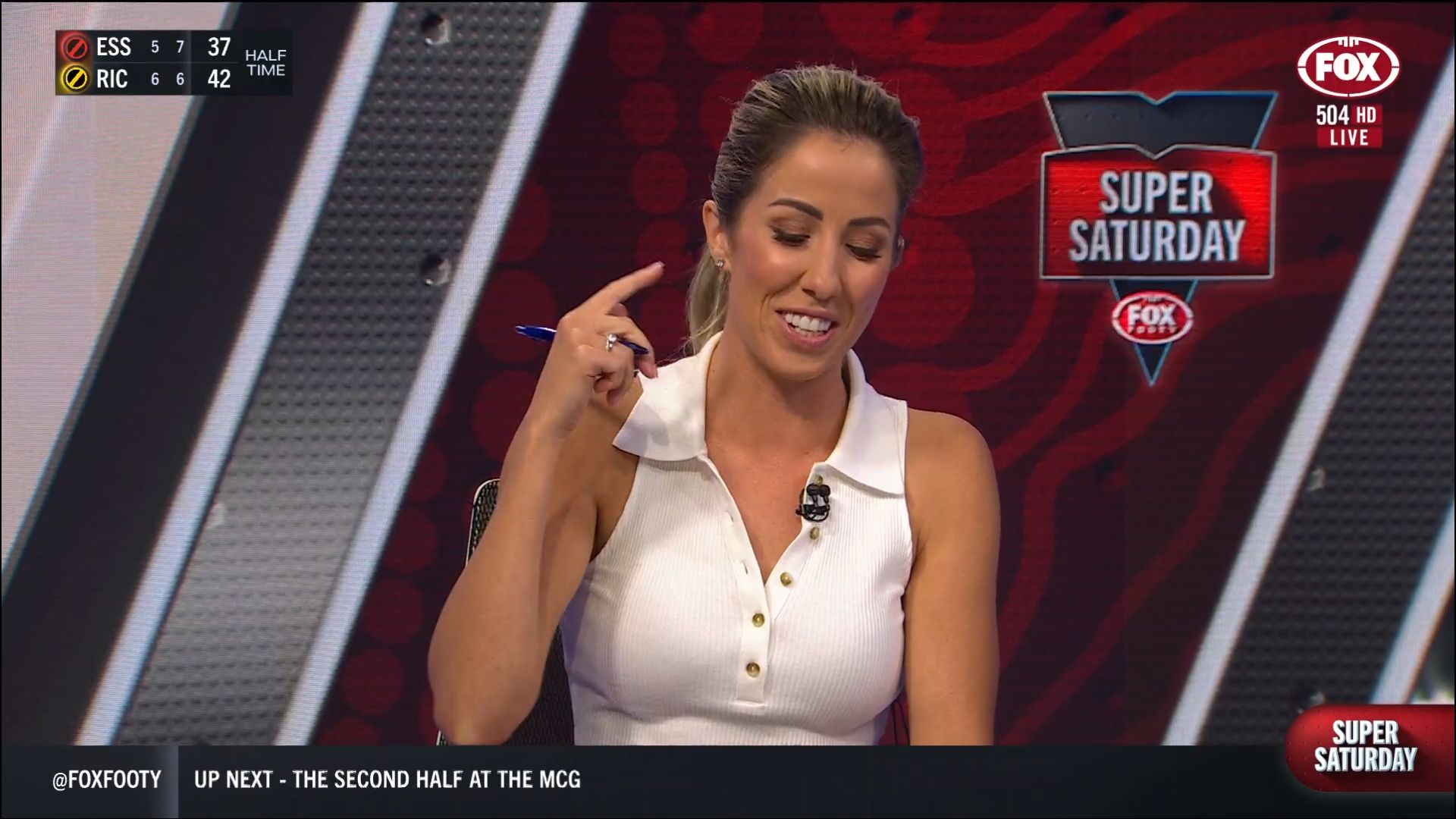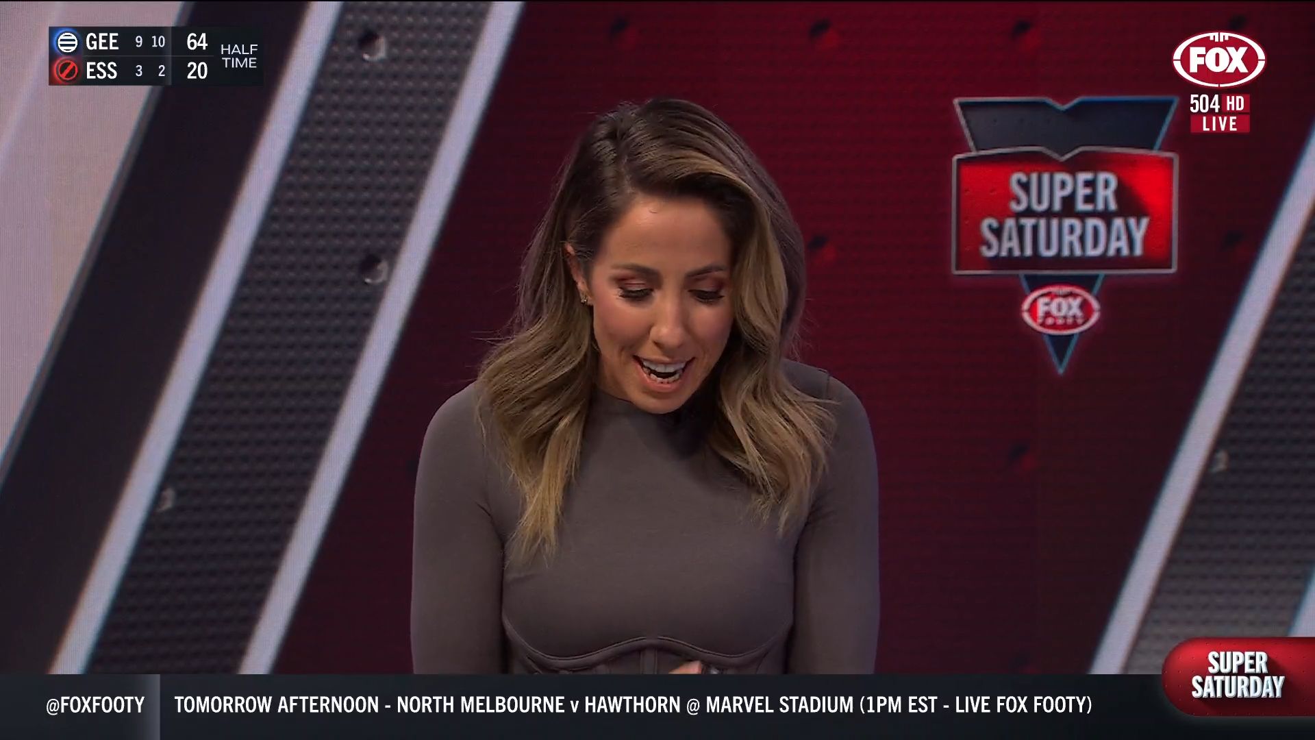 Kath looking great in a leather skirt on Fox Footy!