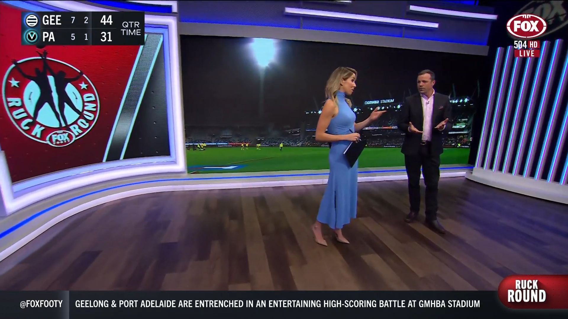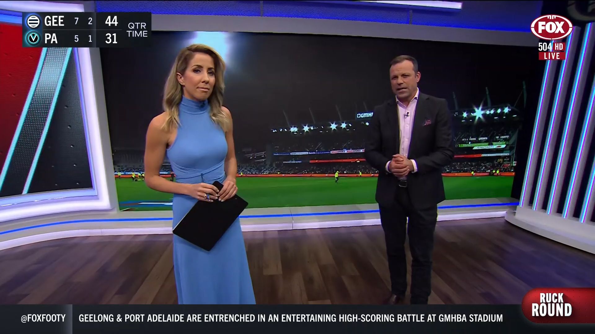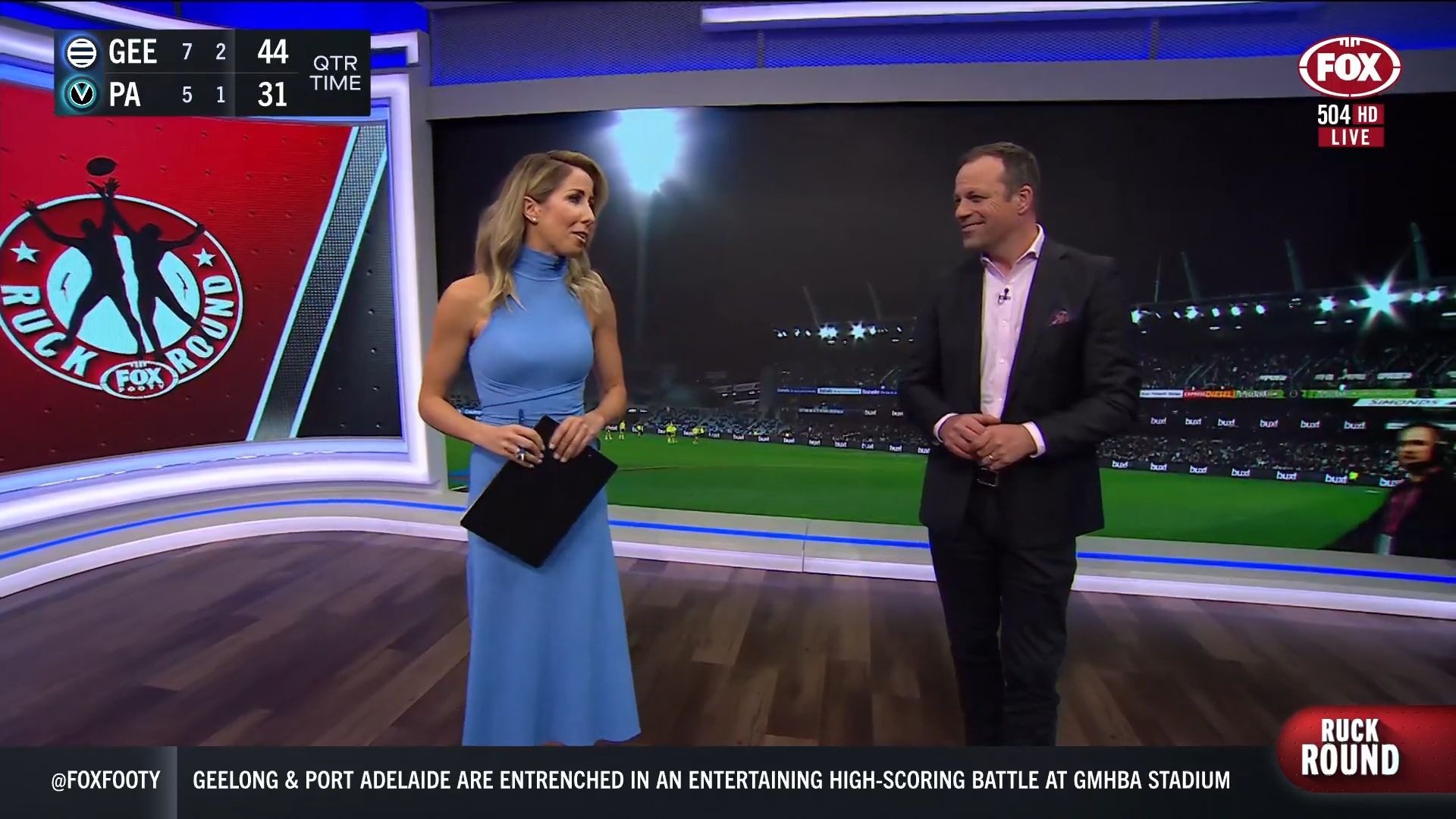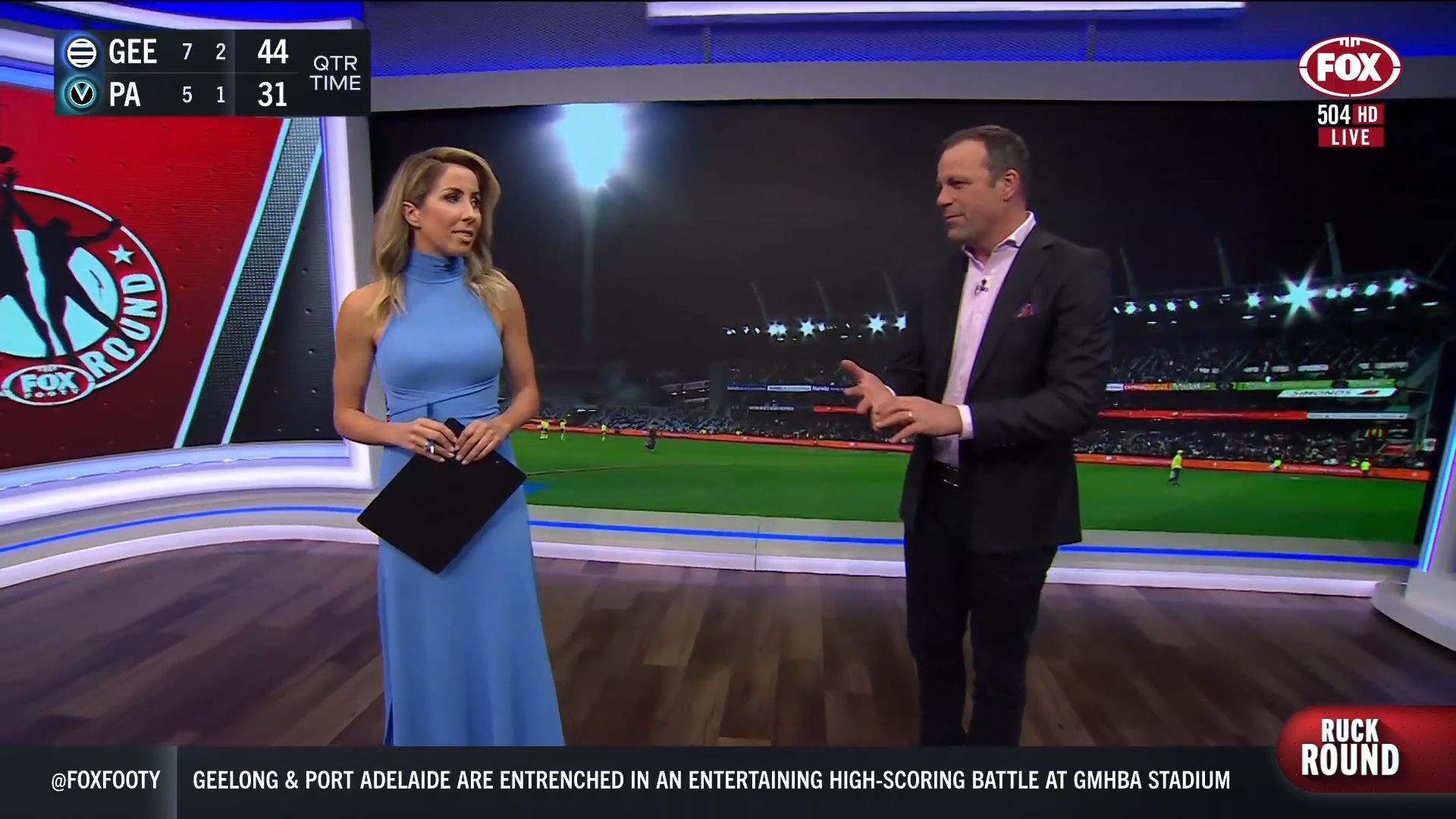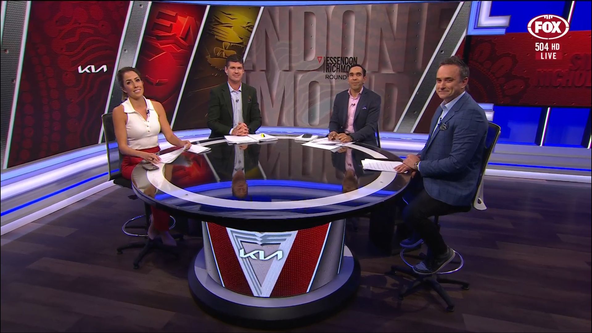 Kath looking great in a leather skirt on Fox Footy!