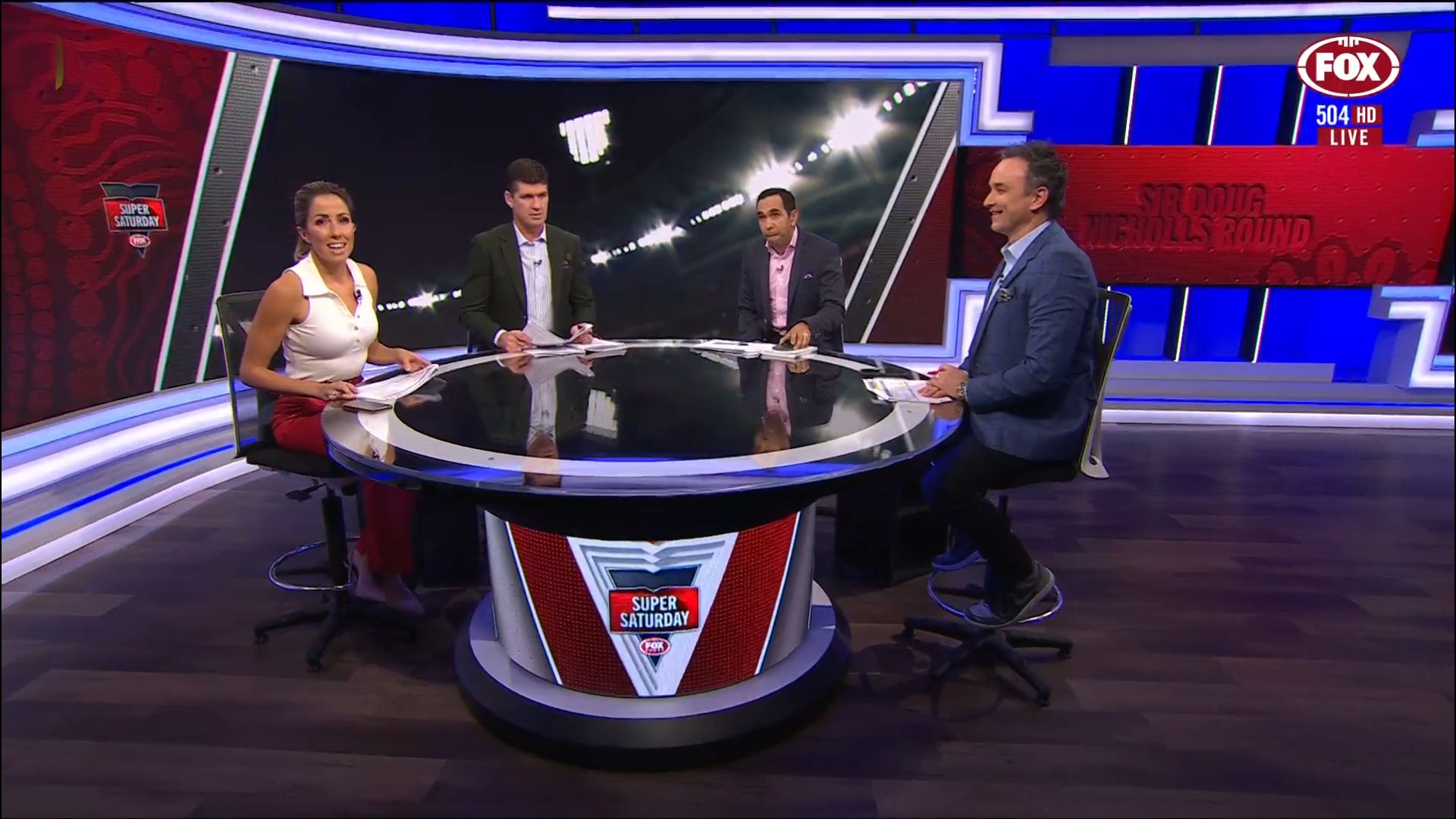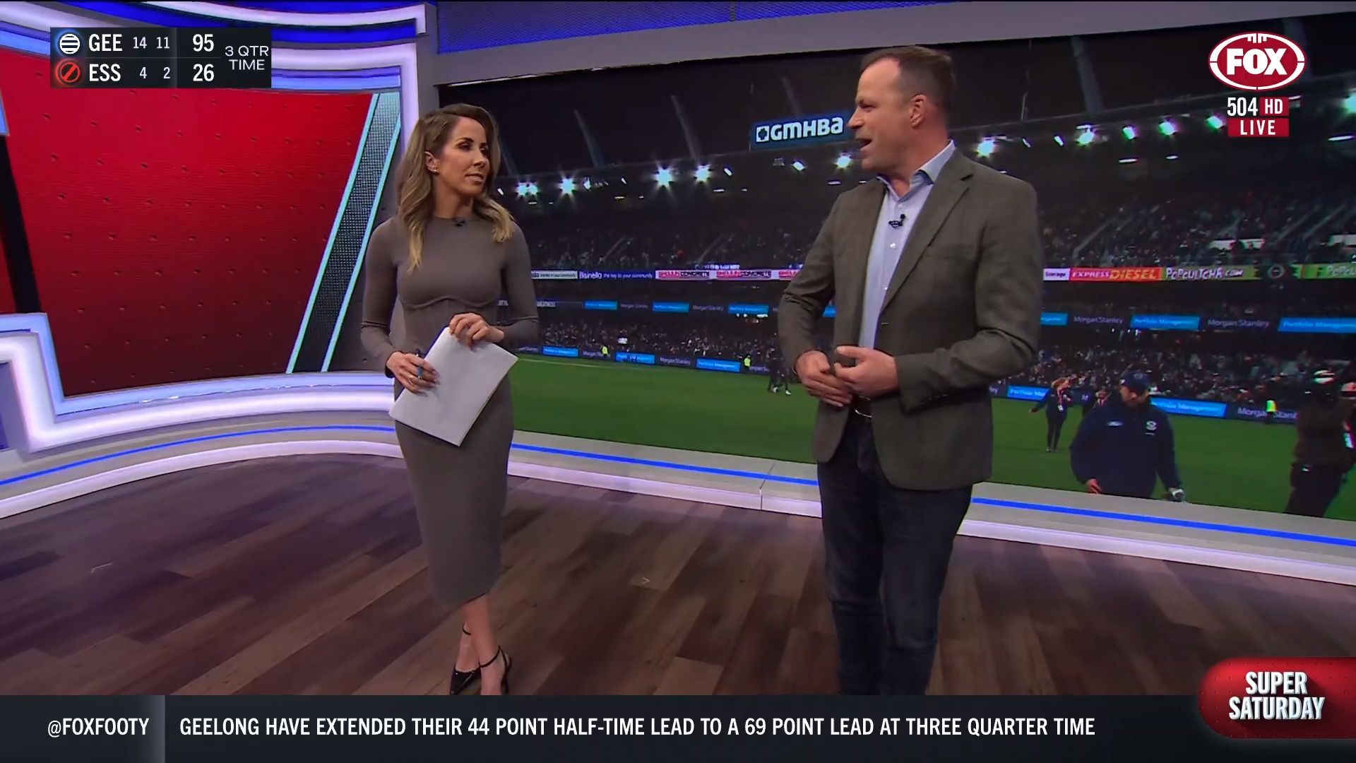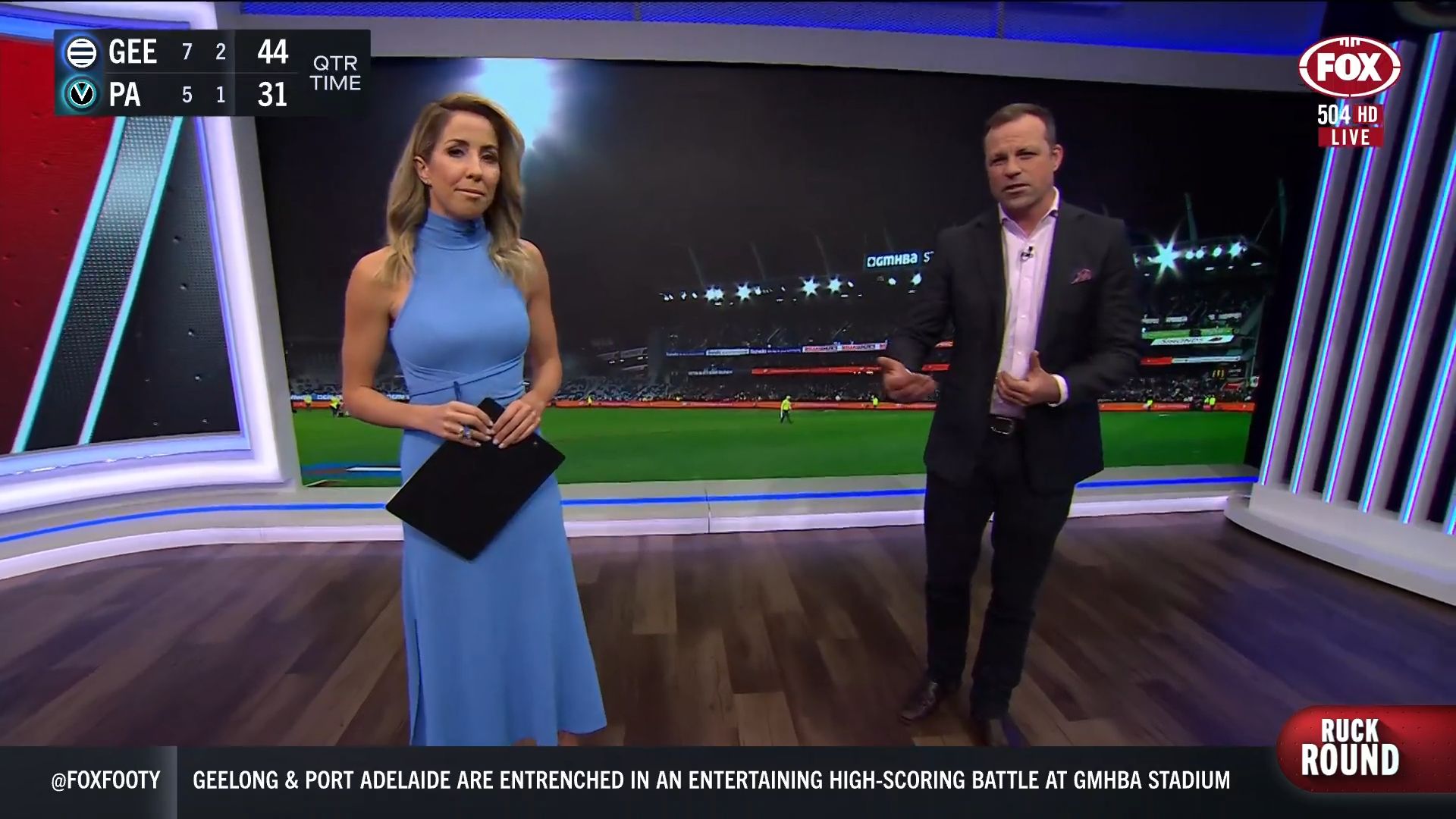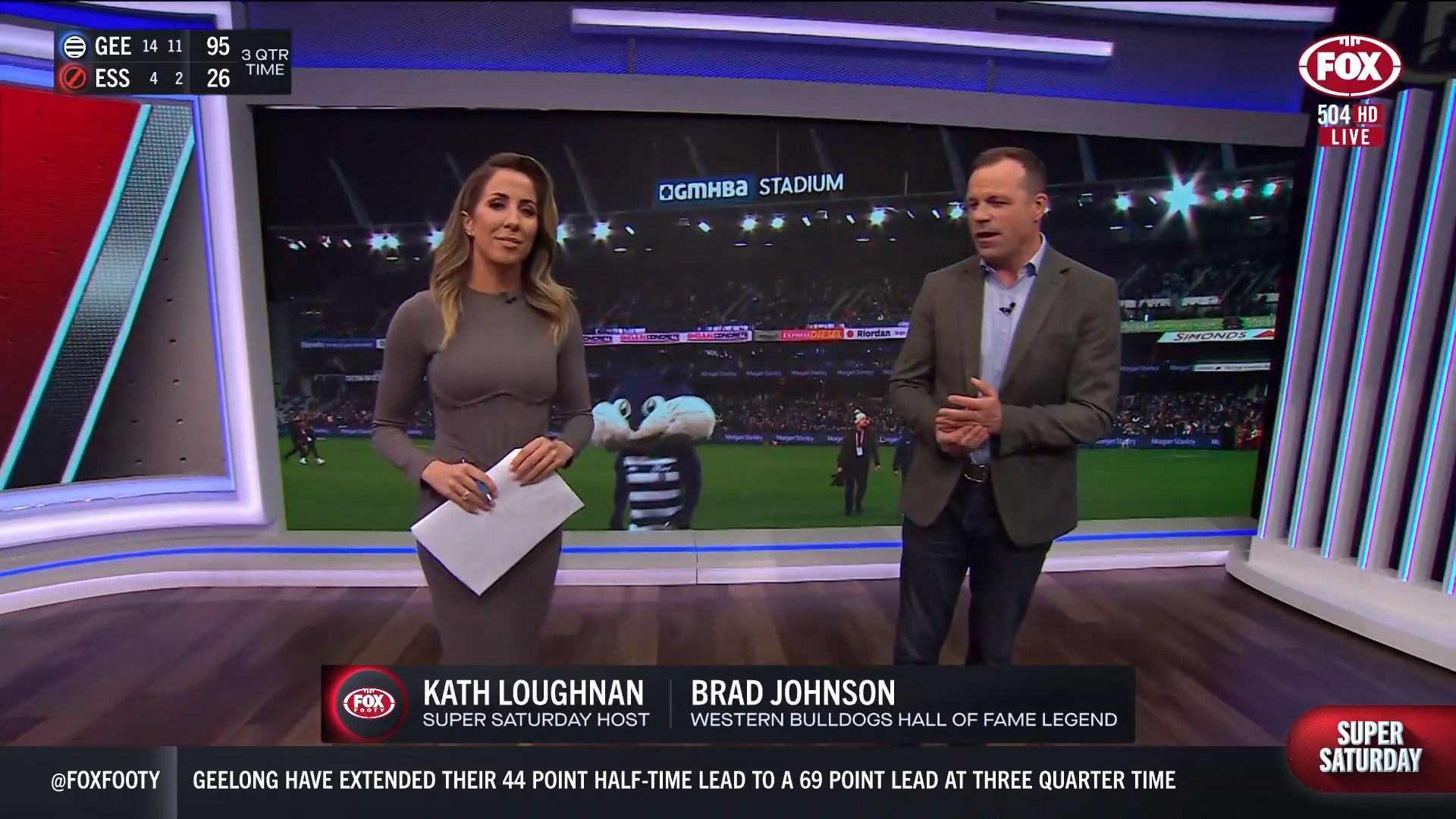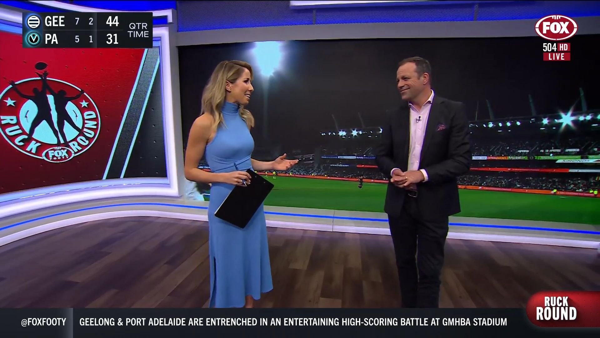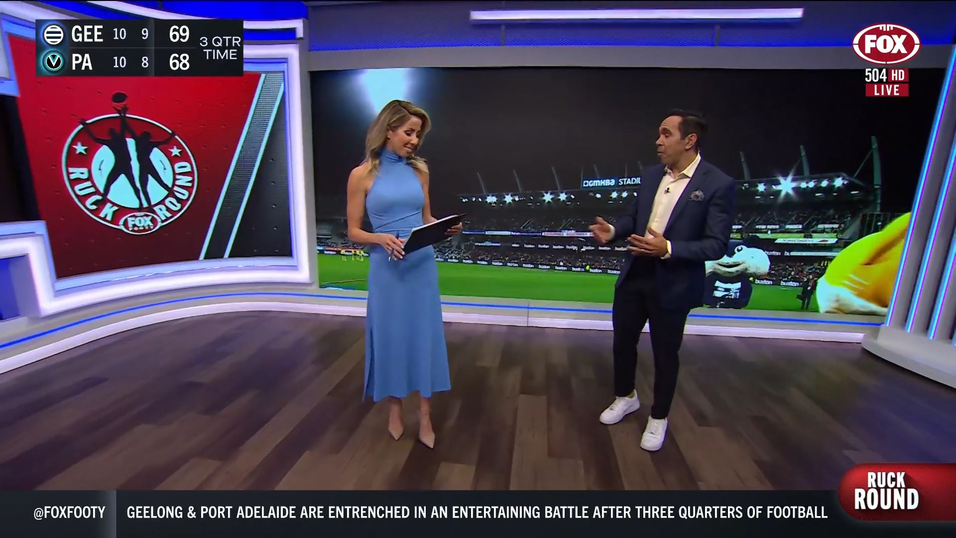 Kath looking great in a leather skirt on Fox Footy!