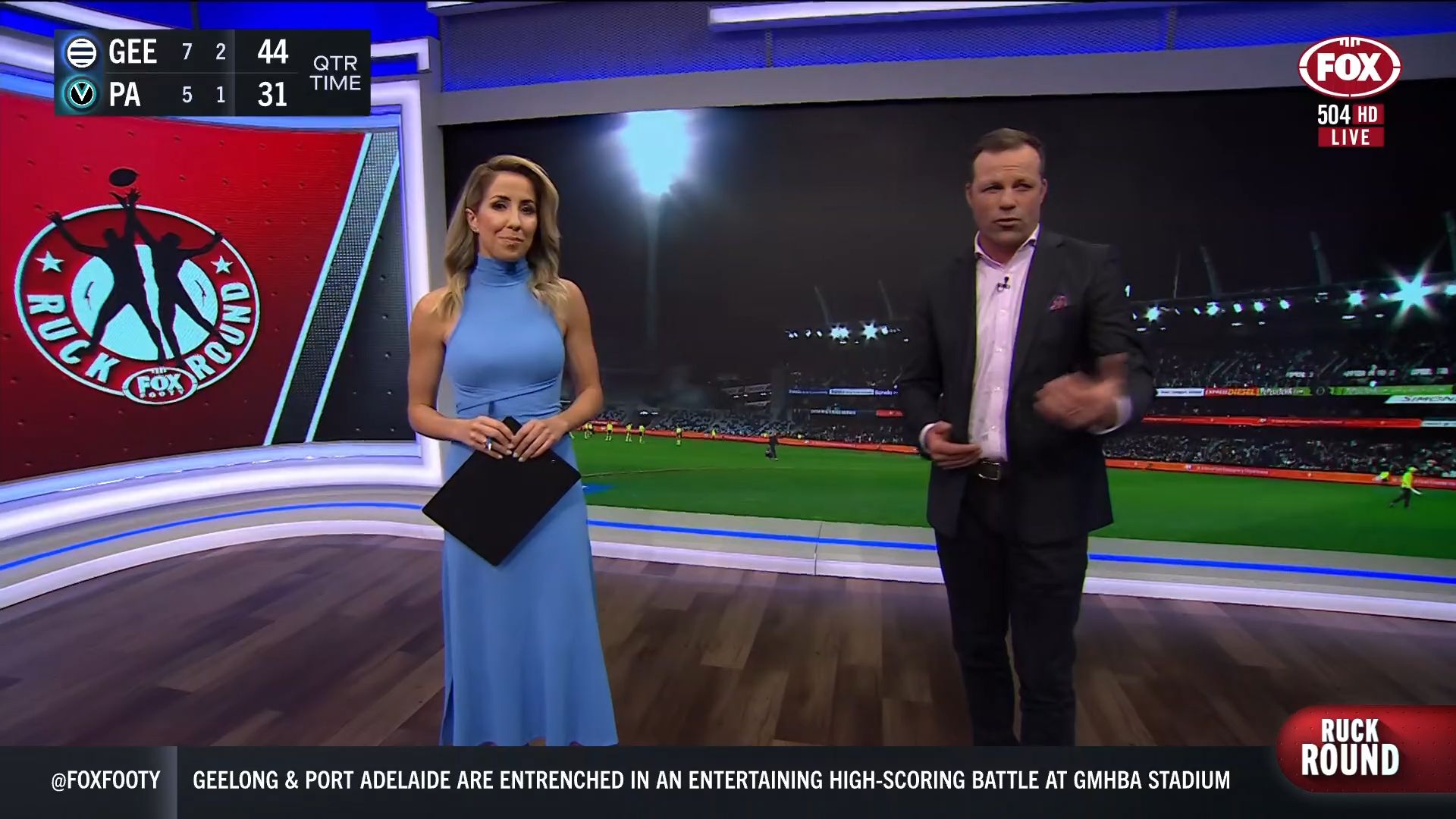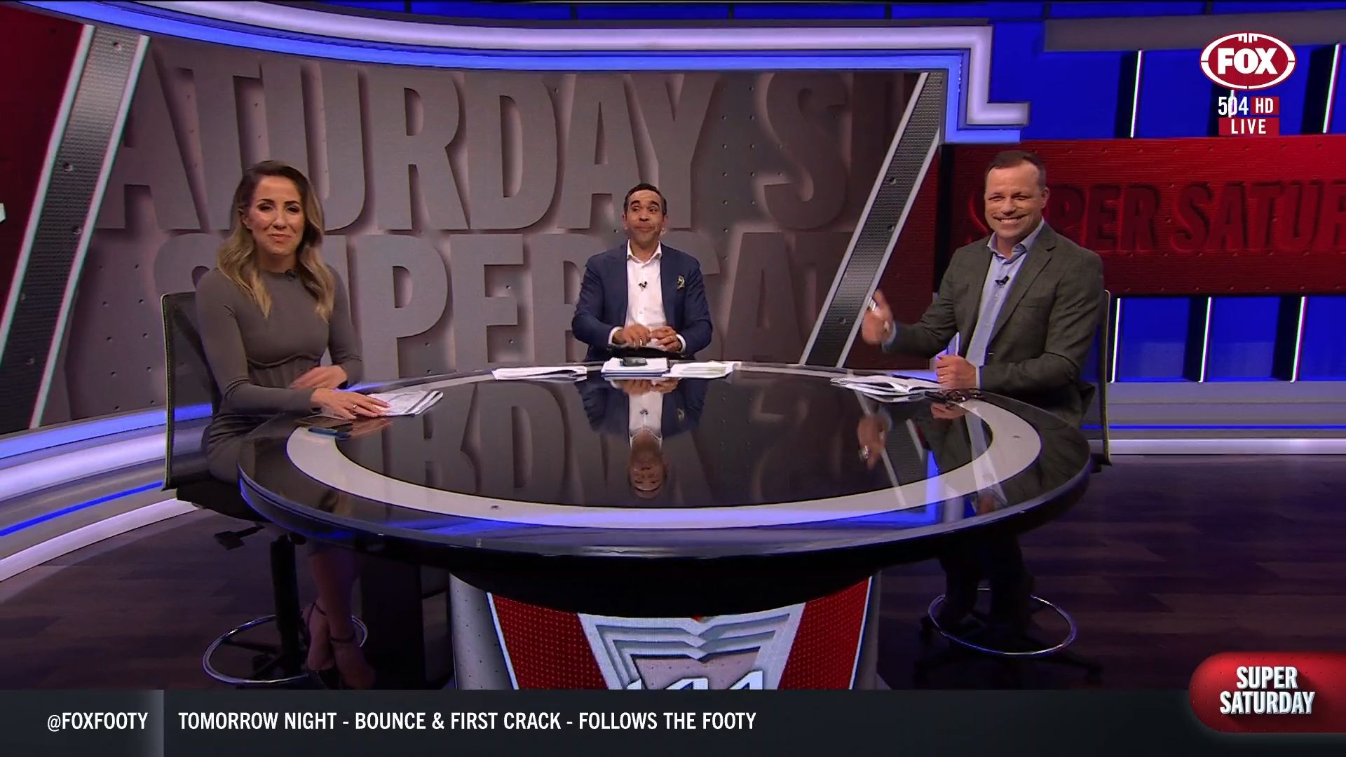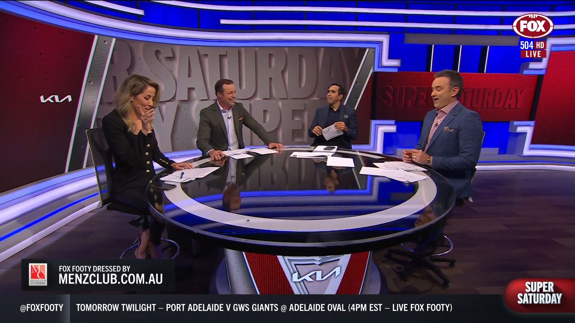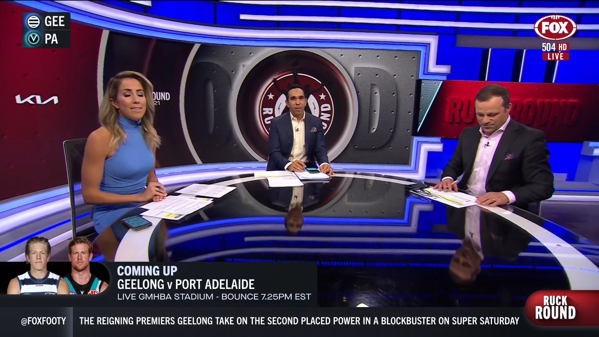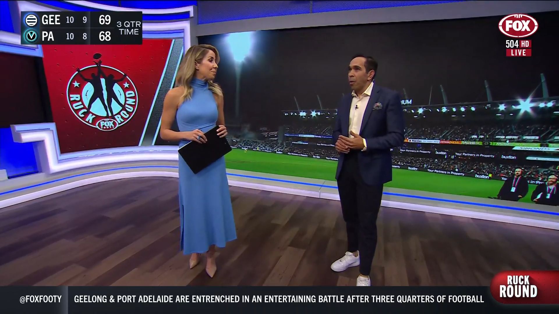 Kath looking great in a leather skirt on Fox Footy!