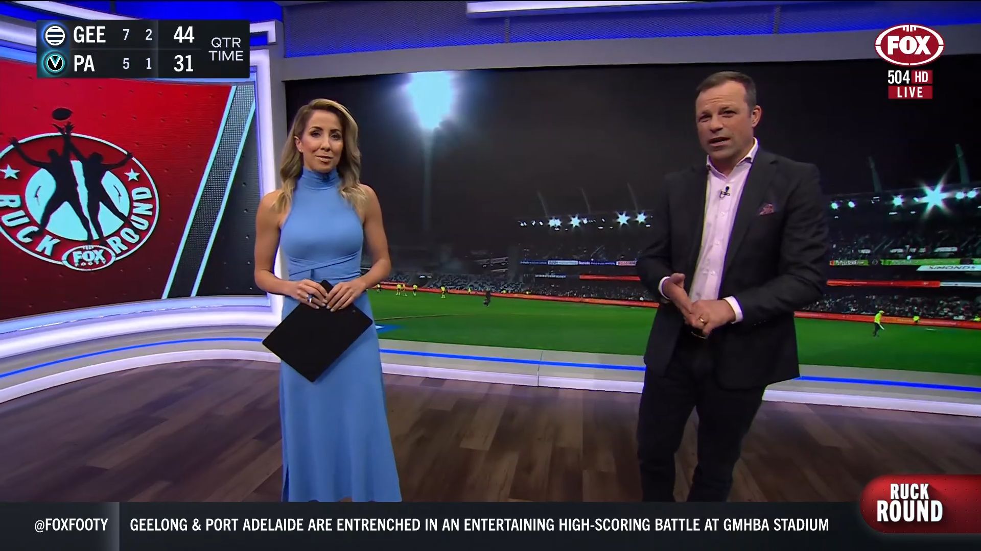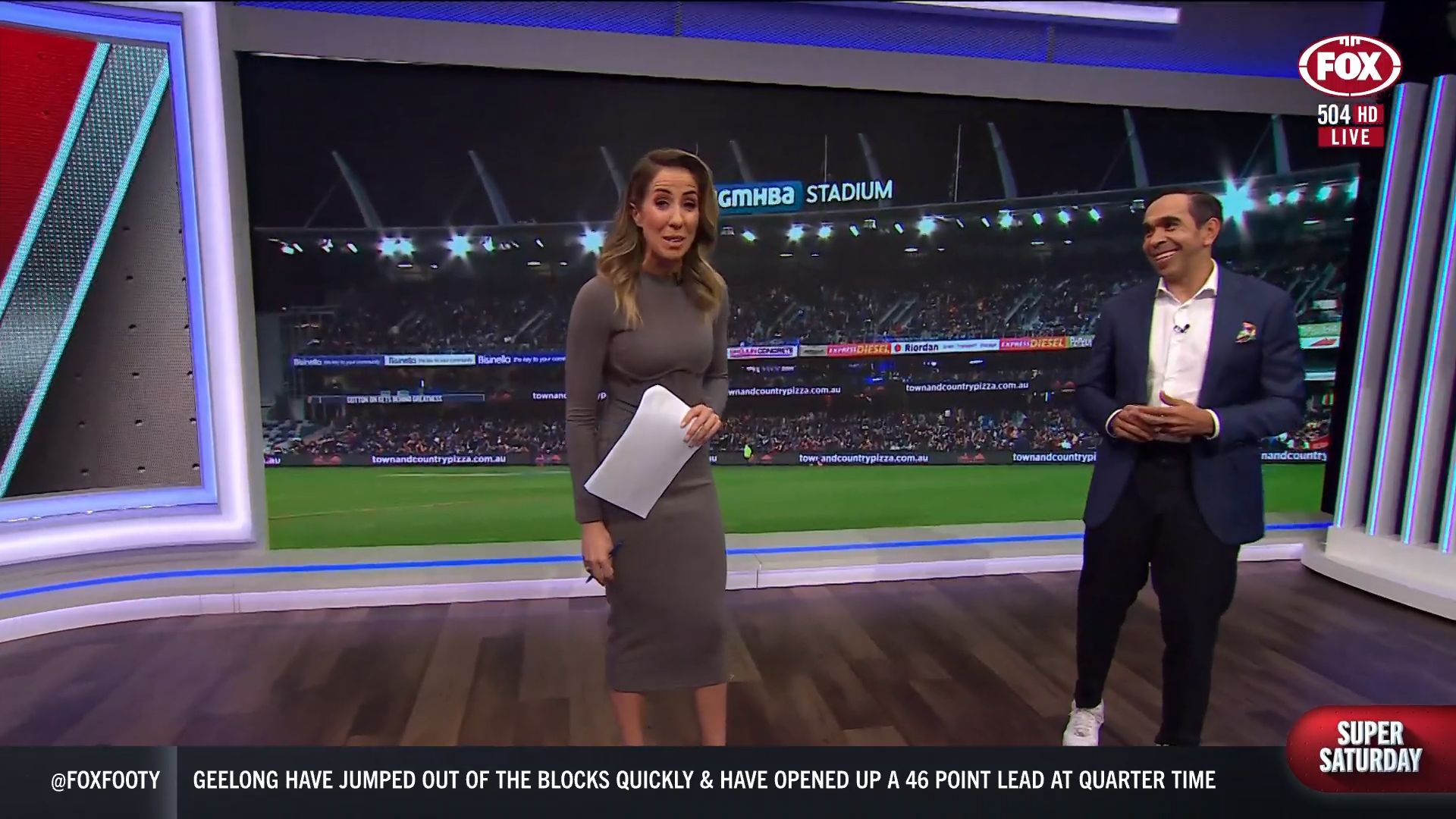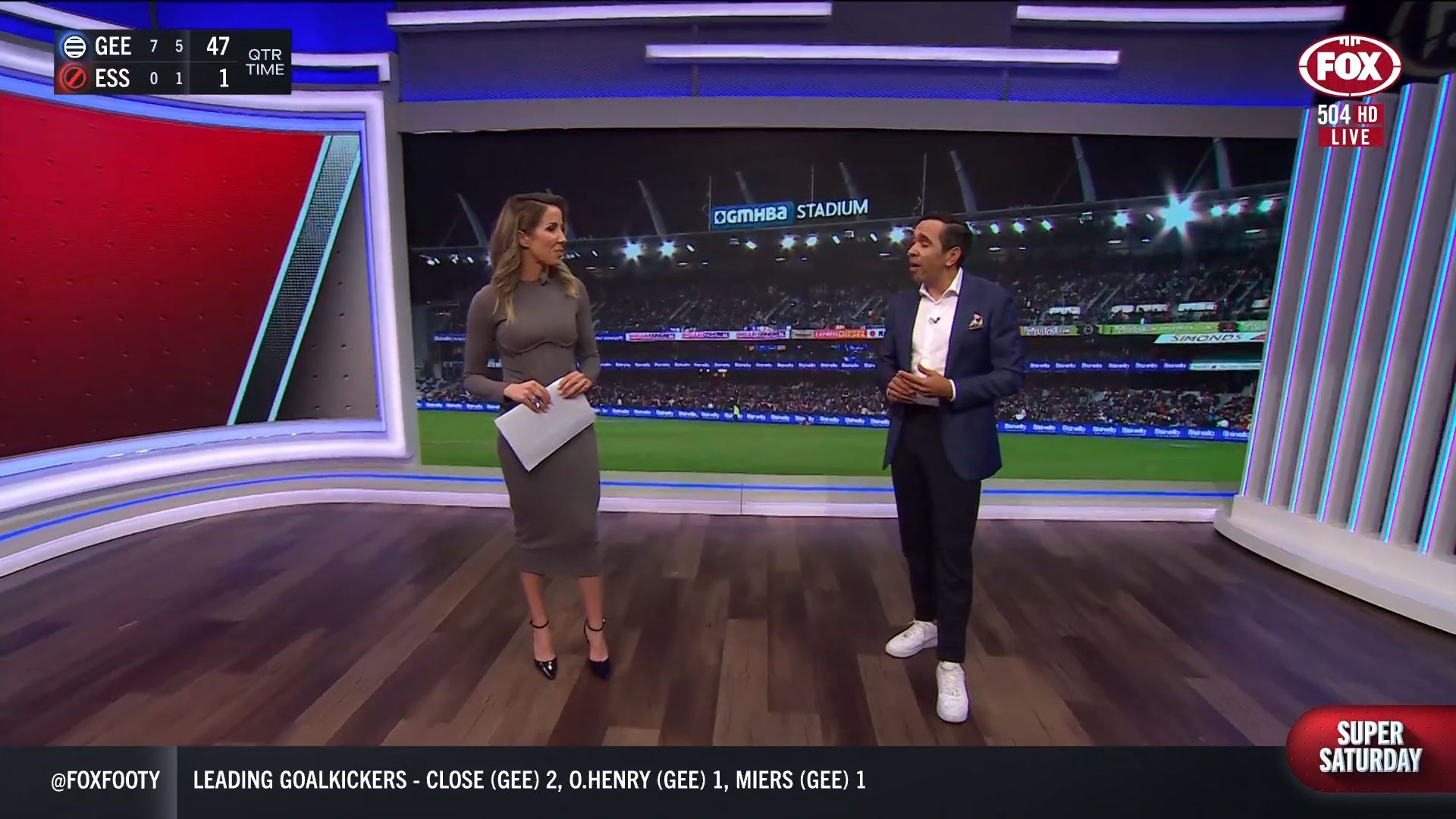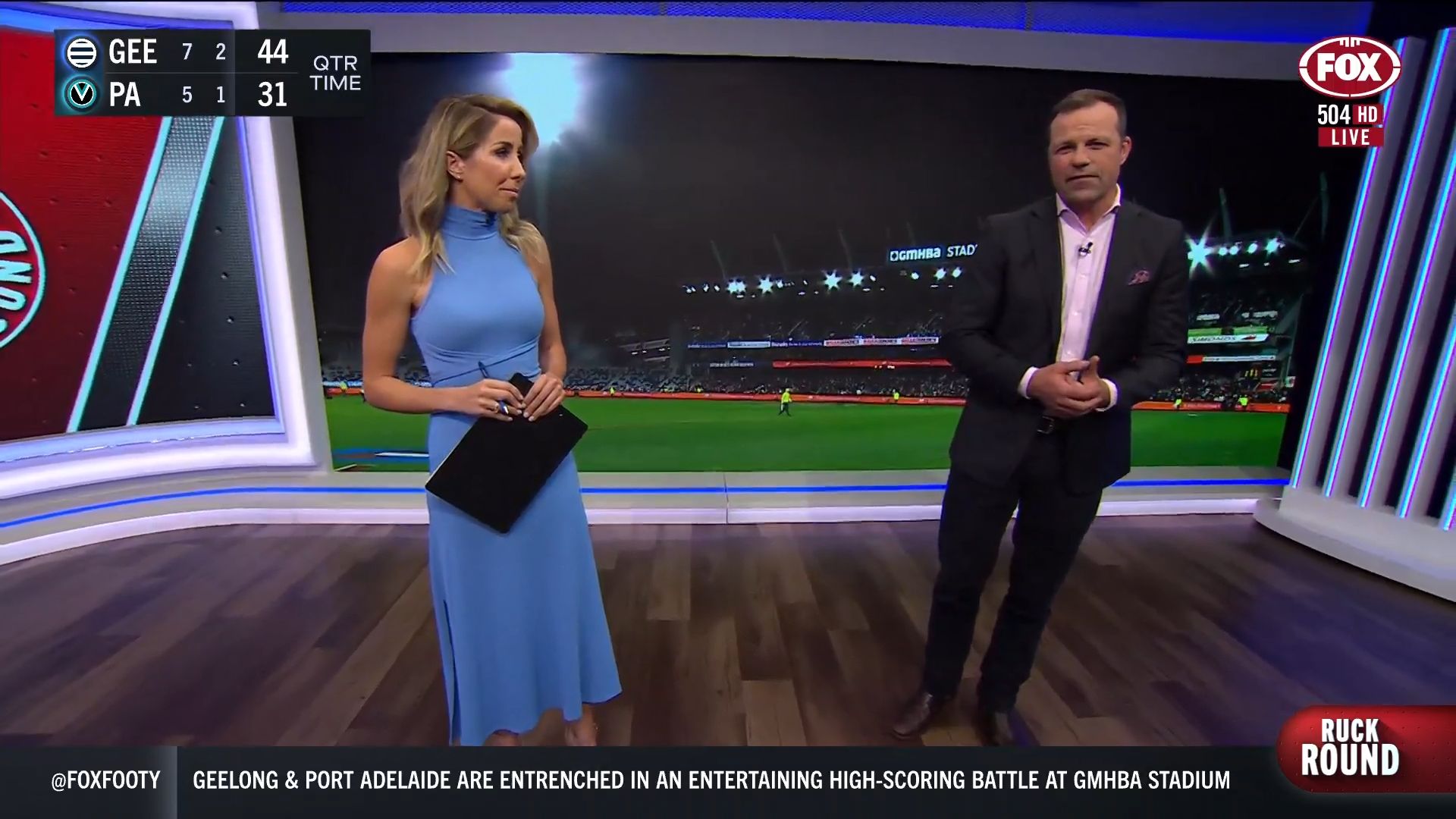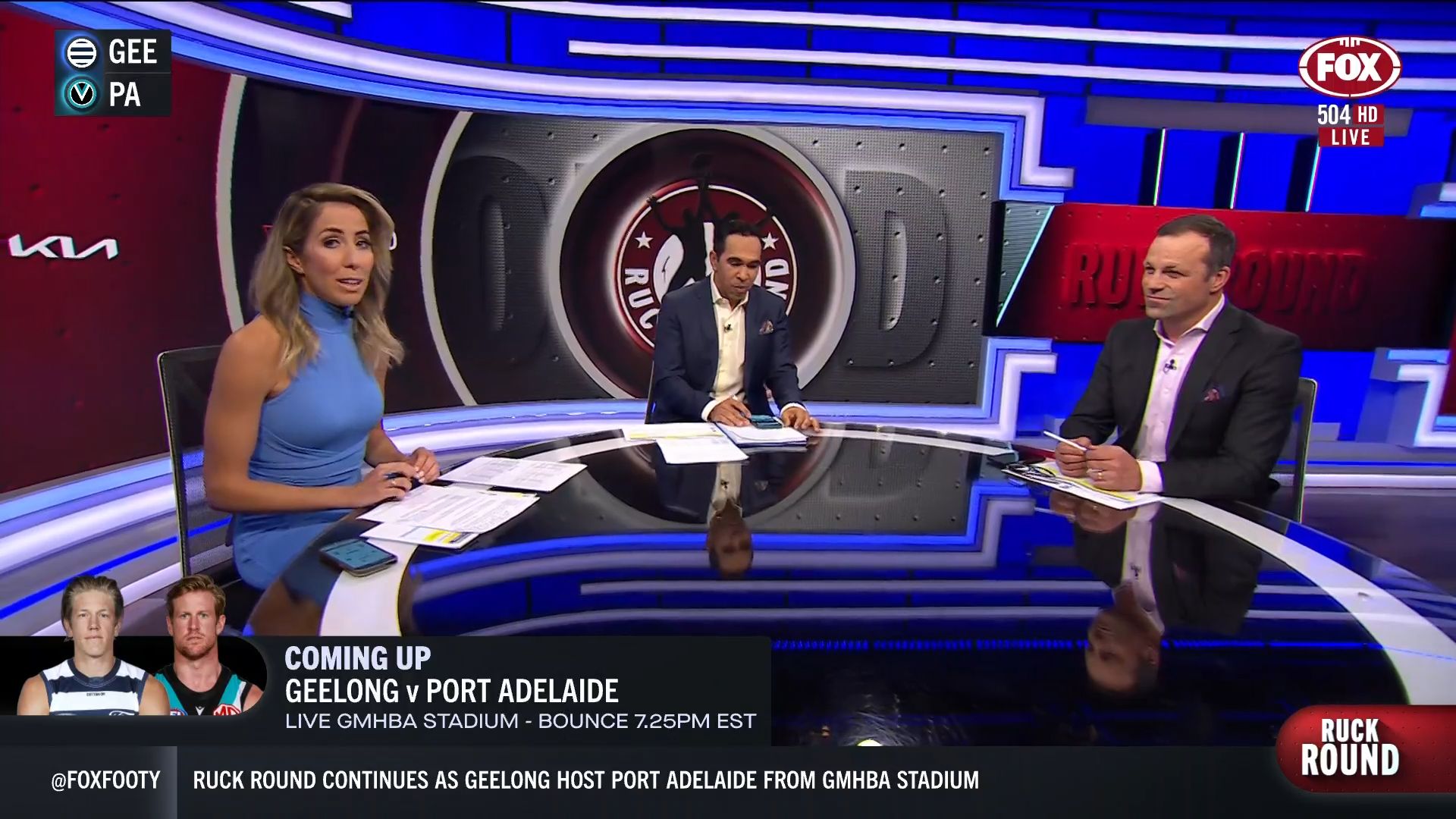 Kath looking great in a leather skirt on Fox Footy!