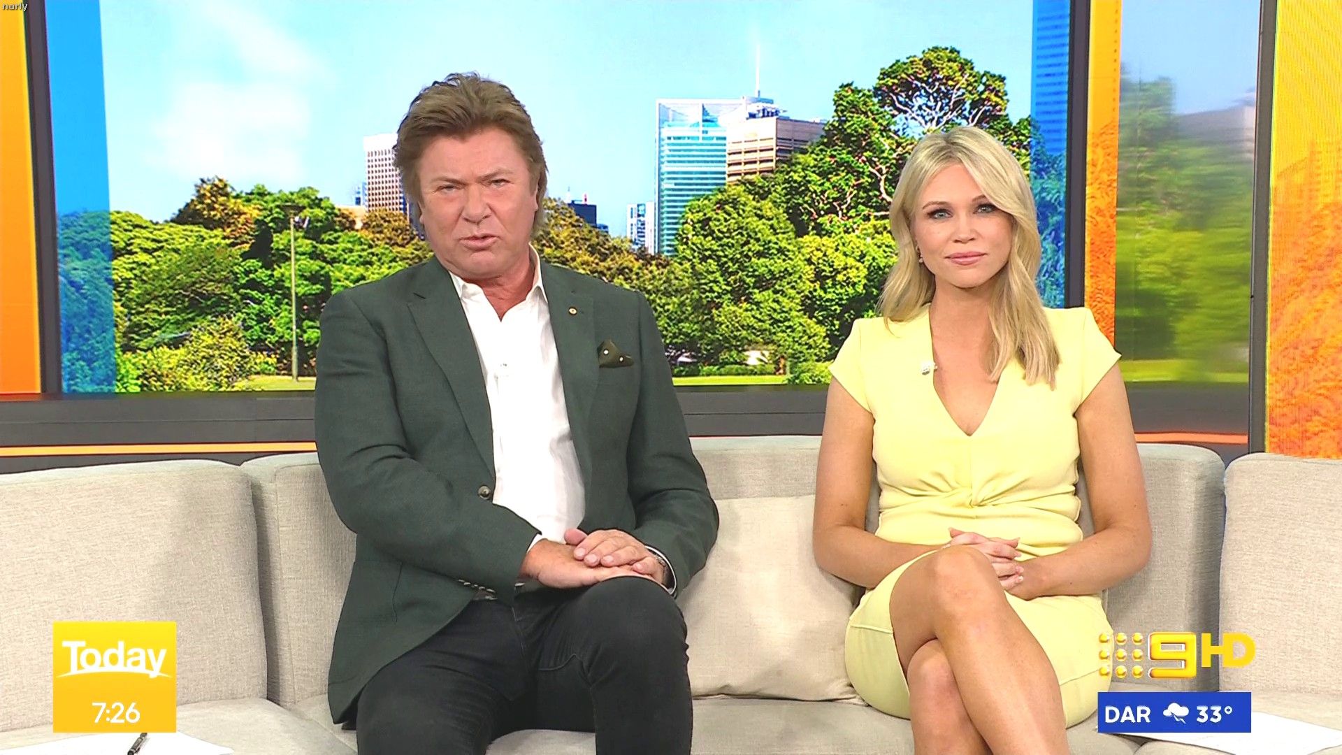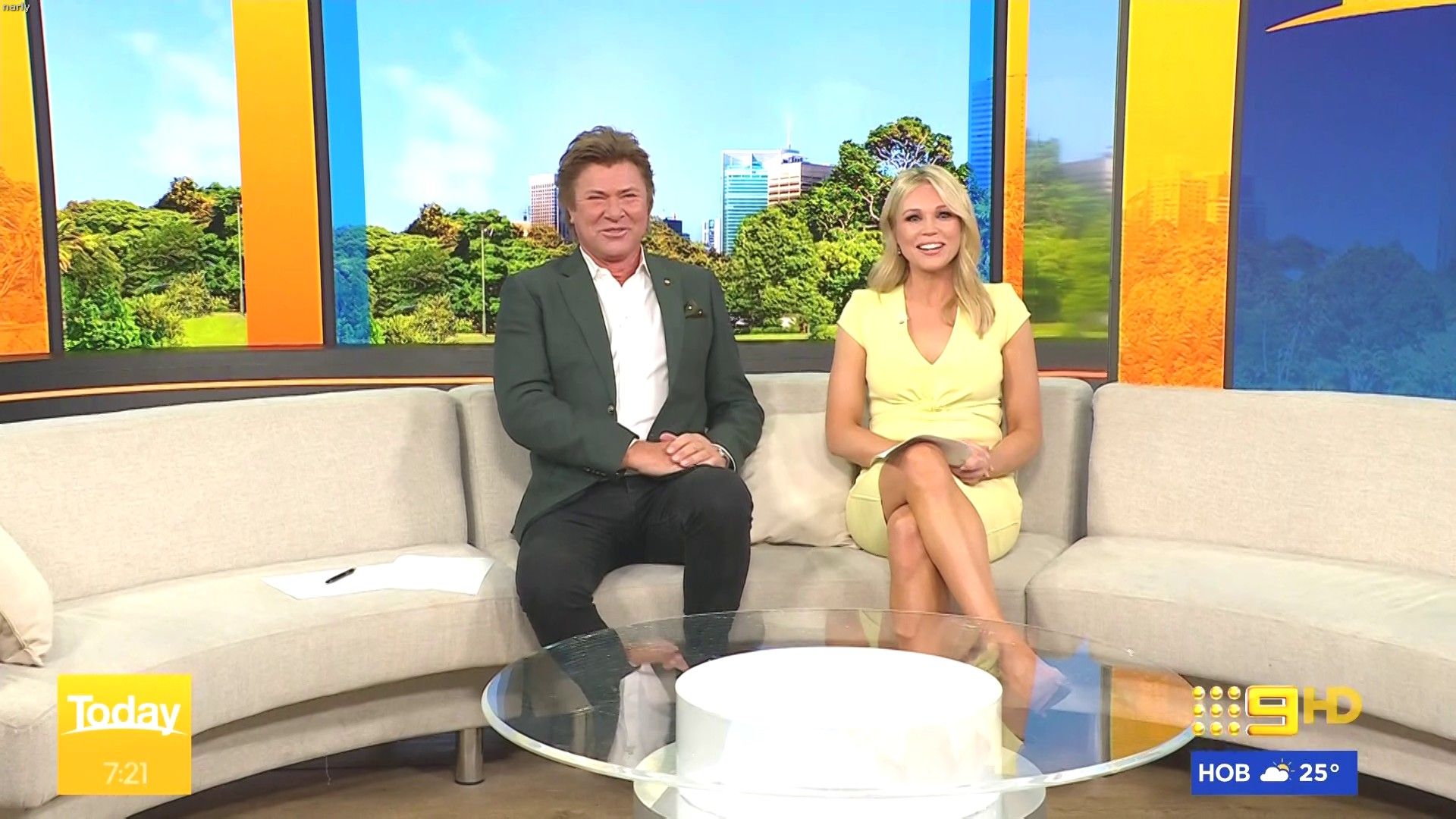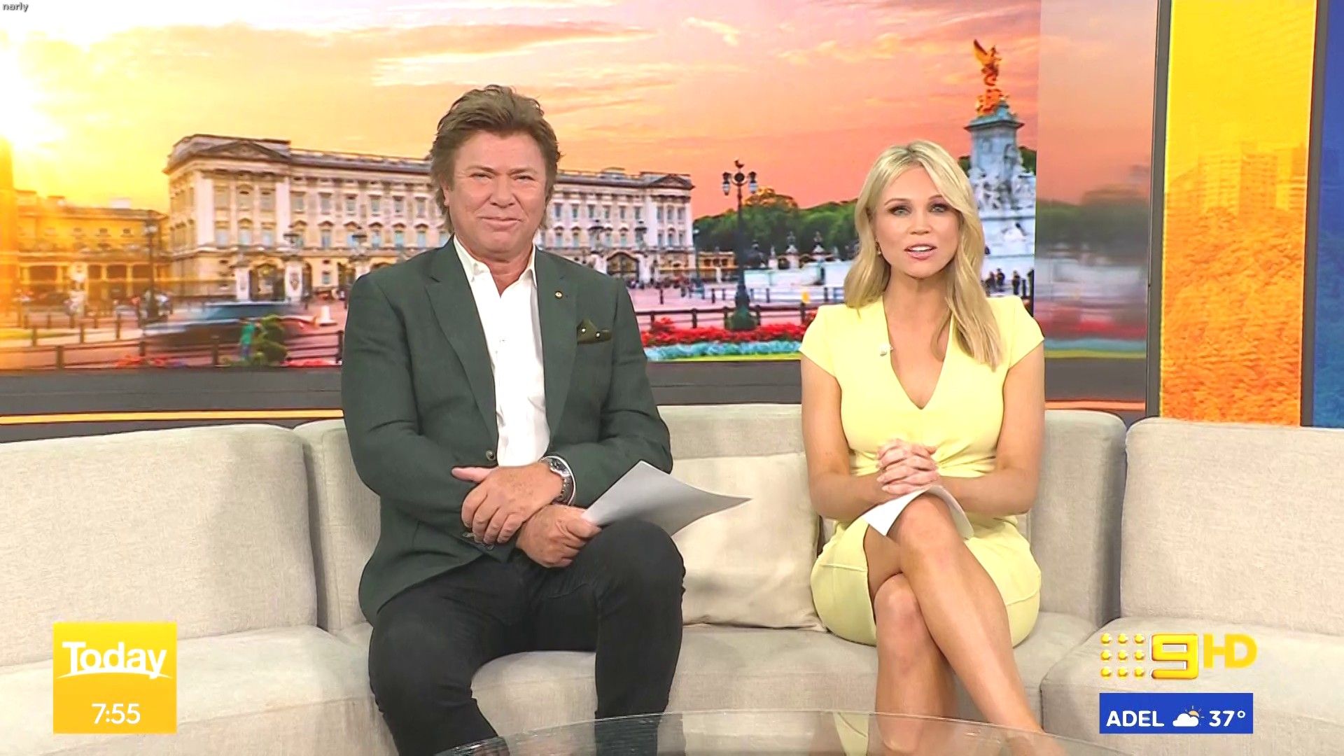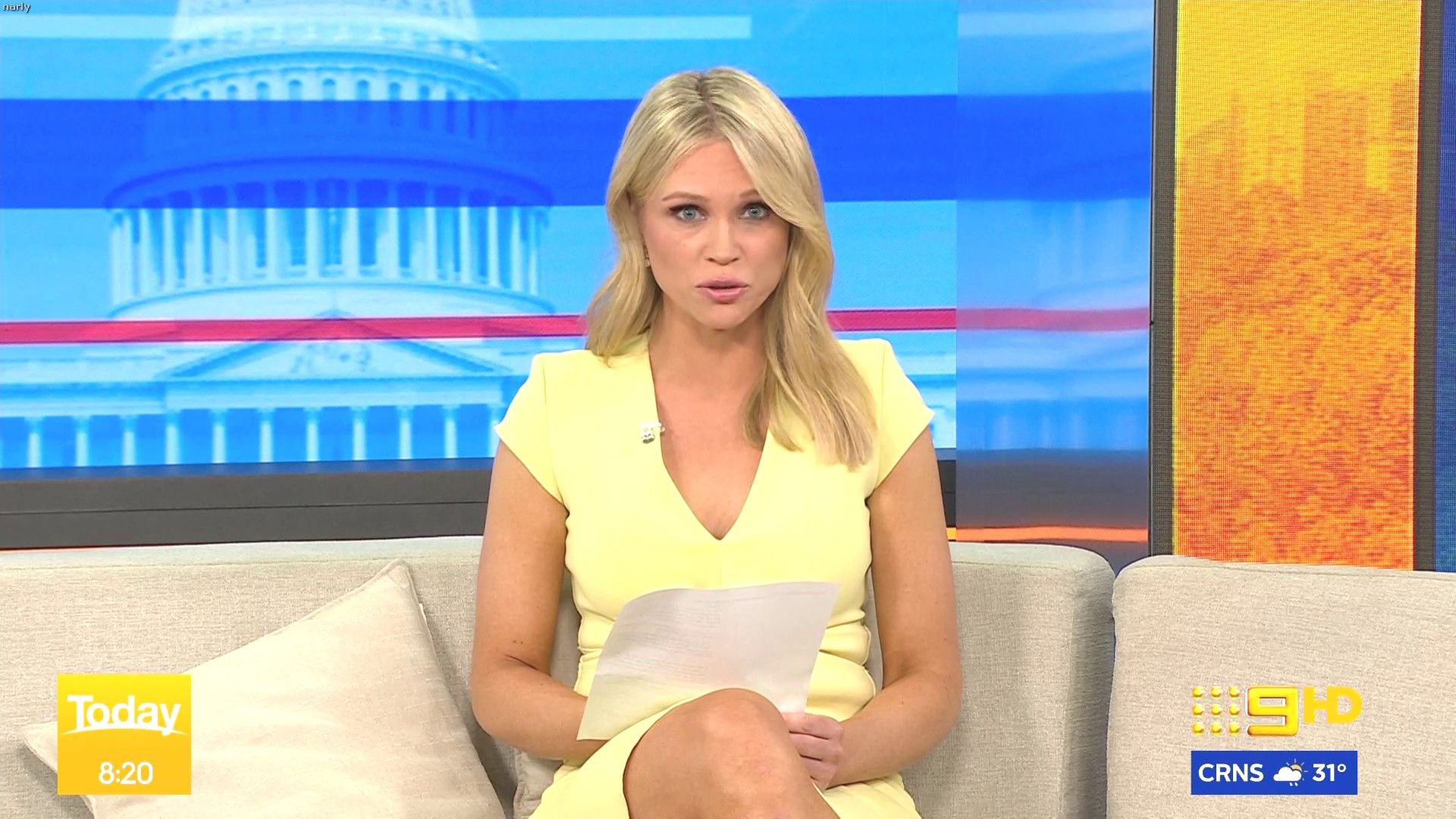 Stunning on weekend today hosting this morning. Nice split in the skirt when on the couch.