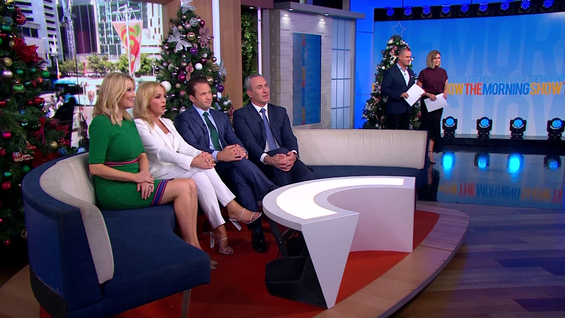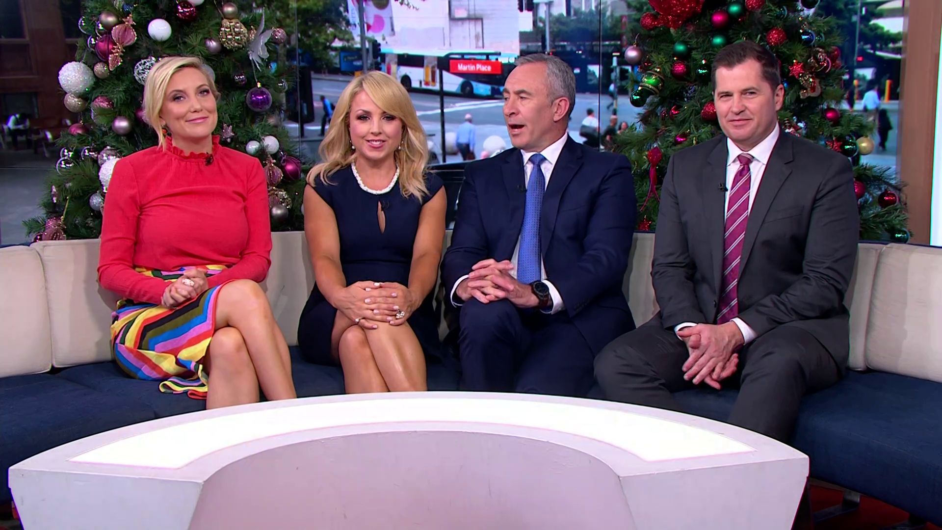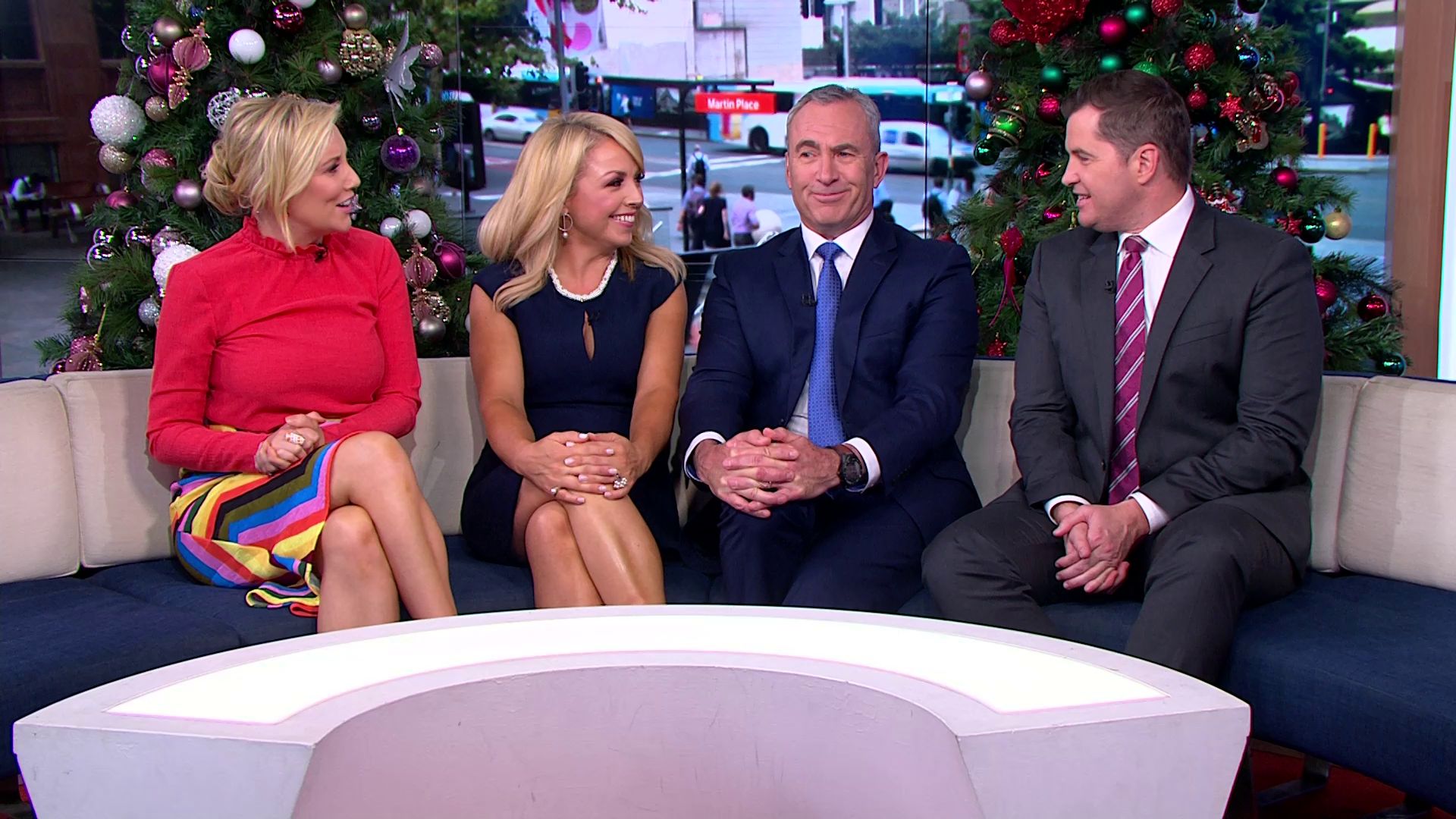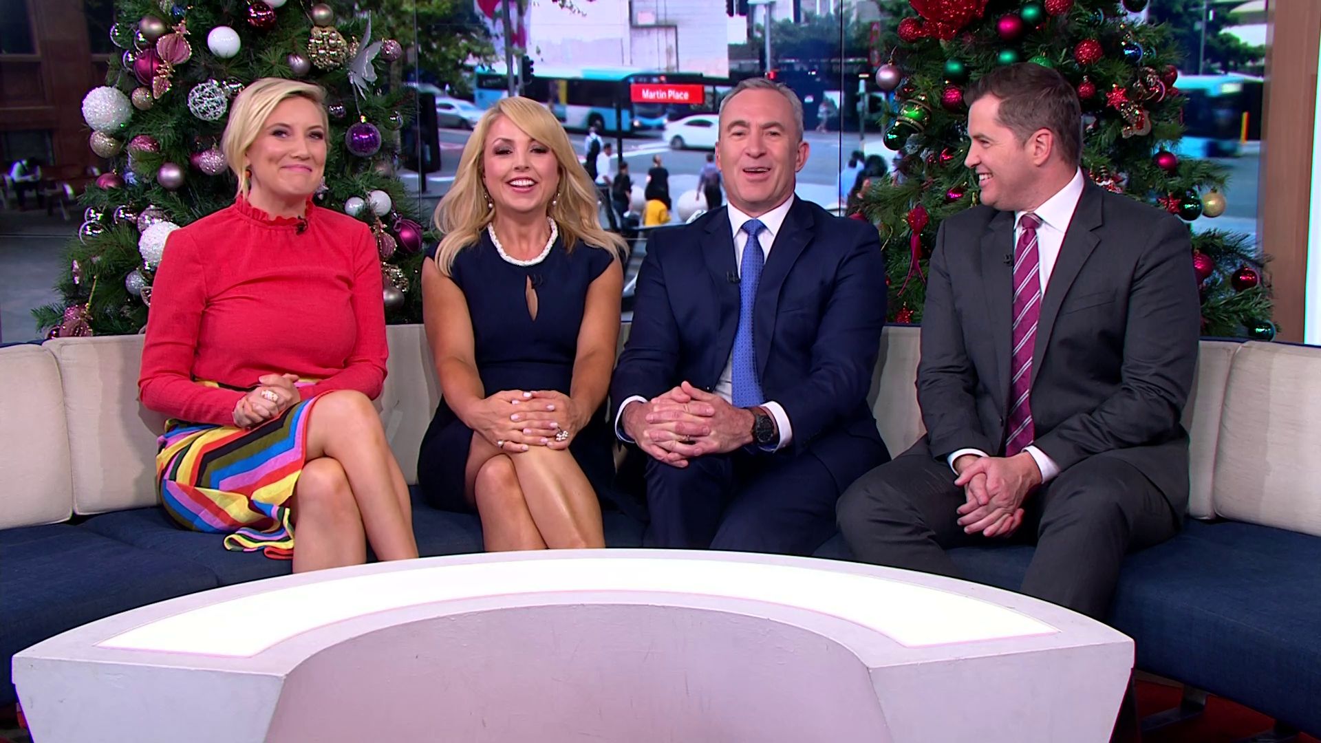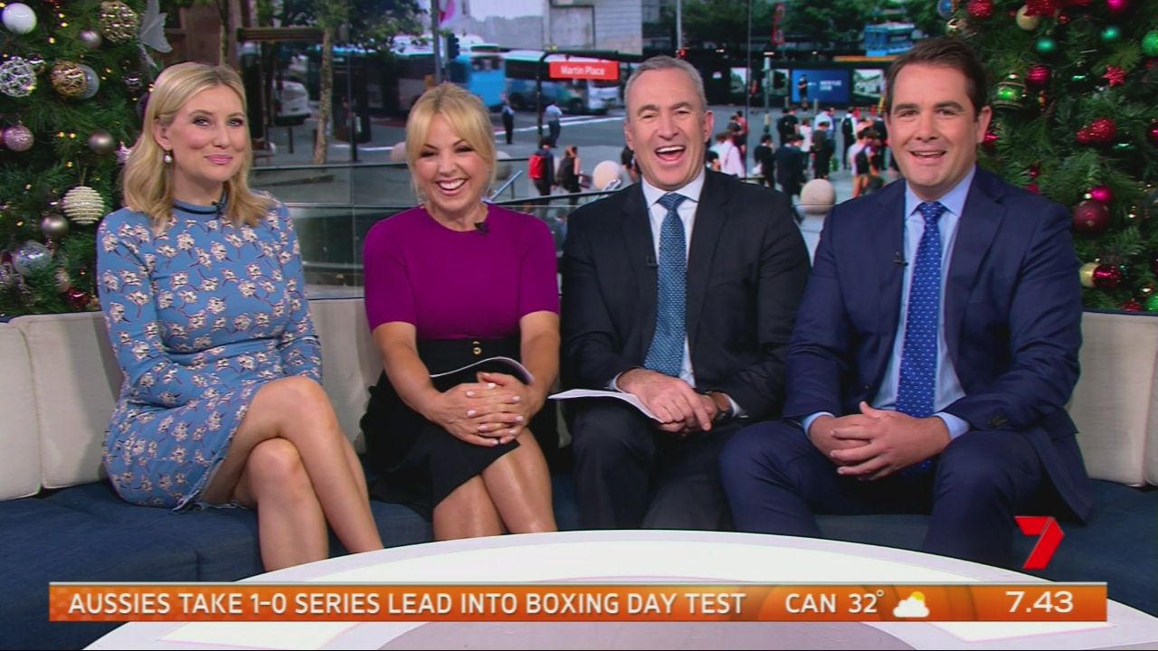 At 7:42 on the couch showing heaps of thigh the the camera left cams back and dress pulled down to cover the exposure. Very nice