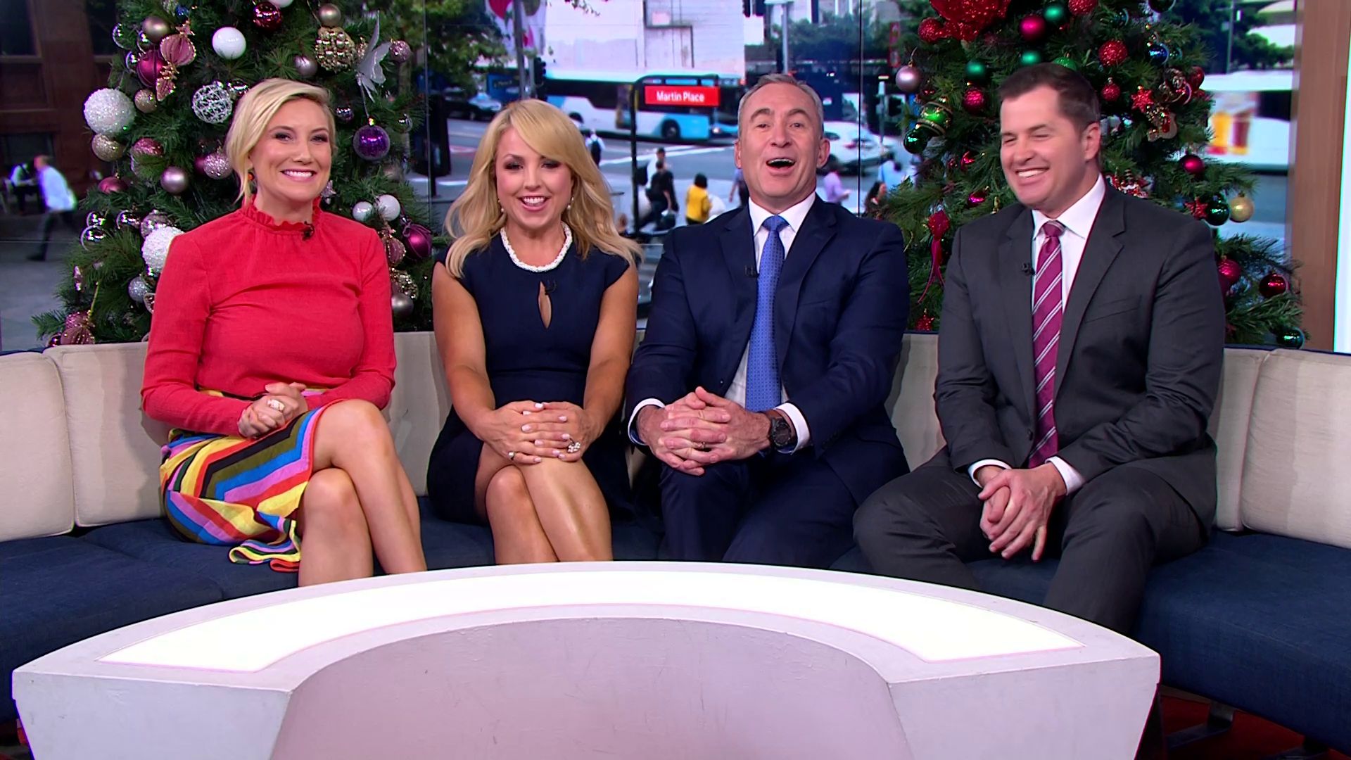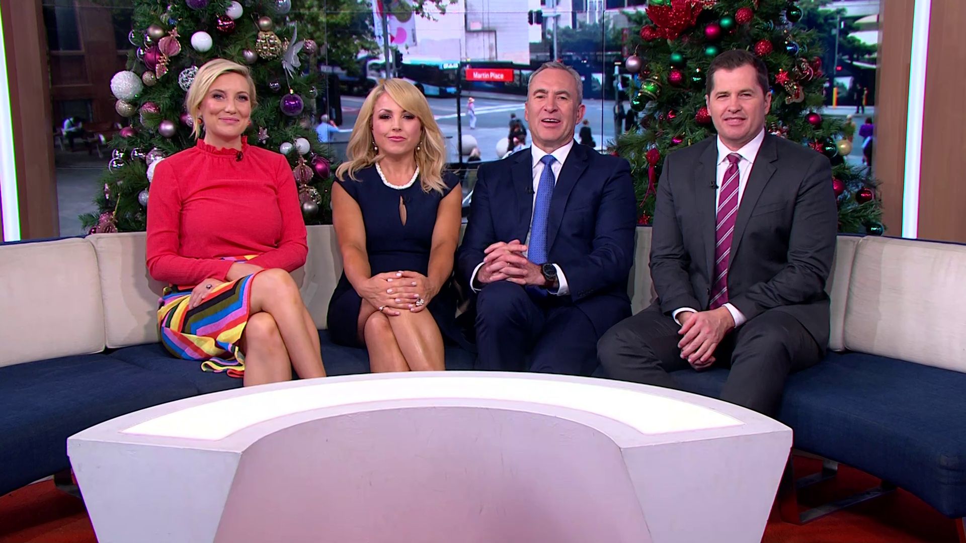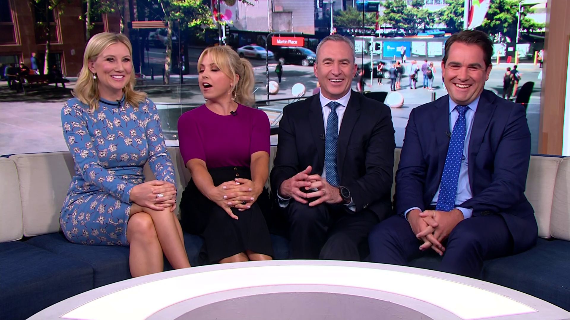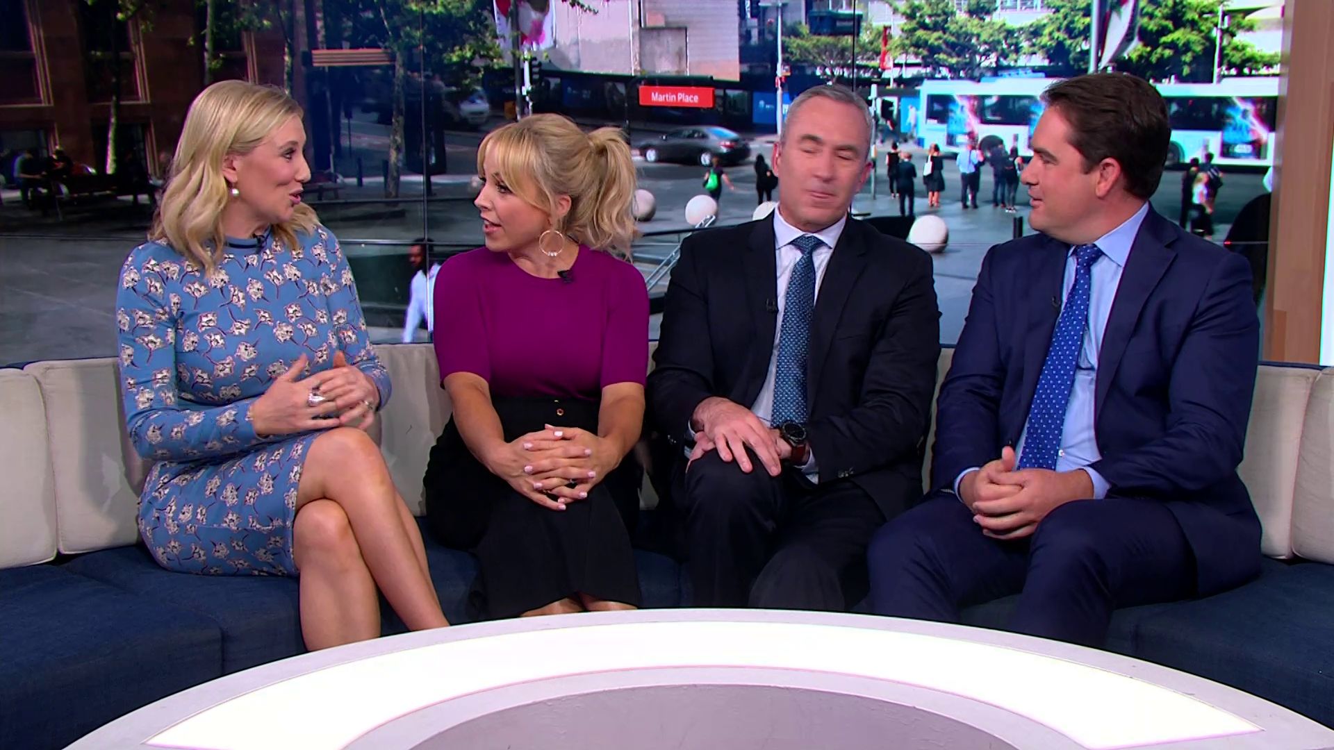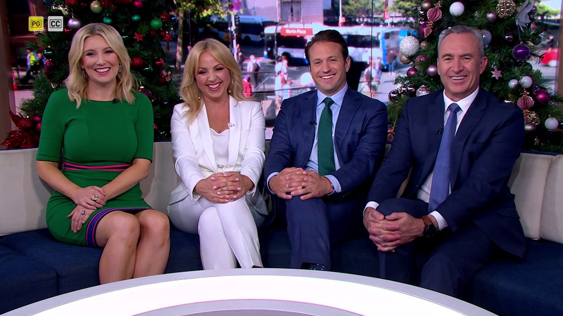 At 7:42 on the couch showing heaps of thigh the the camera left cams back and dress pulled down to cover the exposure. Very nice
