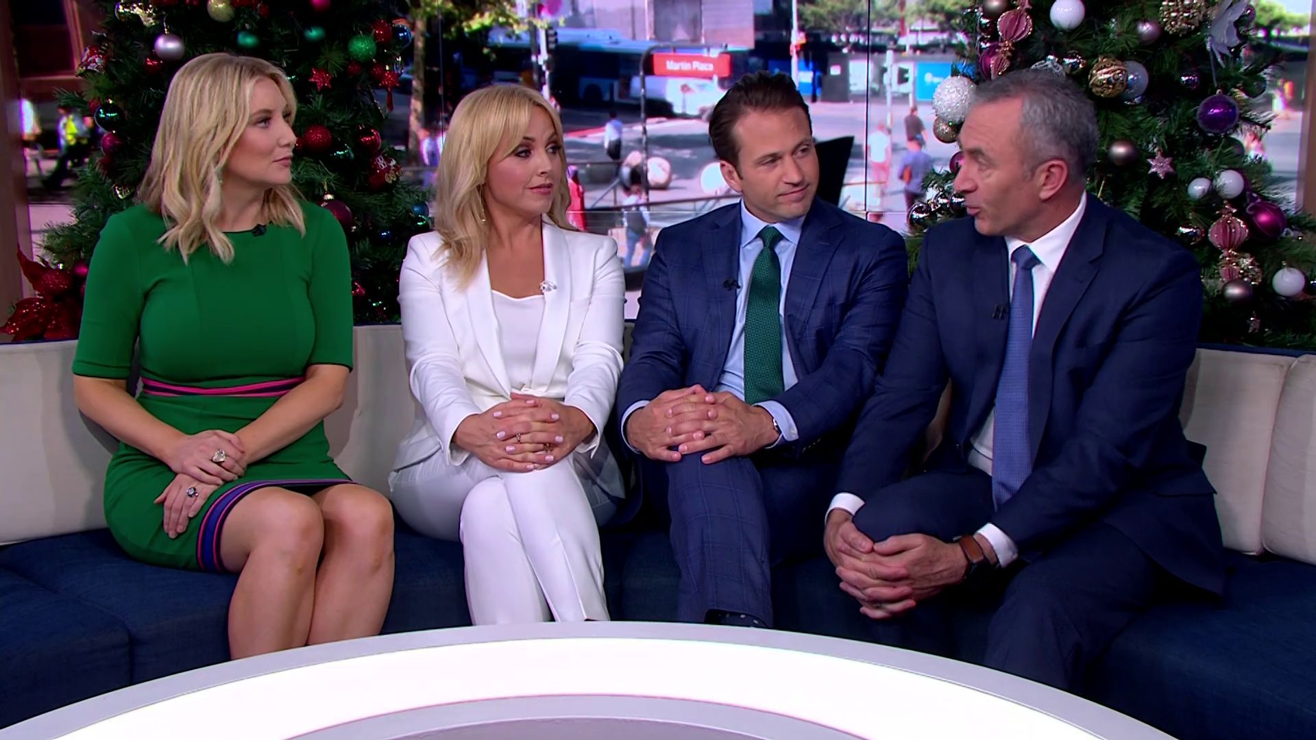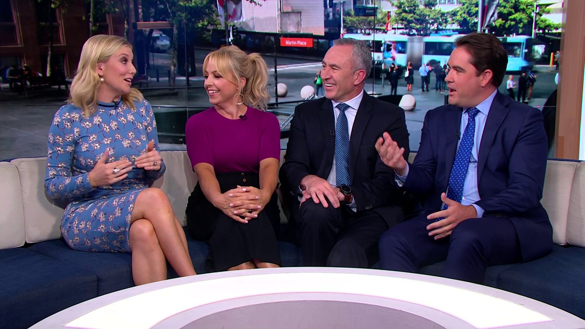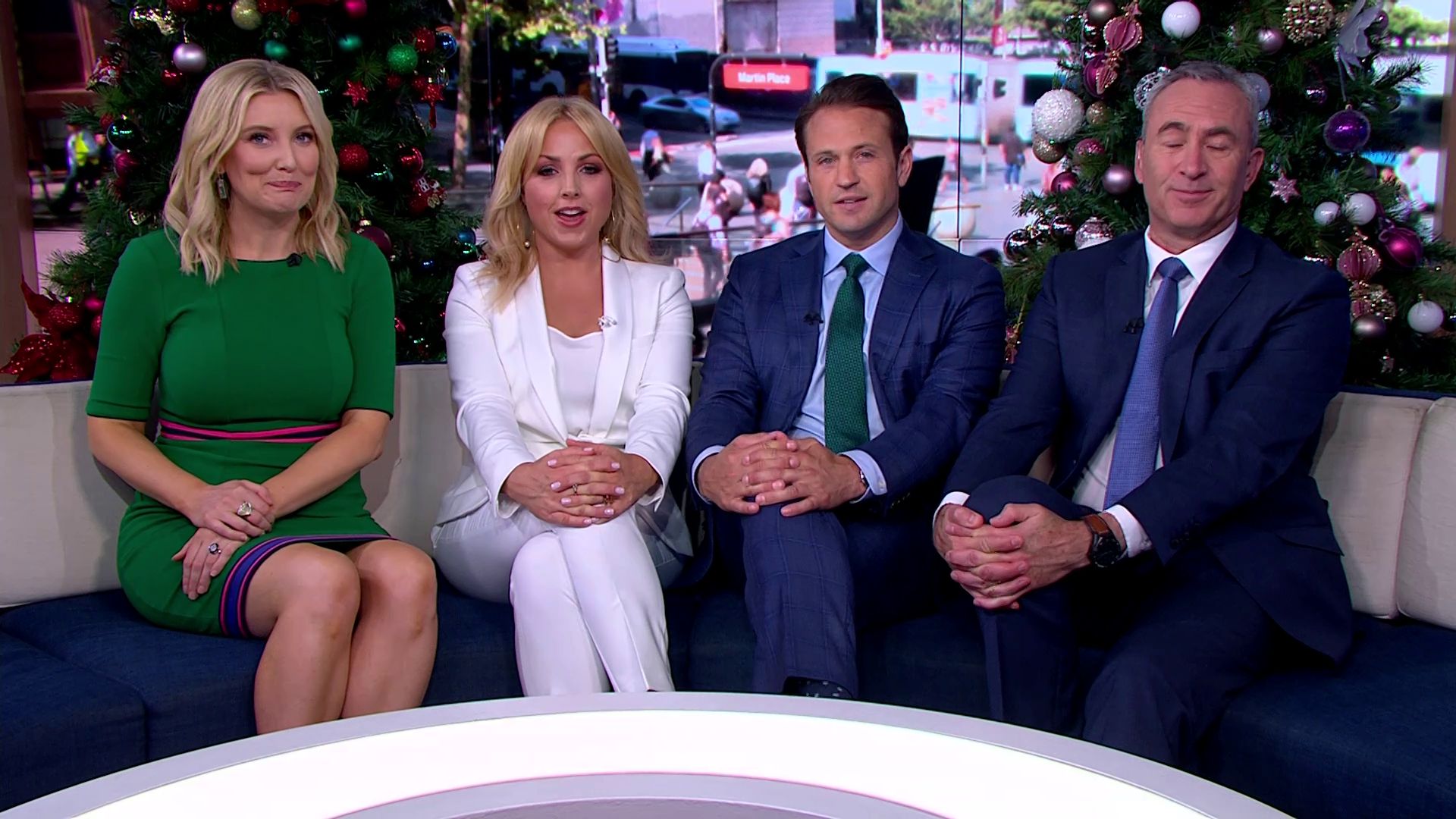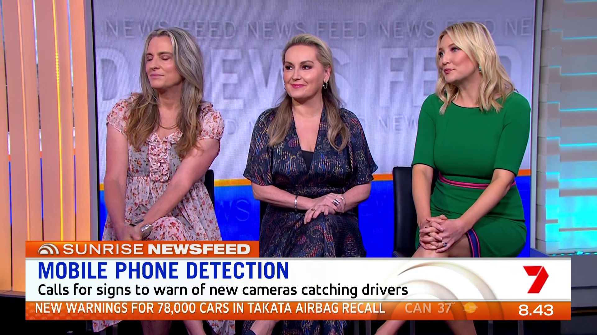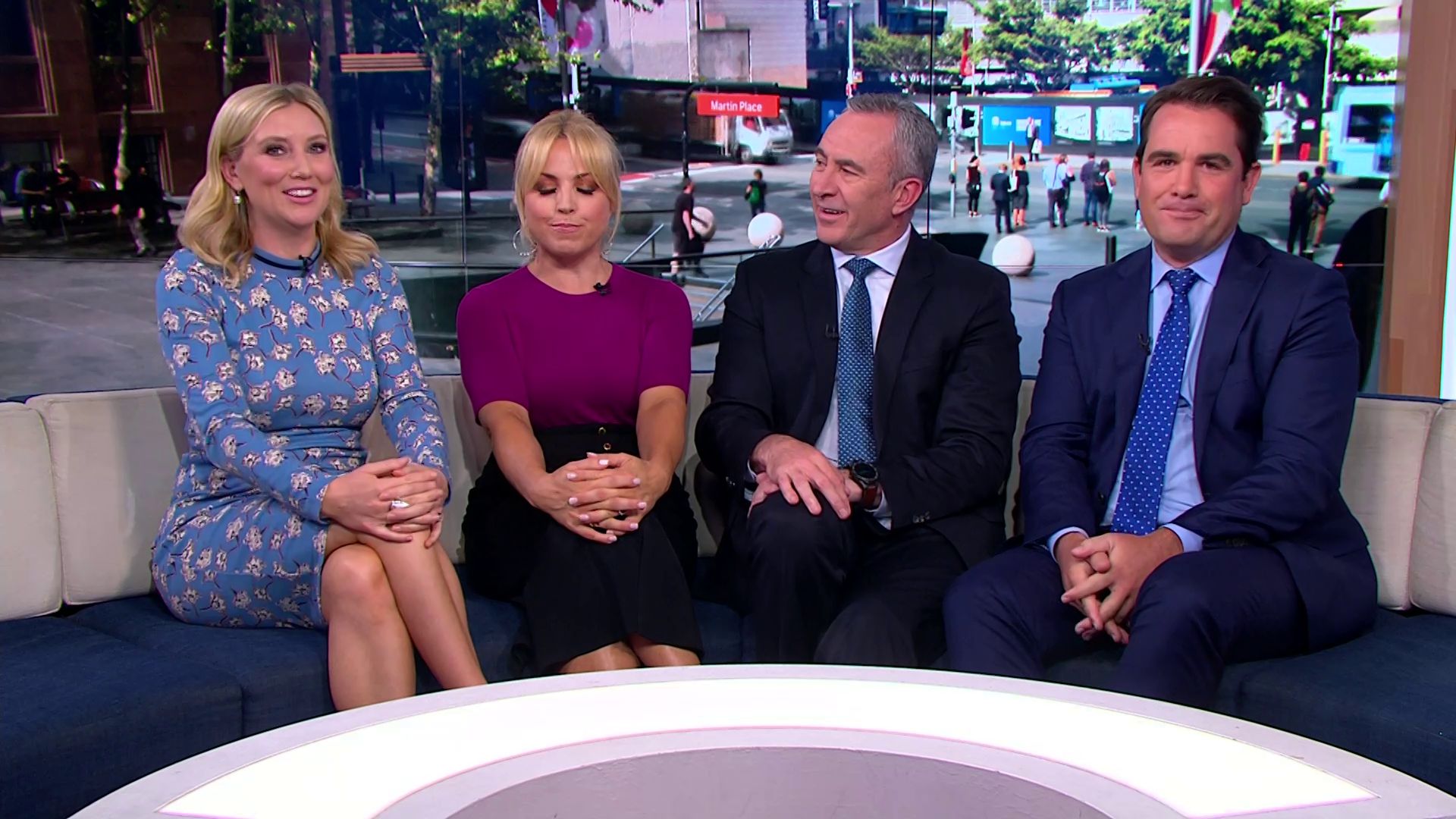 At 7:42 on the couch showing heaps of thigh the the camera left cams back and dress pulled down to cover the exposure. Very nice
