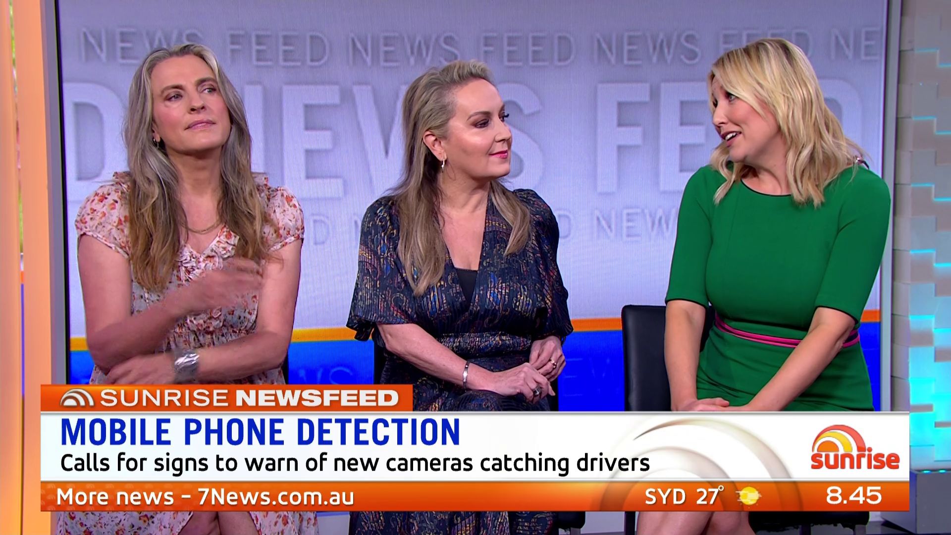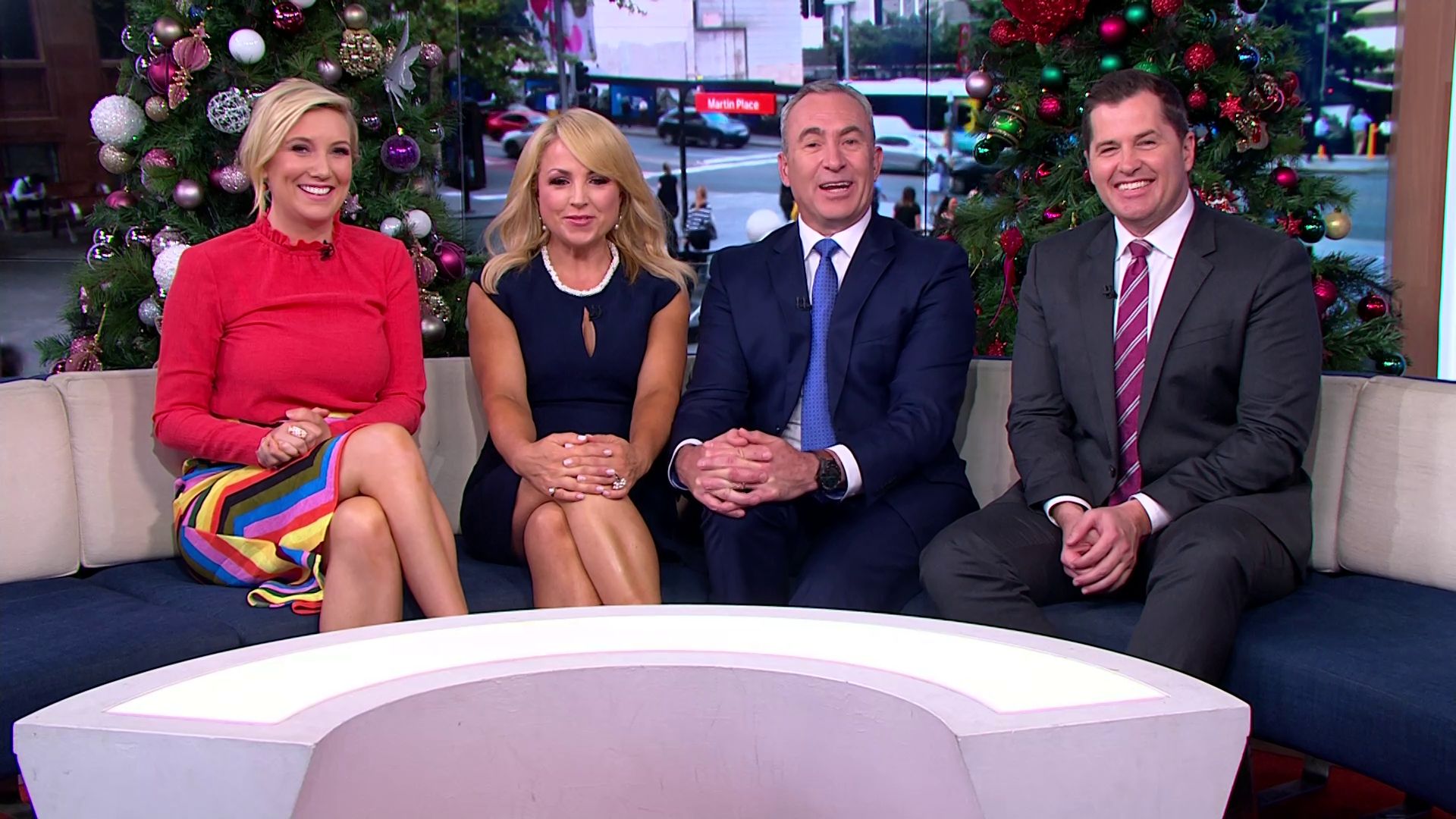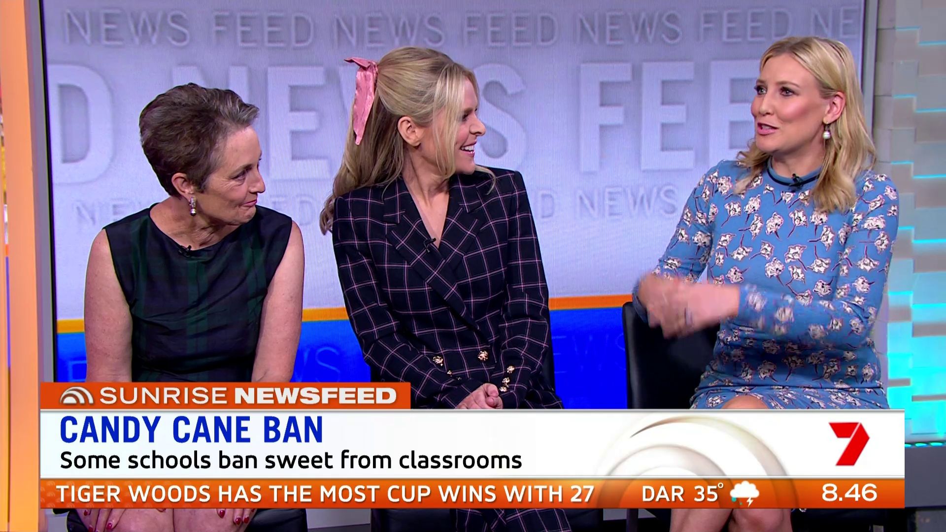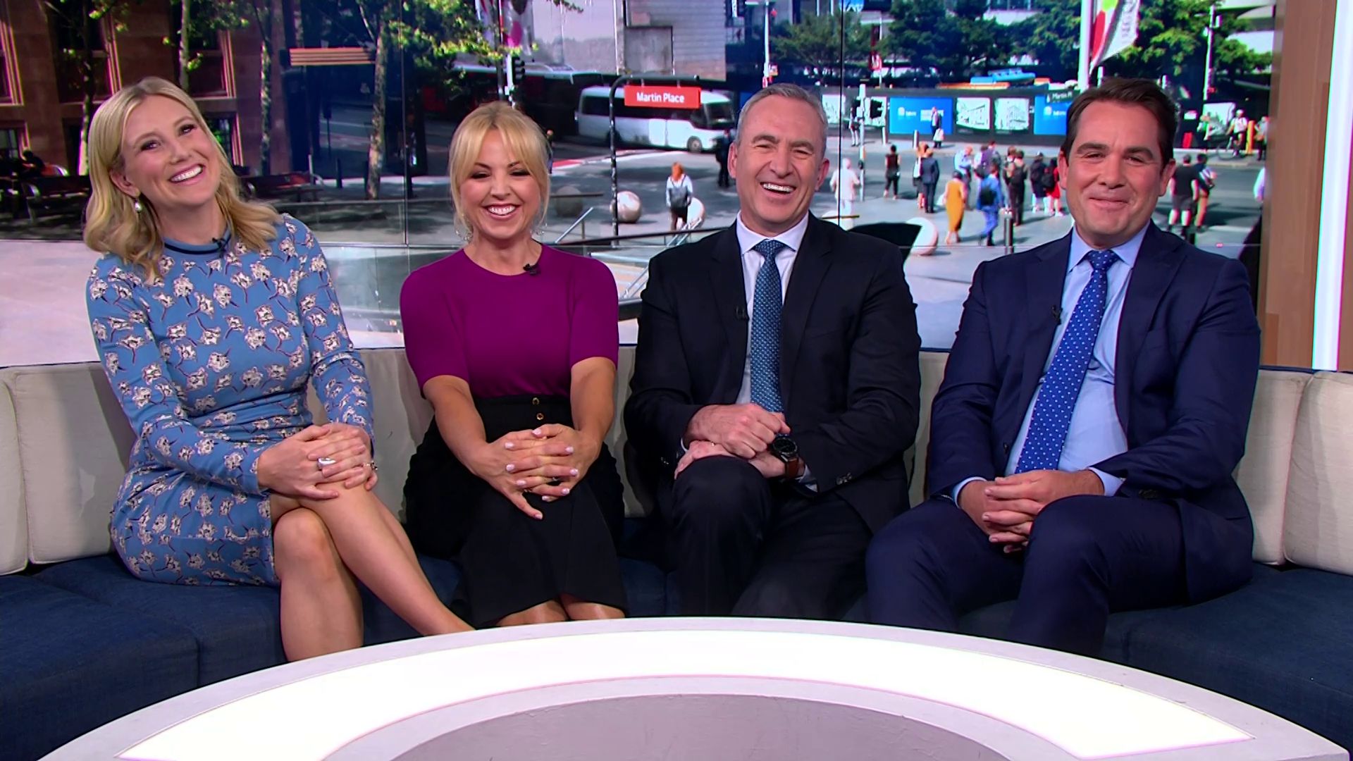 At 7:42 on the couch showing heaps of thigh the the camera left cams back and dress pulled down to cover the exposure. Very nice