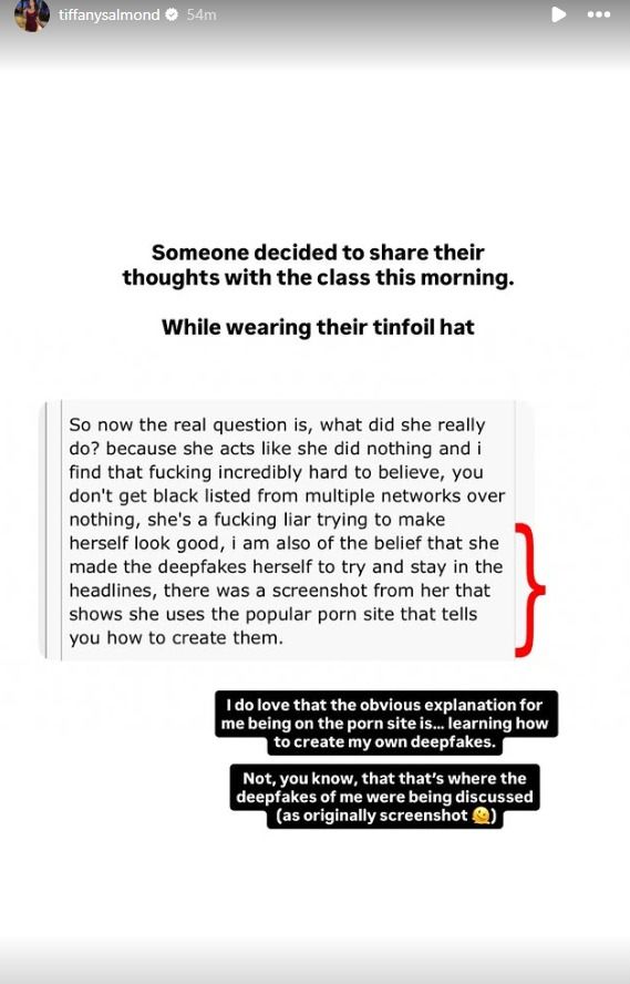 She's full of shit, the only mention of deepfake on that site was someone asking if they knew where they could find them LITERALLY after she posted about it on instagram and someone literally replied to the guy saying she probably made them herself, so yeah the deepfakes were never on that site to begin with and she doesn't have a discussion thread on that site either so no discussing was ever involved.