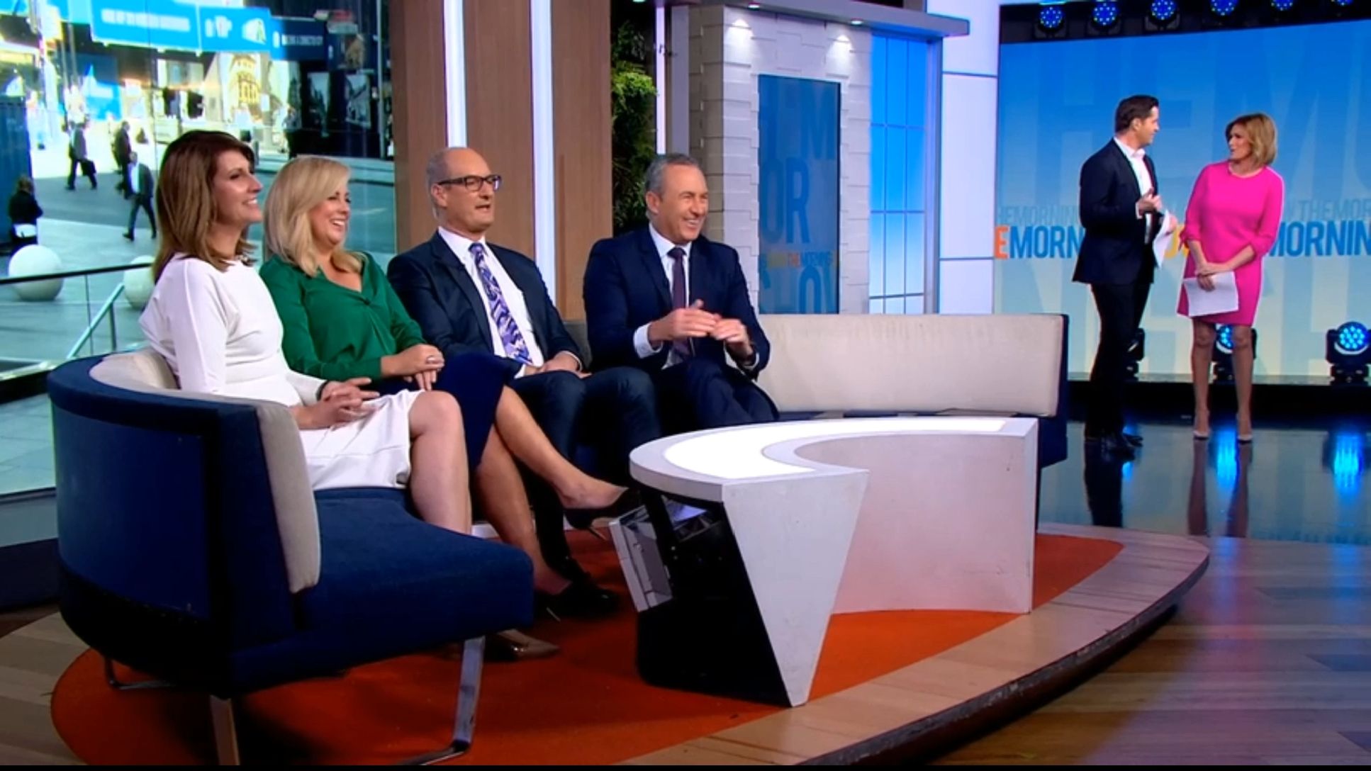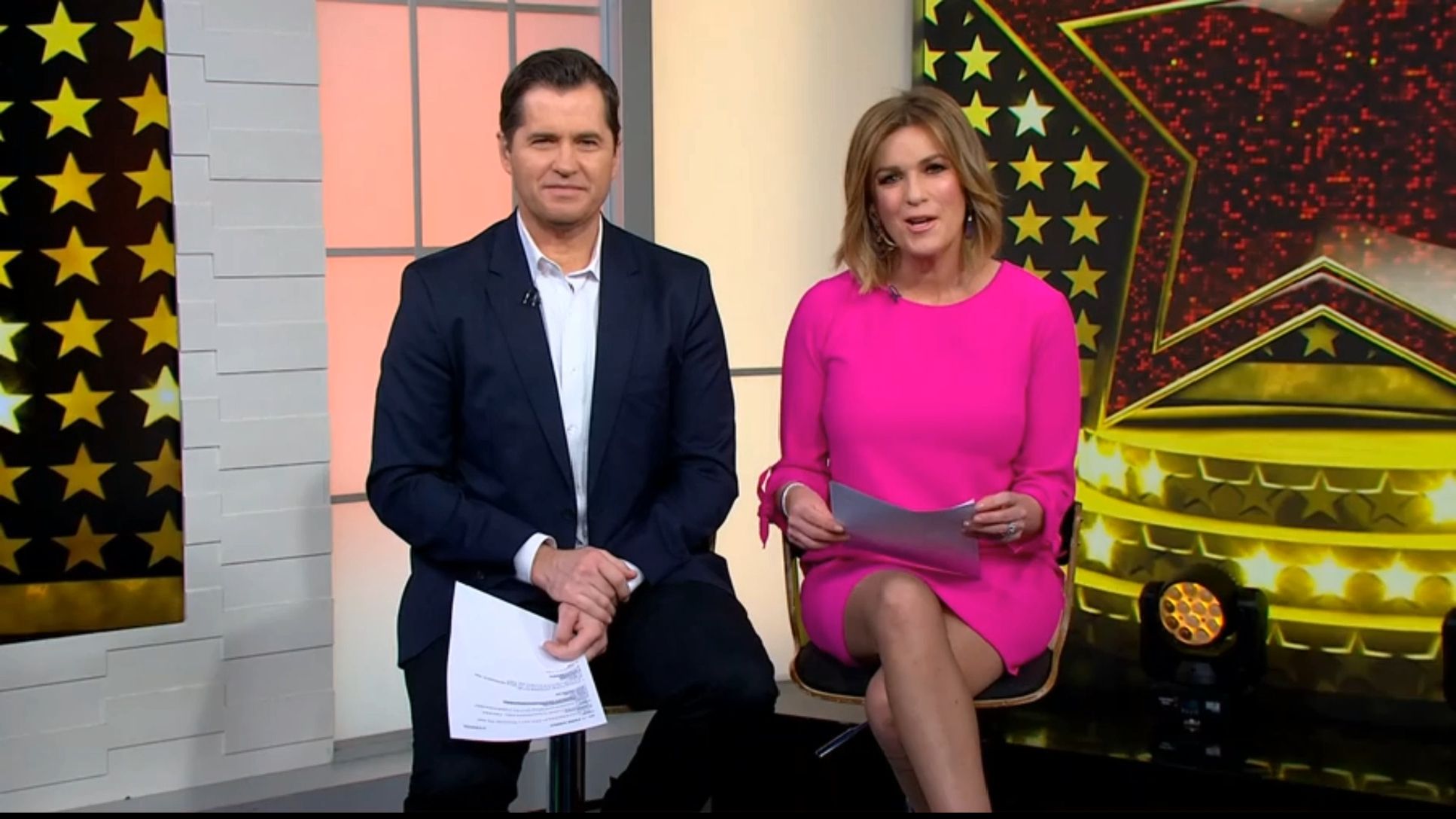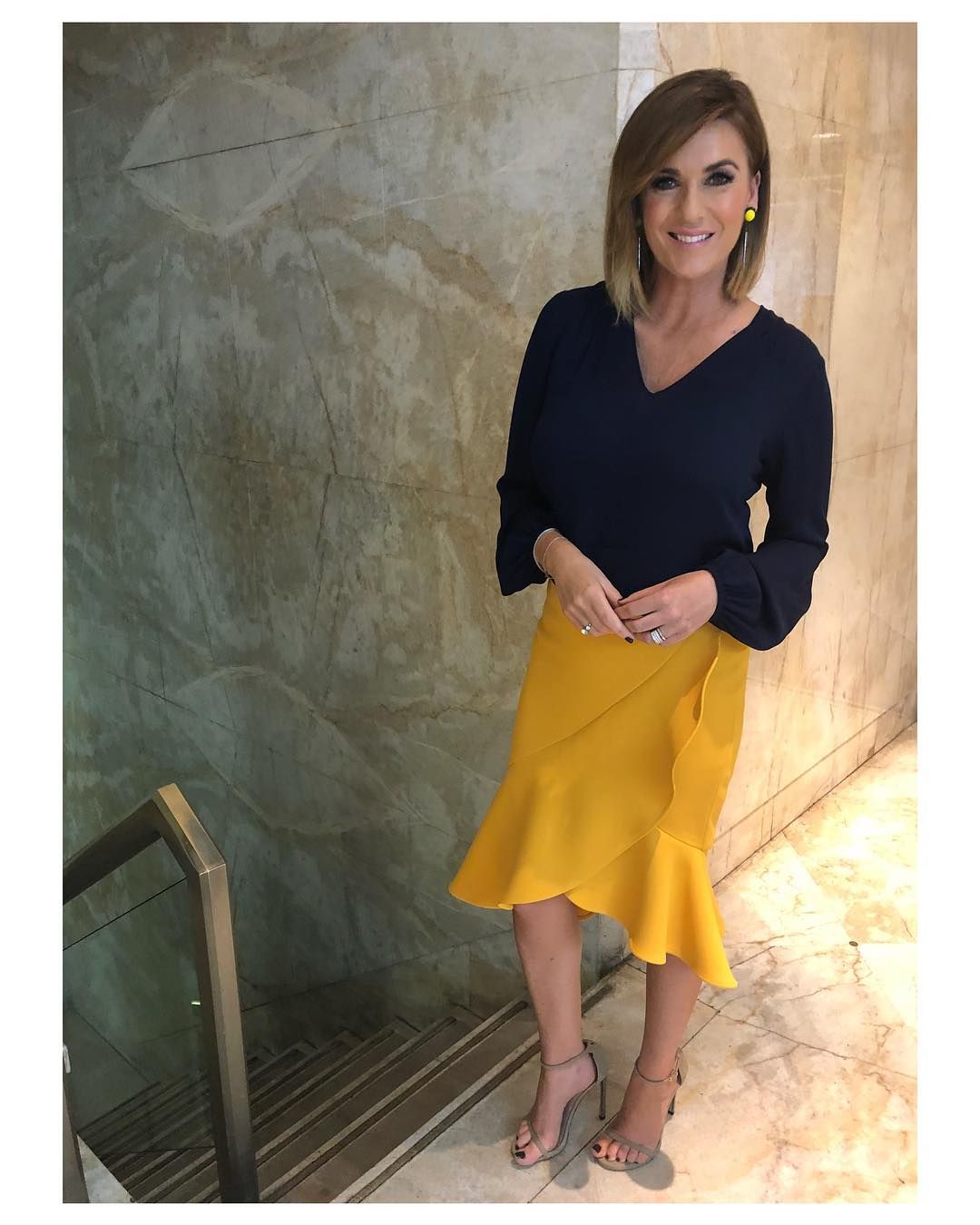 The legs are out again. Pink dress looked short when standing so could be a bit of leg on display.