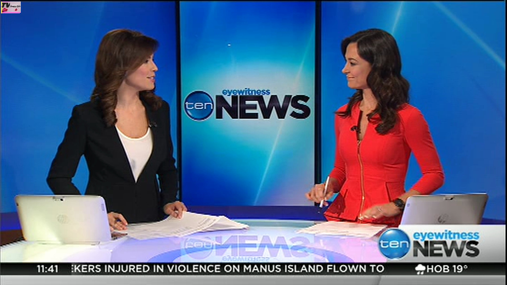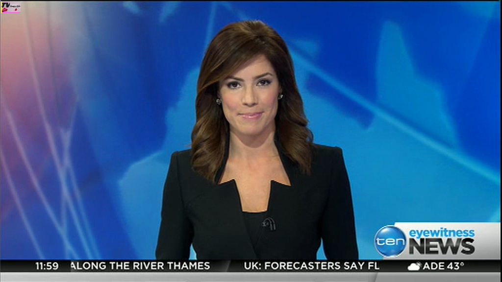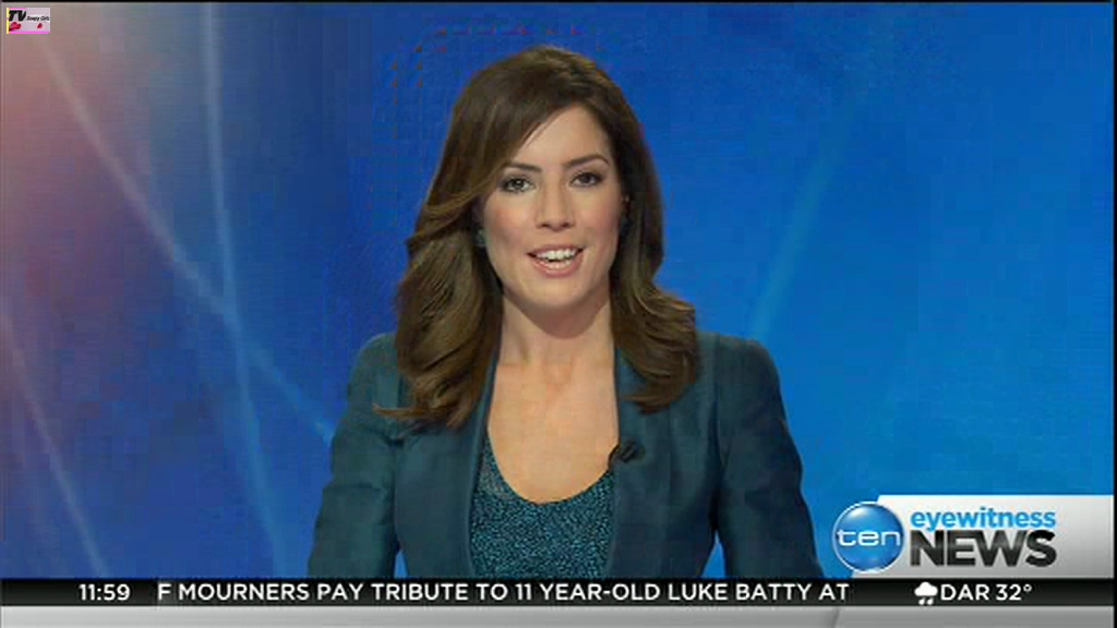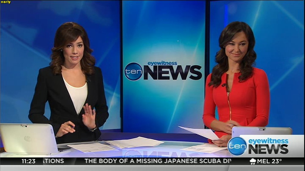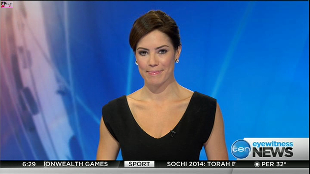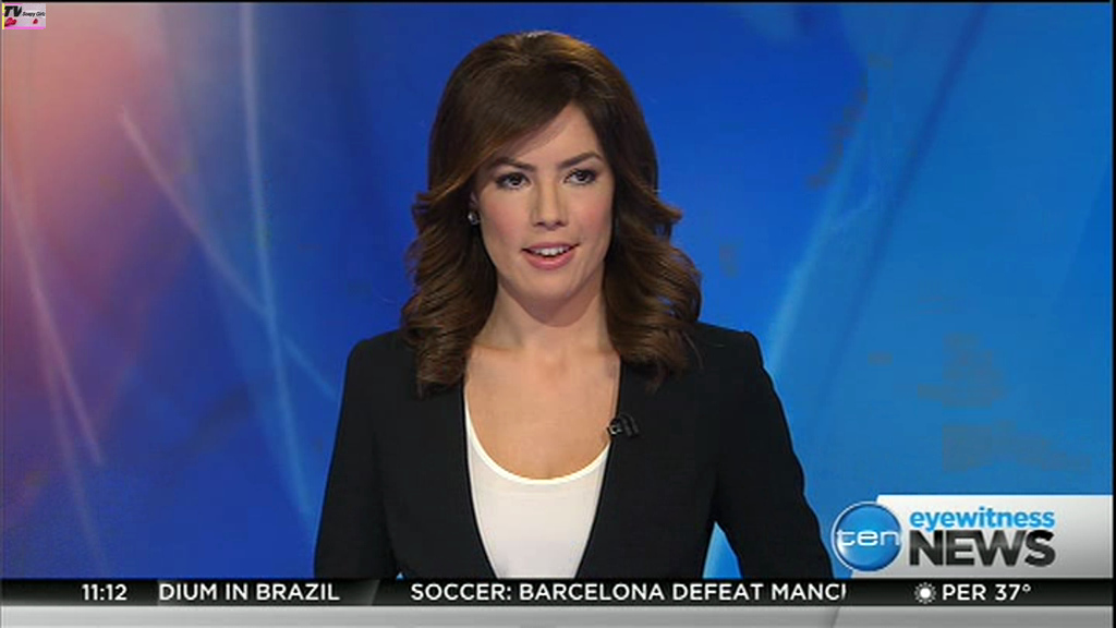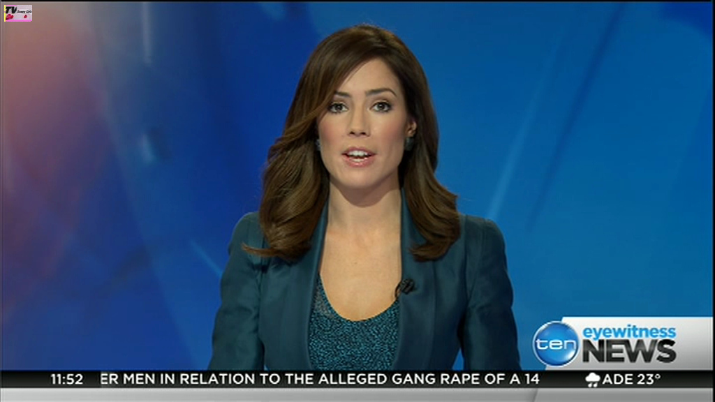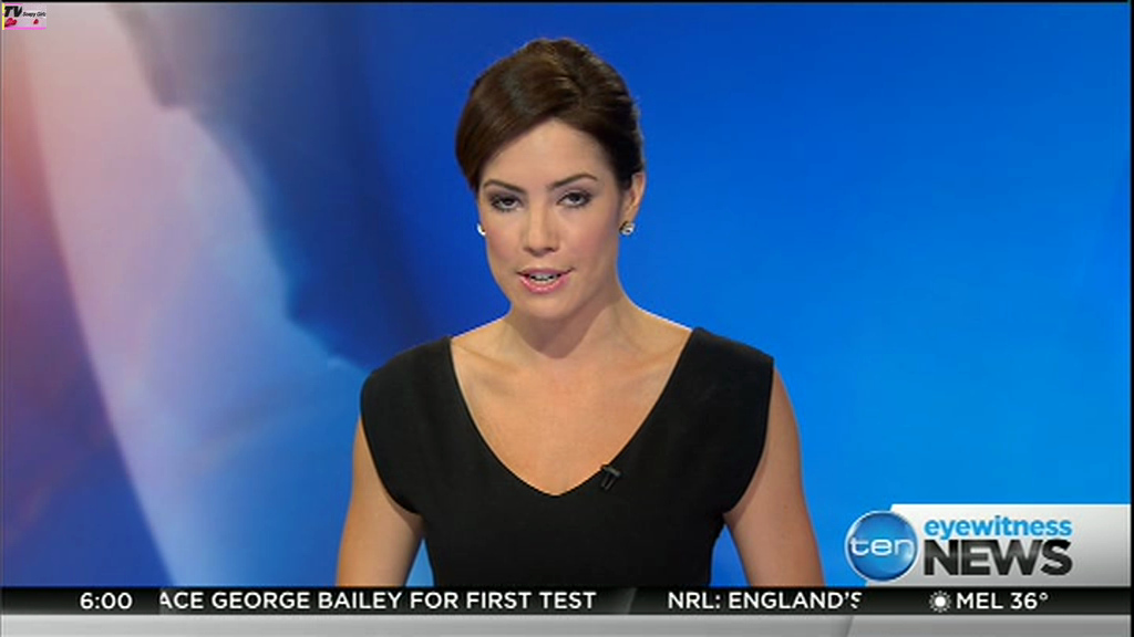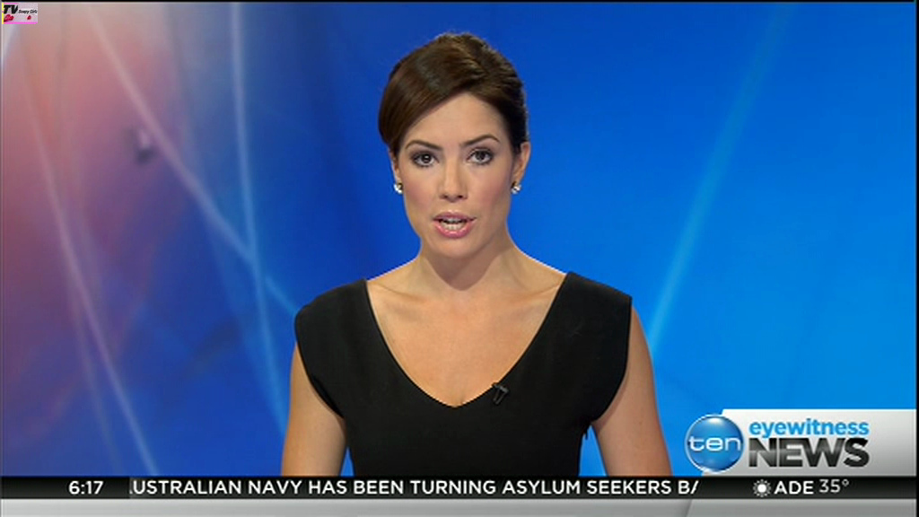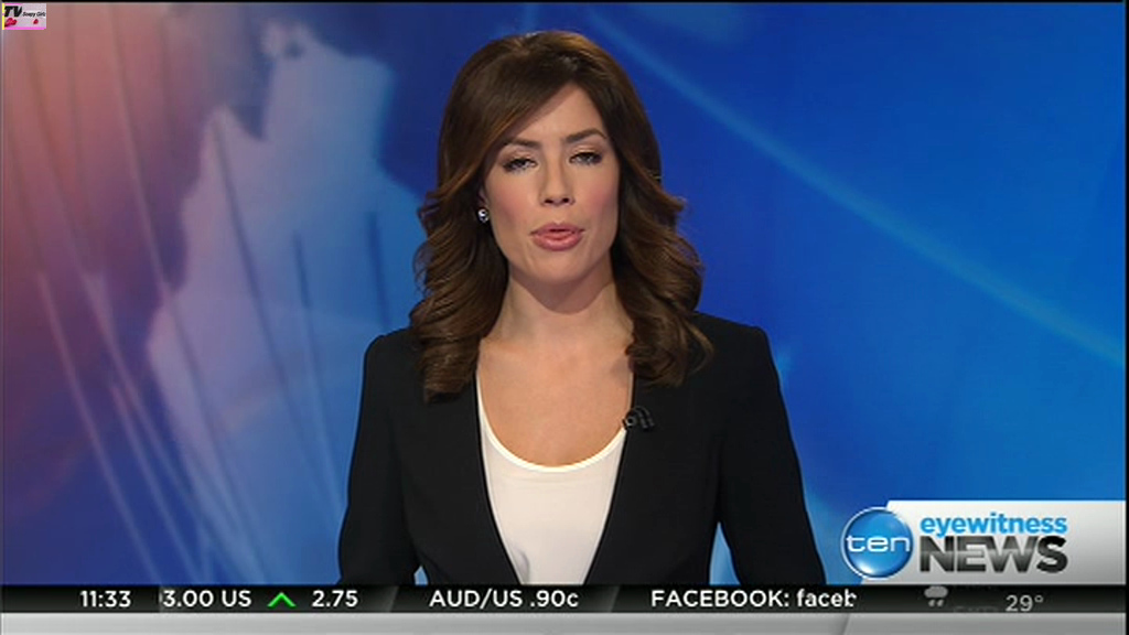 Ladies bringing us the news. Hermione Kitson is showing some leg.  BTW, She was born in New Zealand and is 30 years old.
