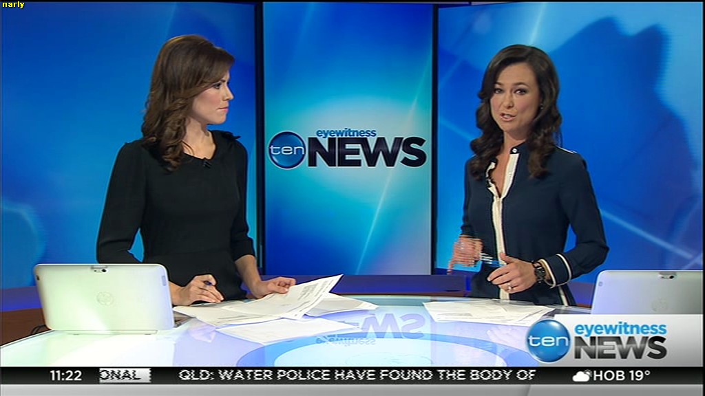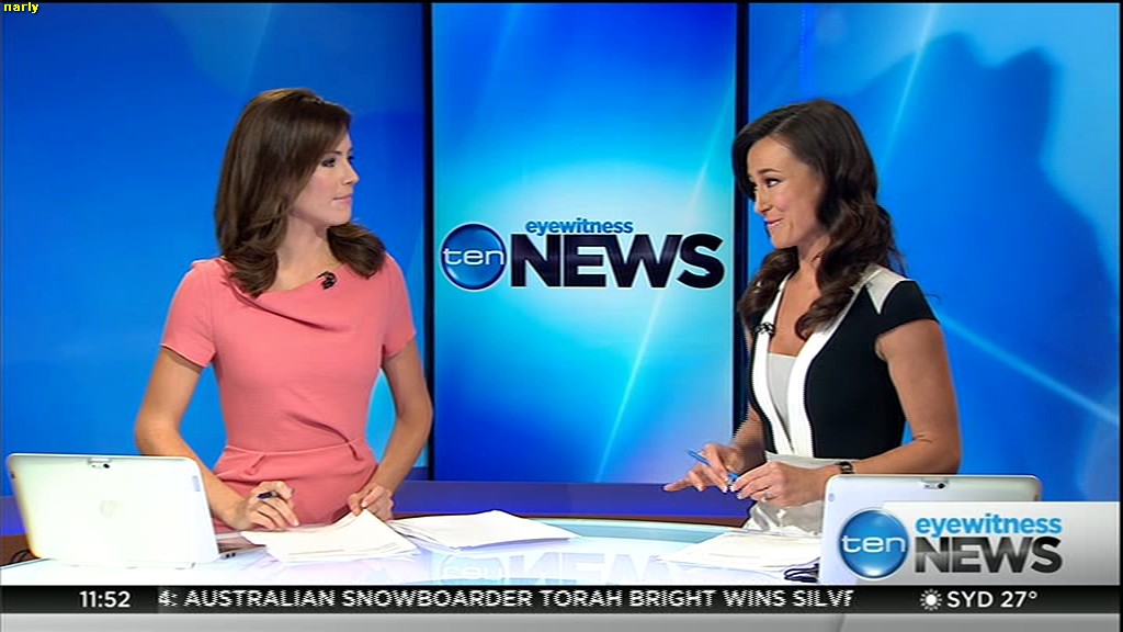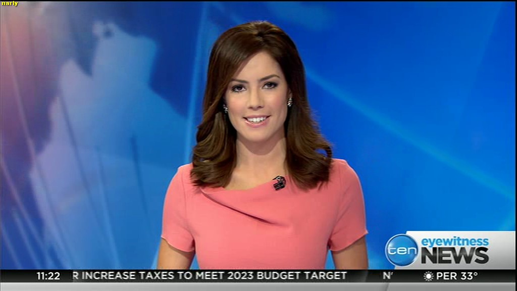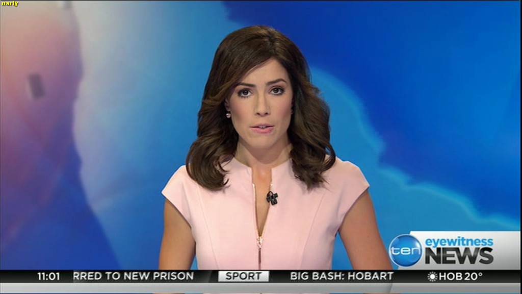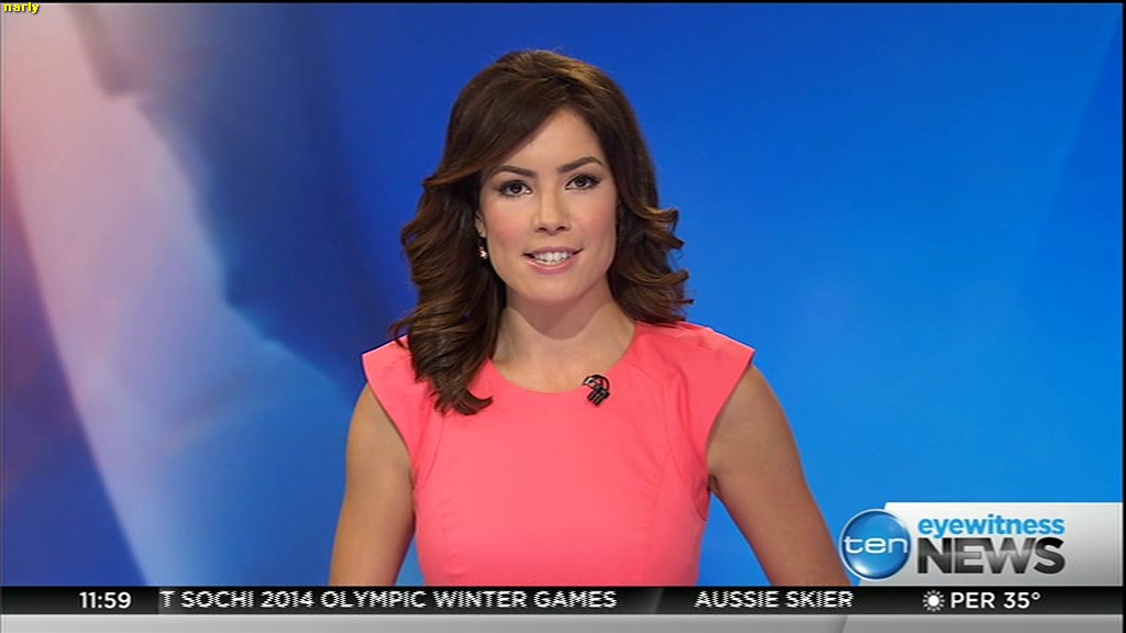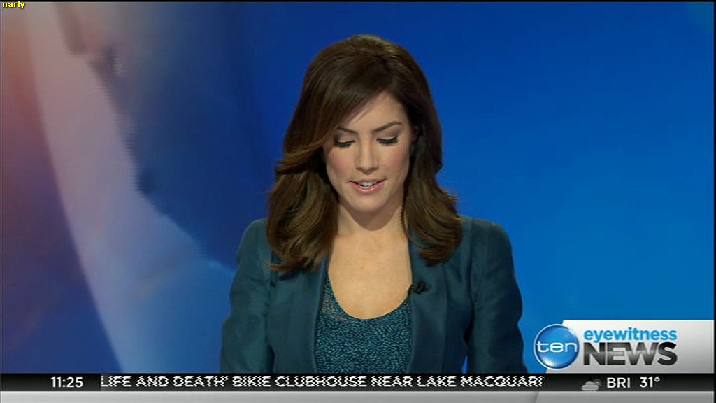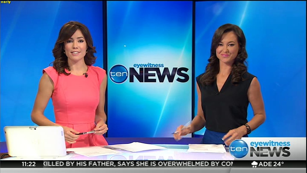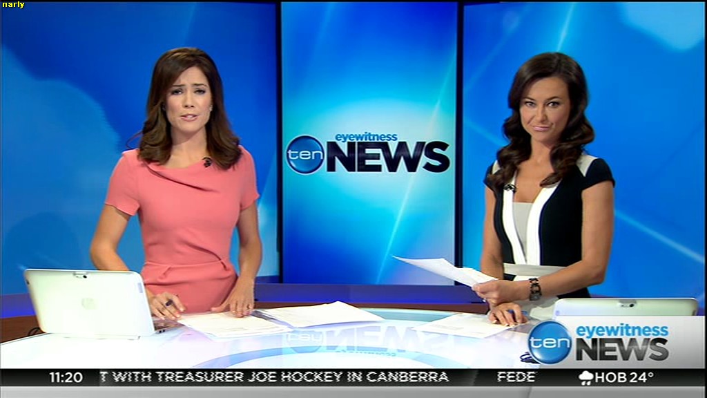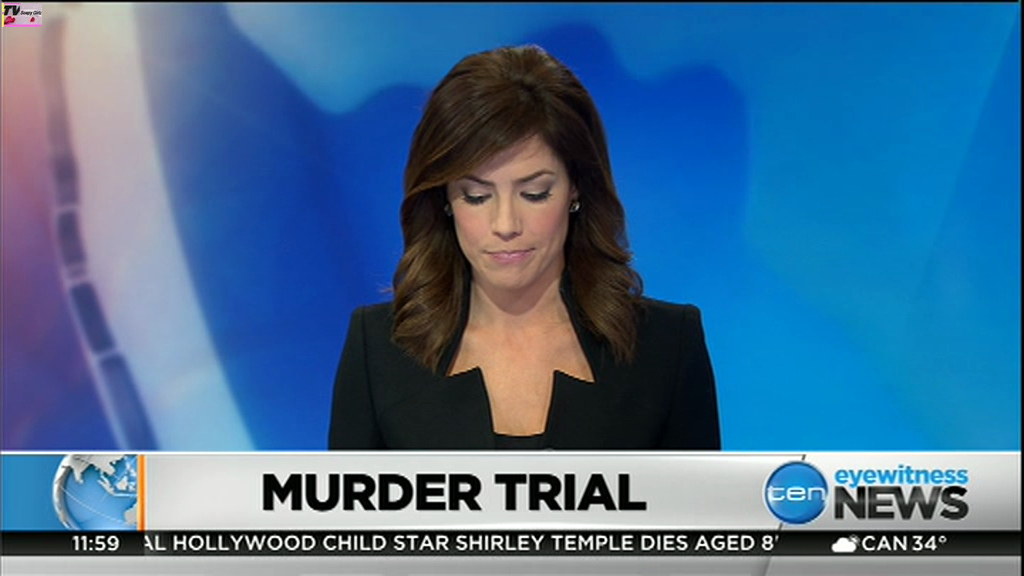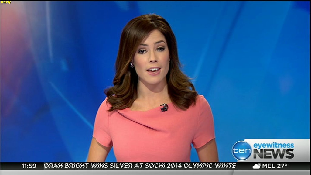 Ladies bringing us the news. Hermione Kitson is showing some leg.  BTW, She was born in New Zealand and is 30 years old.