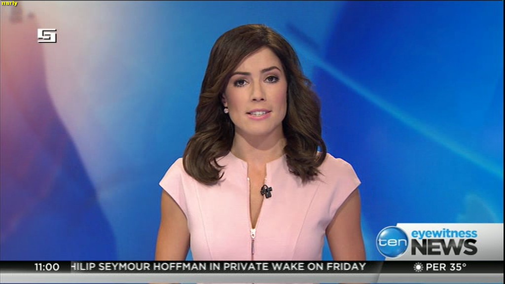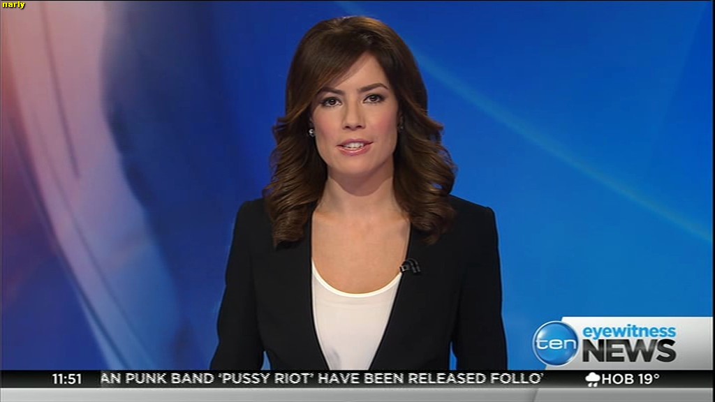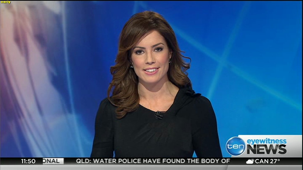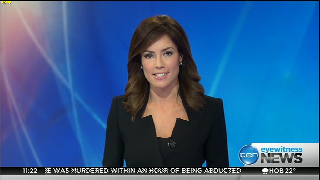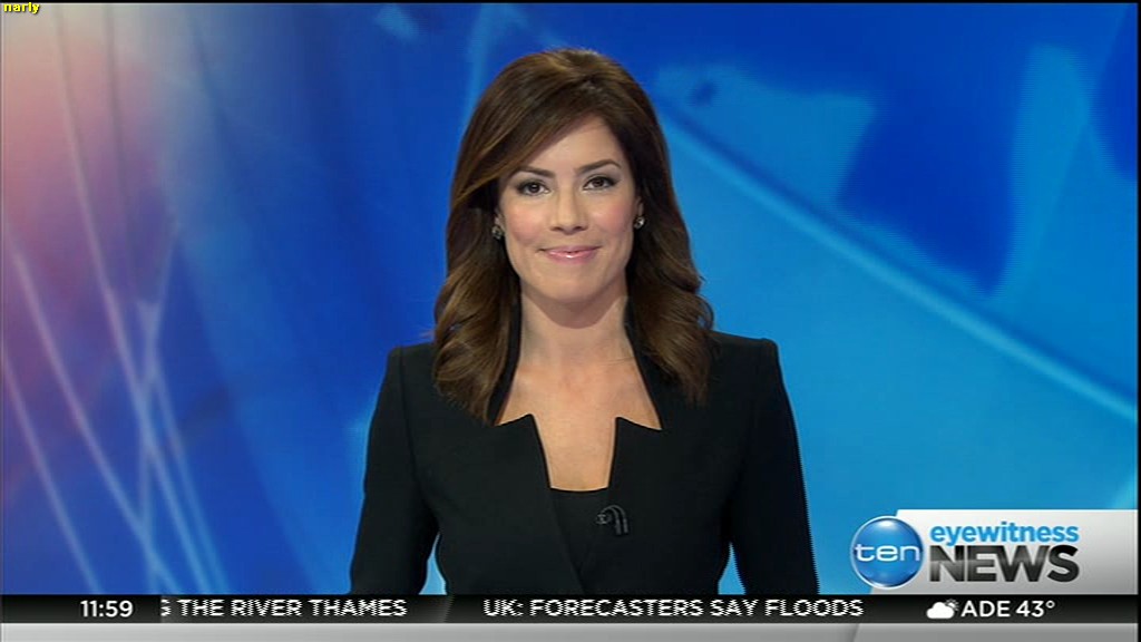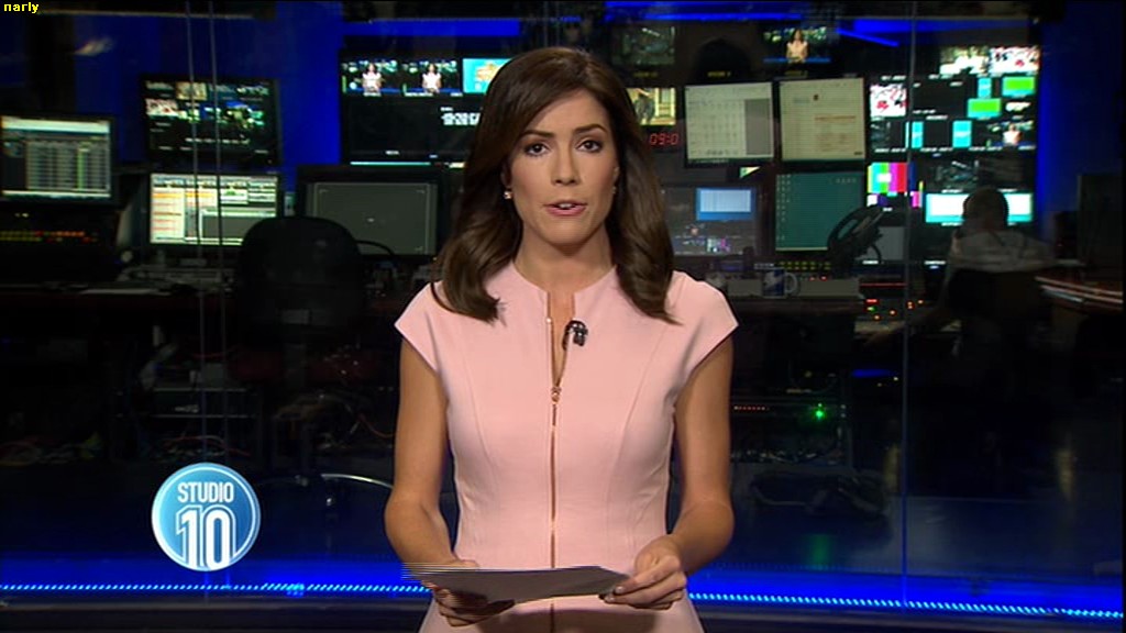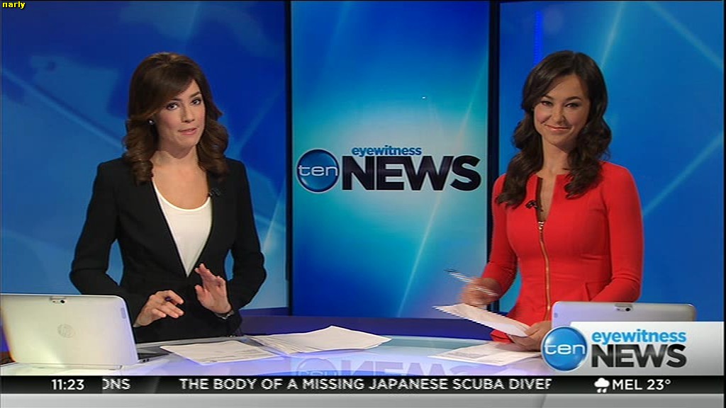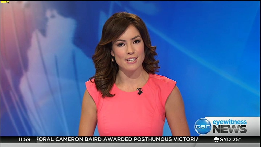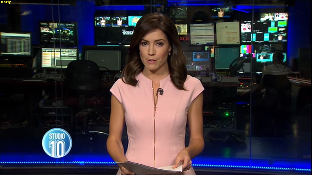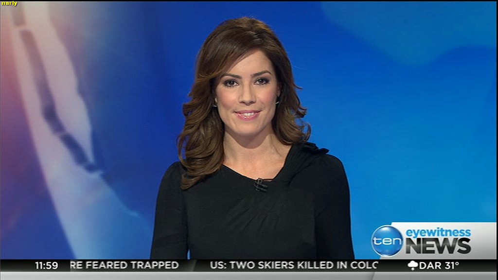 Ladies bringing us the news. Hermione Kitson is showing some leg.  BTW, She was born in New Zealand and is 30 years old.