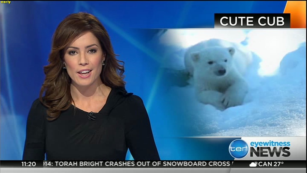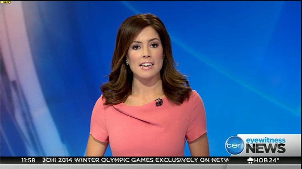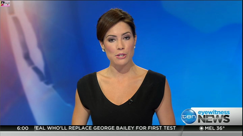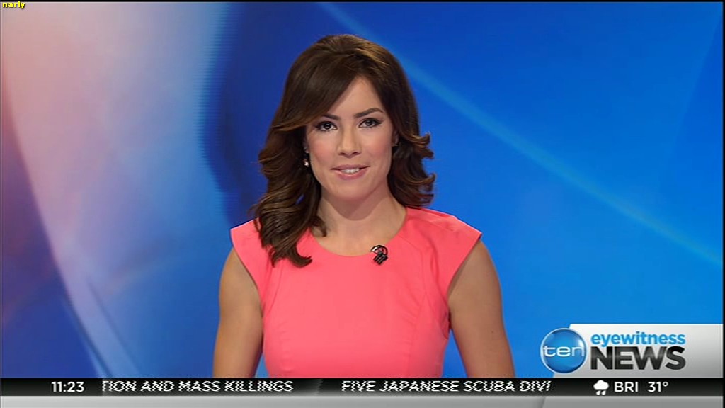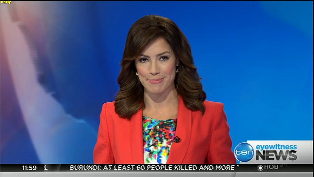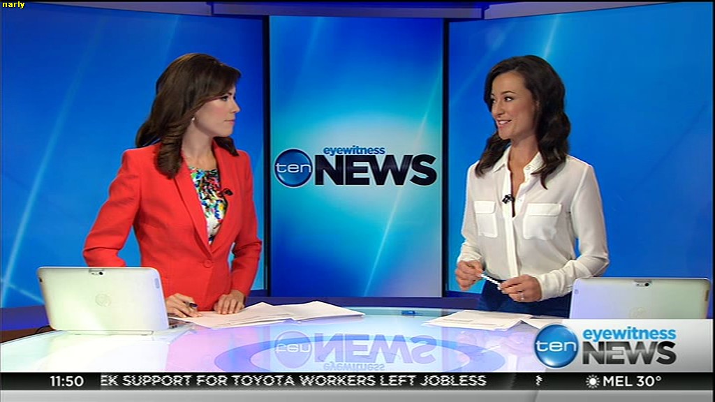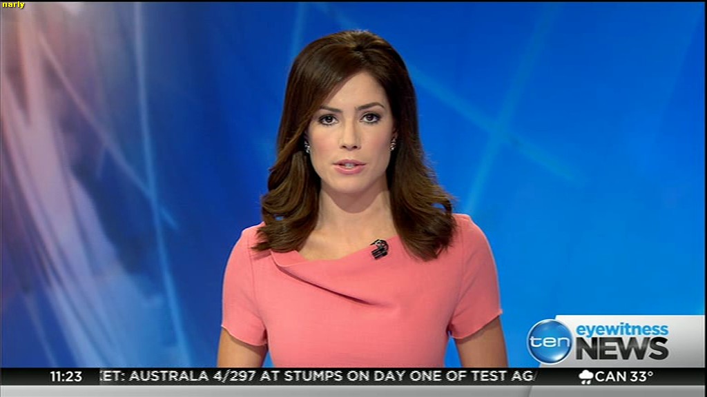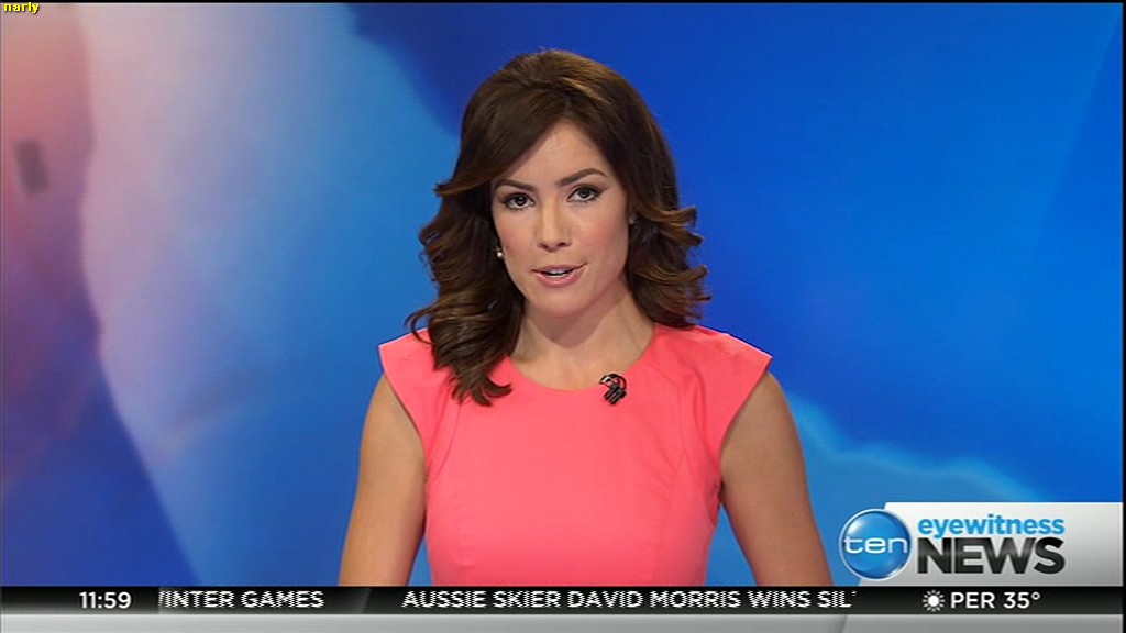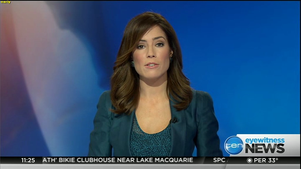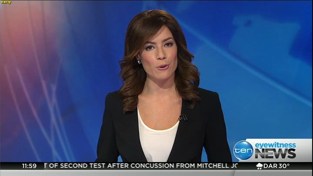 Ladies bringing us the news. Hermione Kitson is showing some leg.  BTW, She was born in New Zealand and is 30 years old.