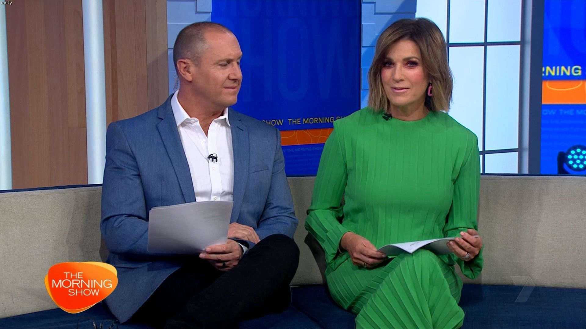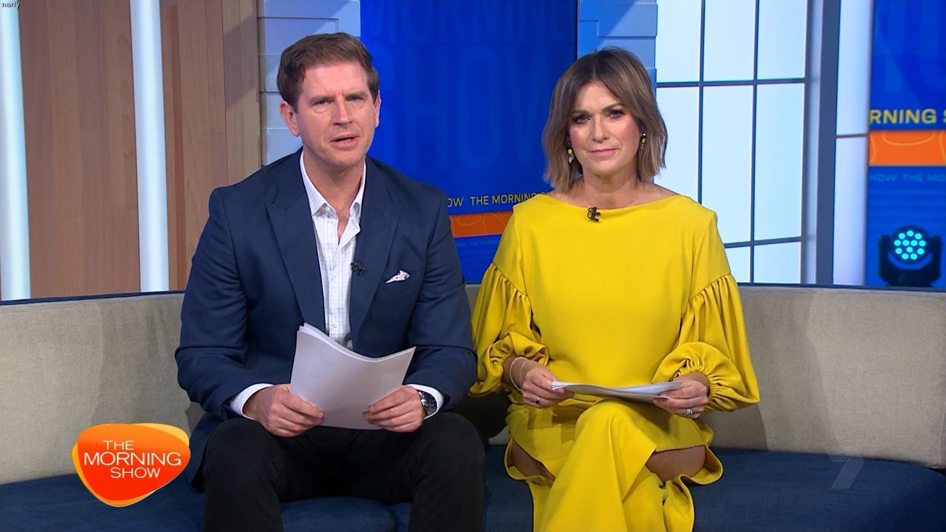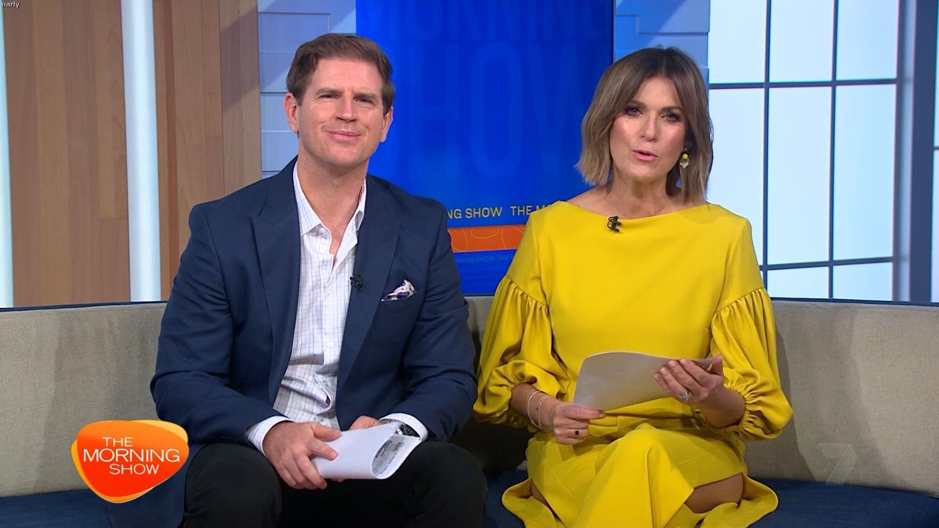 Big split in yellow skirt today. Showed really nice thigh just before 10 on the couch.