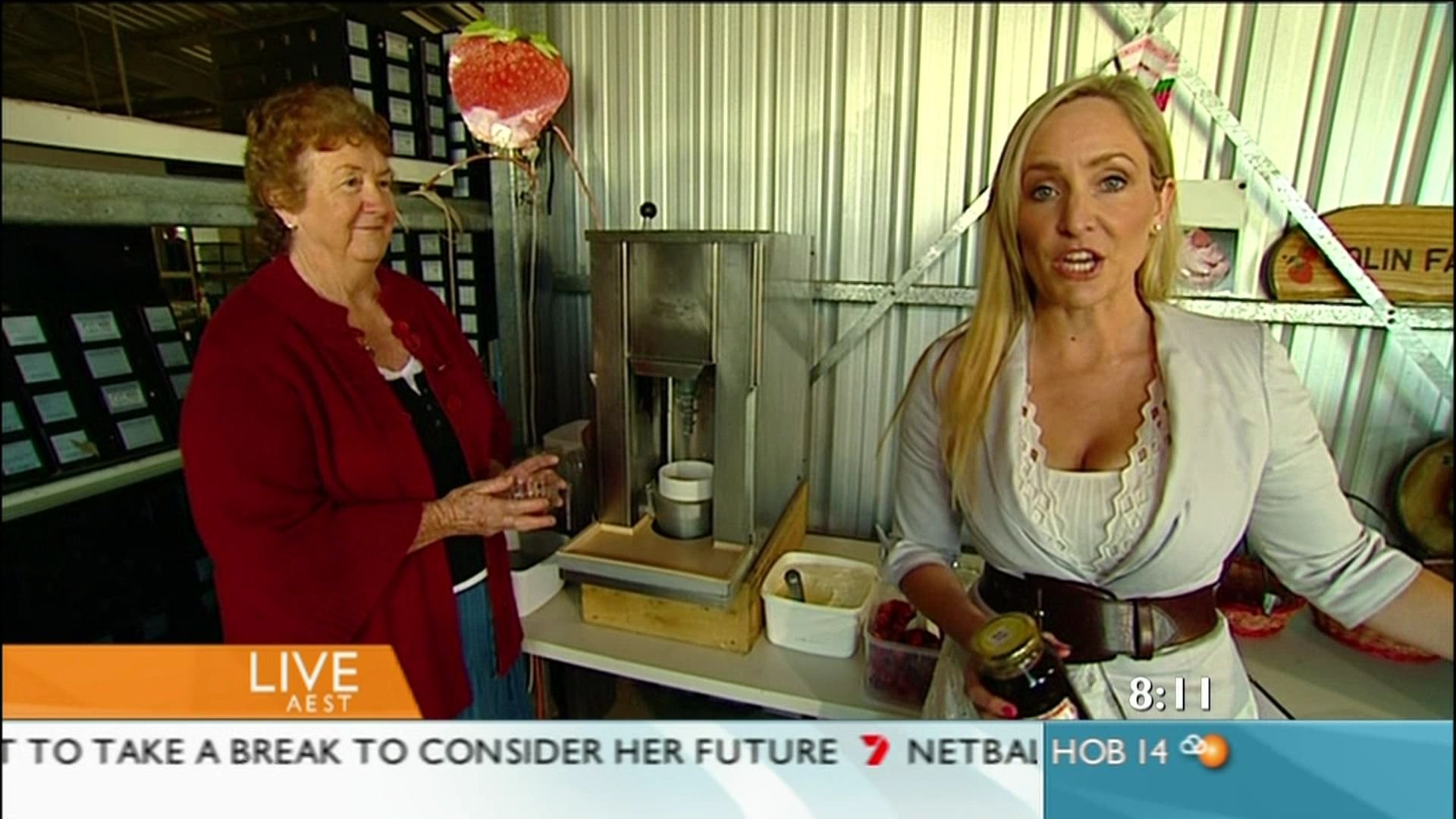 They crossed to the weather and she was leaning over, kocie says "i cant beleive the size of those strawberrys"