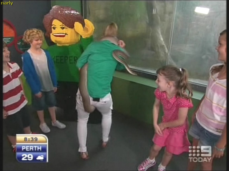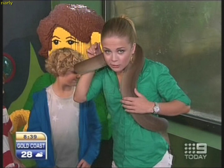 Emma having trouble with an Olive python . Commented " why does it keep going between my legs ? " Ally answered "maybe it's a male python "