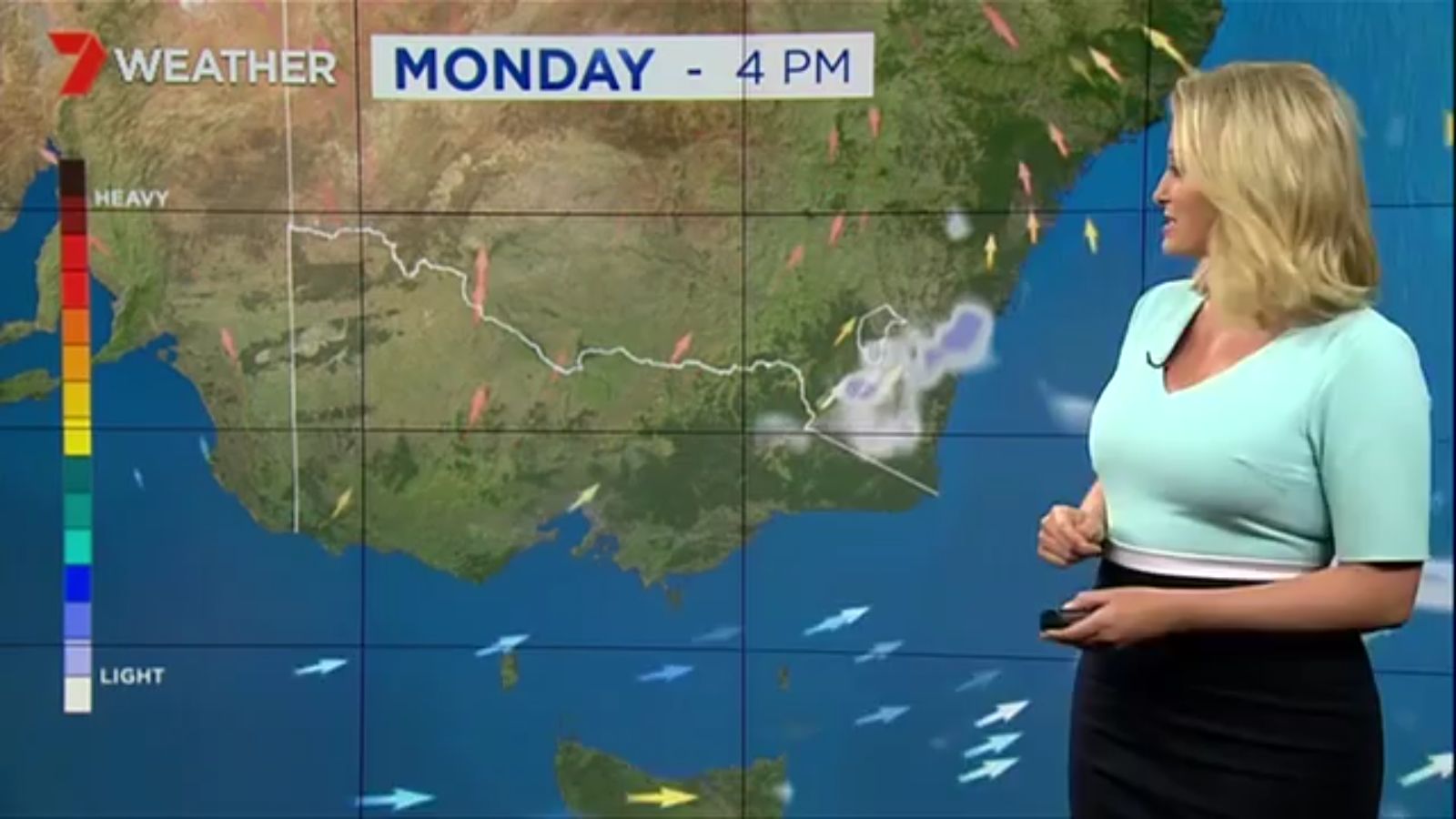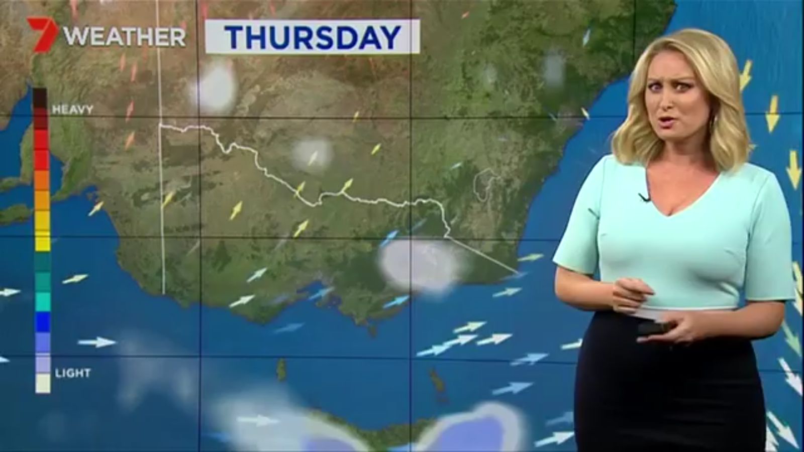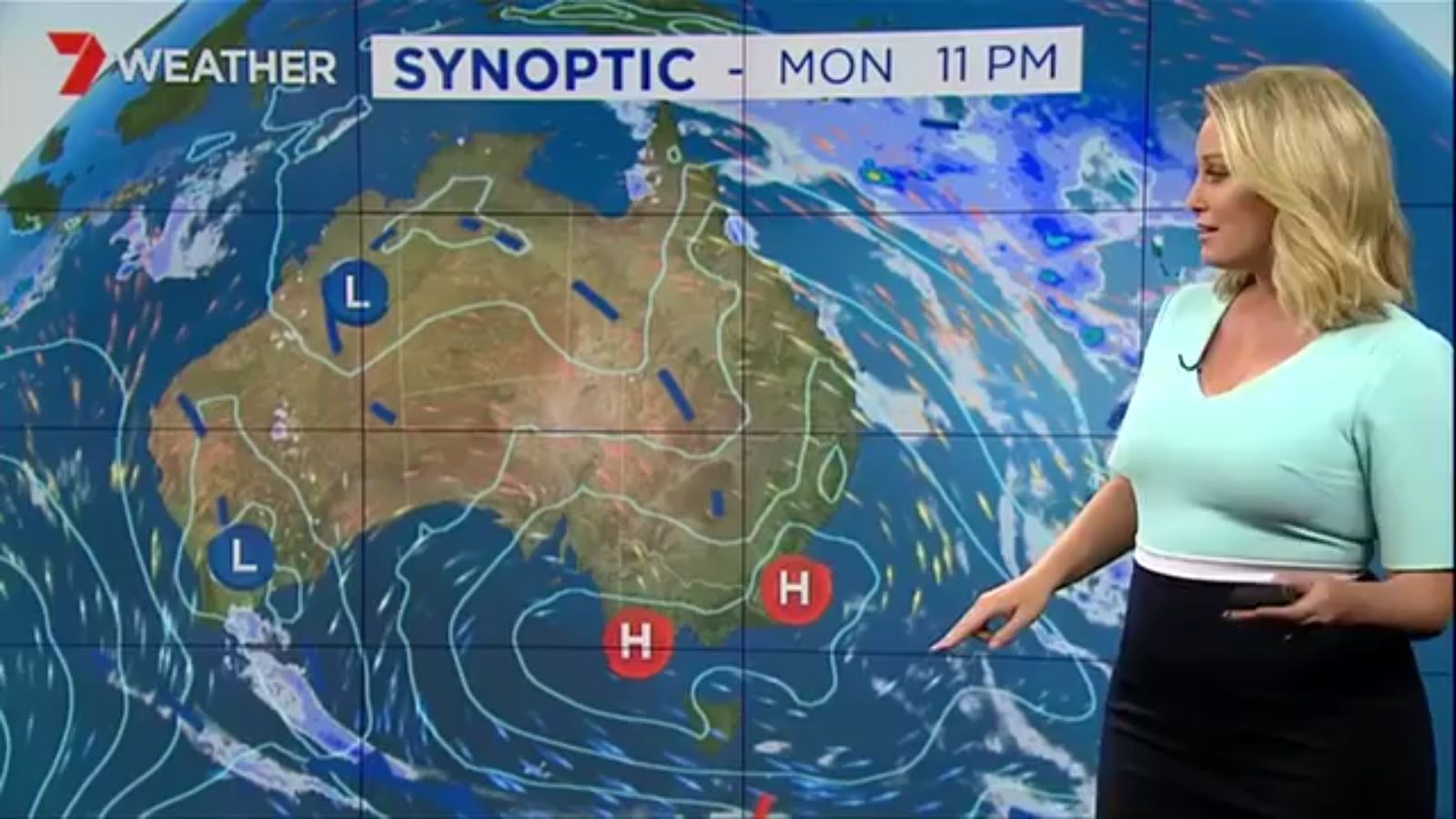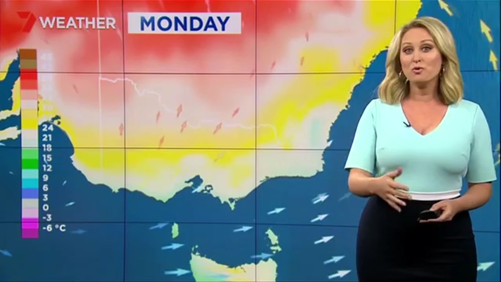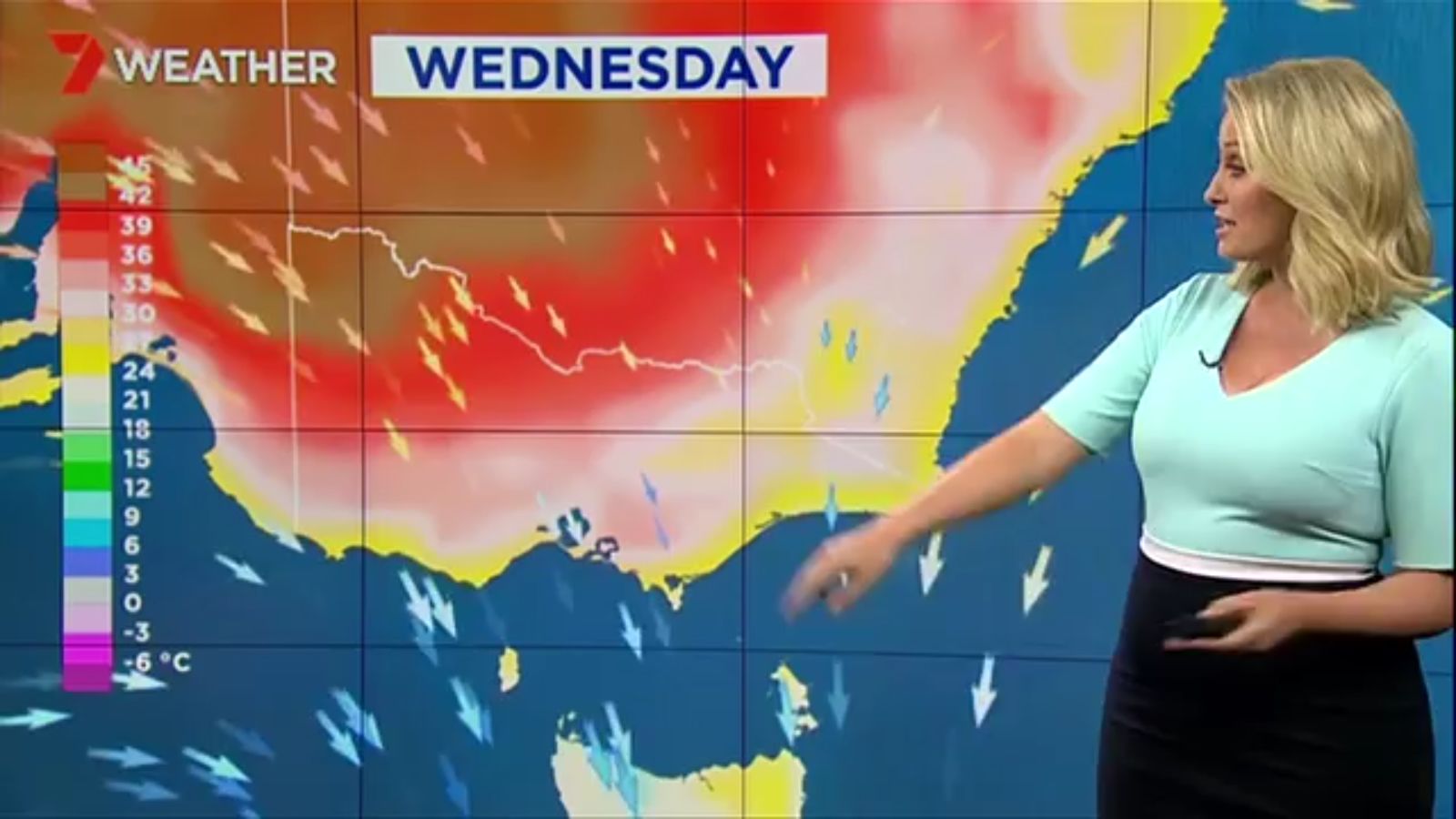 Jane has an interestingly unorthodox presentation style, always saying "we'll be warmer" "we'll be colder" and then she says, "there will be rainfall in this part of the state (points at Gippsland). If I didn't know any better I would assume she thinks the audience are a bunch of low life morons who just stare at her tits and hip wiggles. Keep up the great work boys