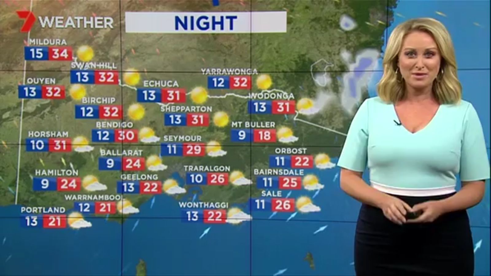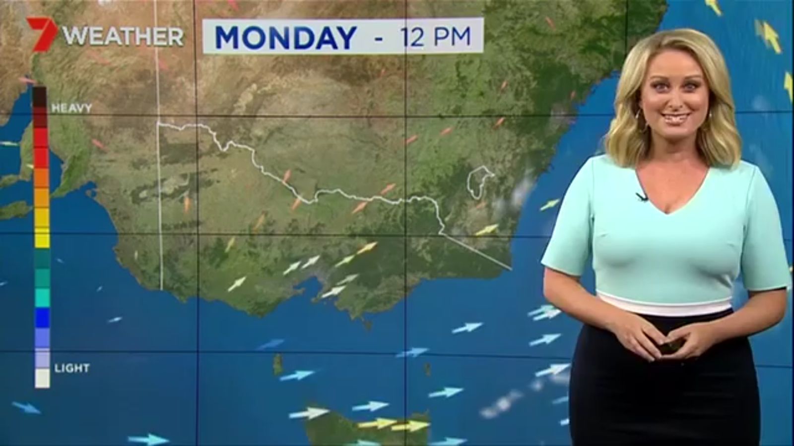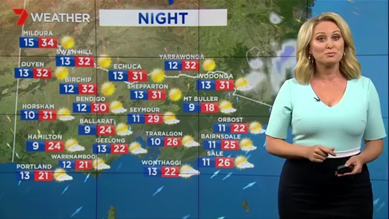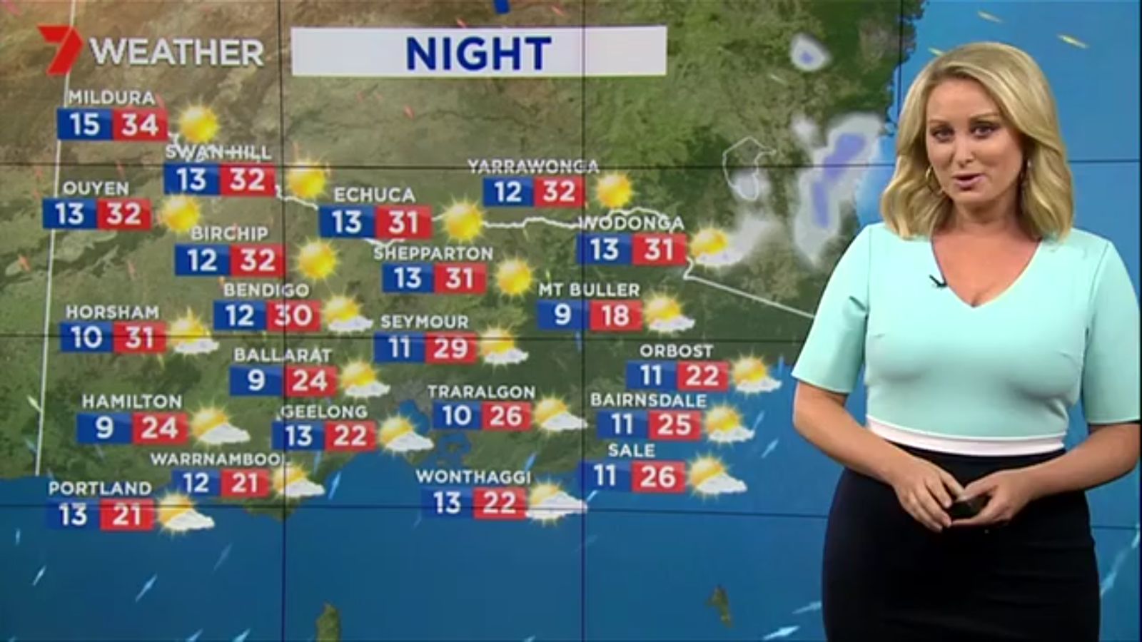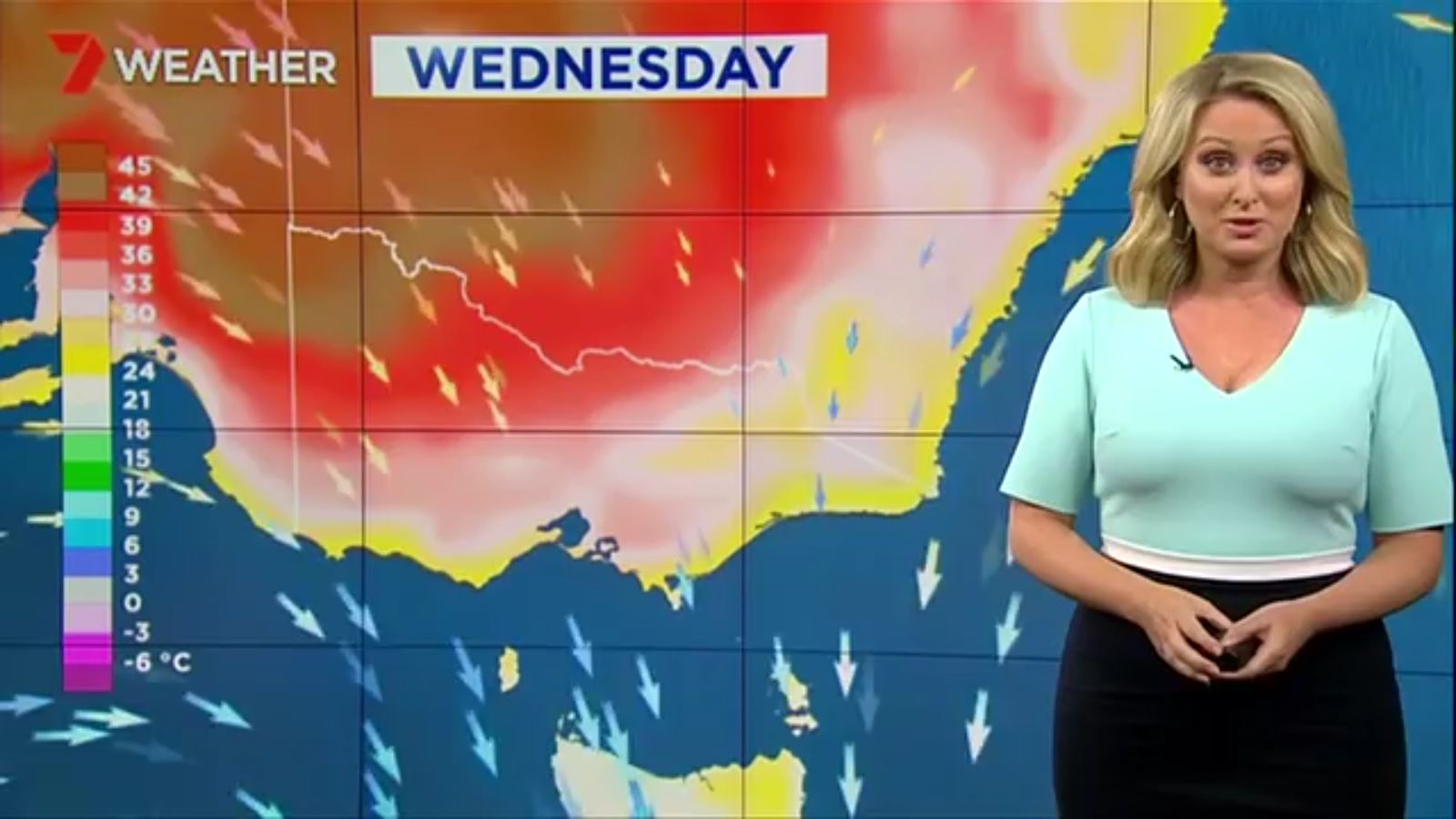 Jane has an interestingly unorthodox presentation style, always saying "we'll be warmer" "we'll be colder" and then she says, "there will be rainfall in this part of the state (points at Gippsland). If I didn't know any better I would assume she thinks the audience are a bunch of low life morons who just stare at her tits and hip wiggles. Keep up the great work boys