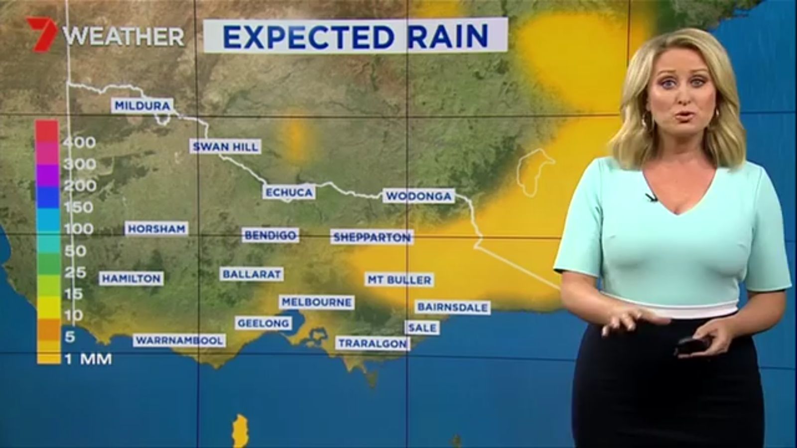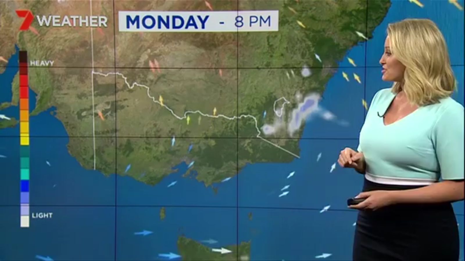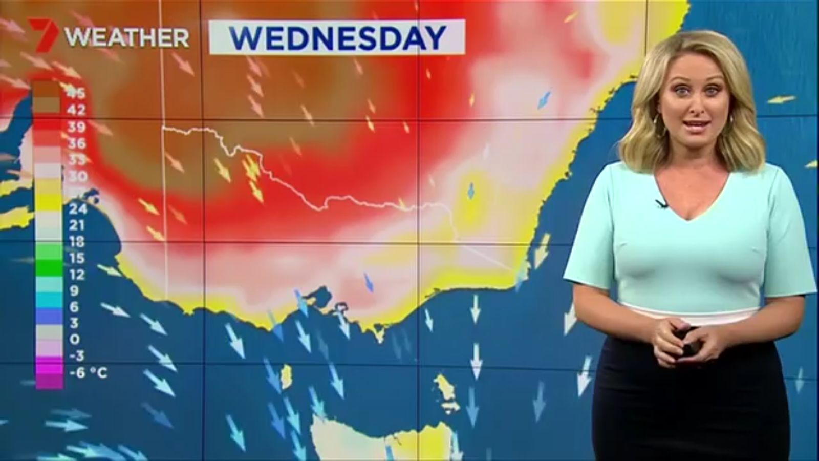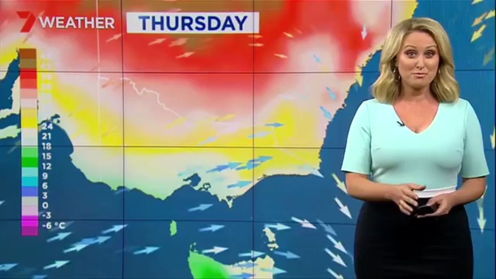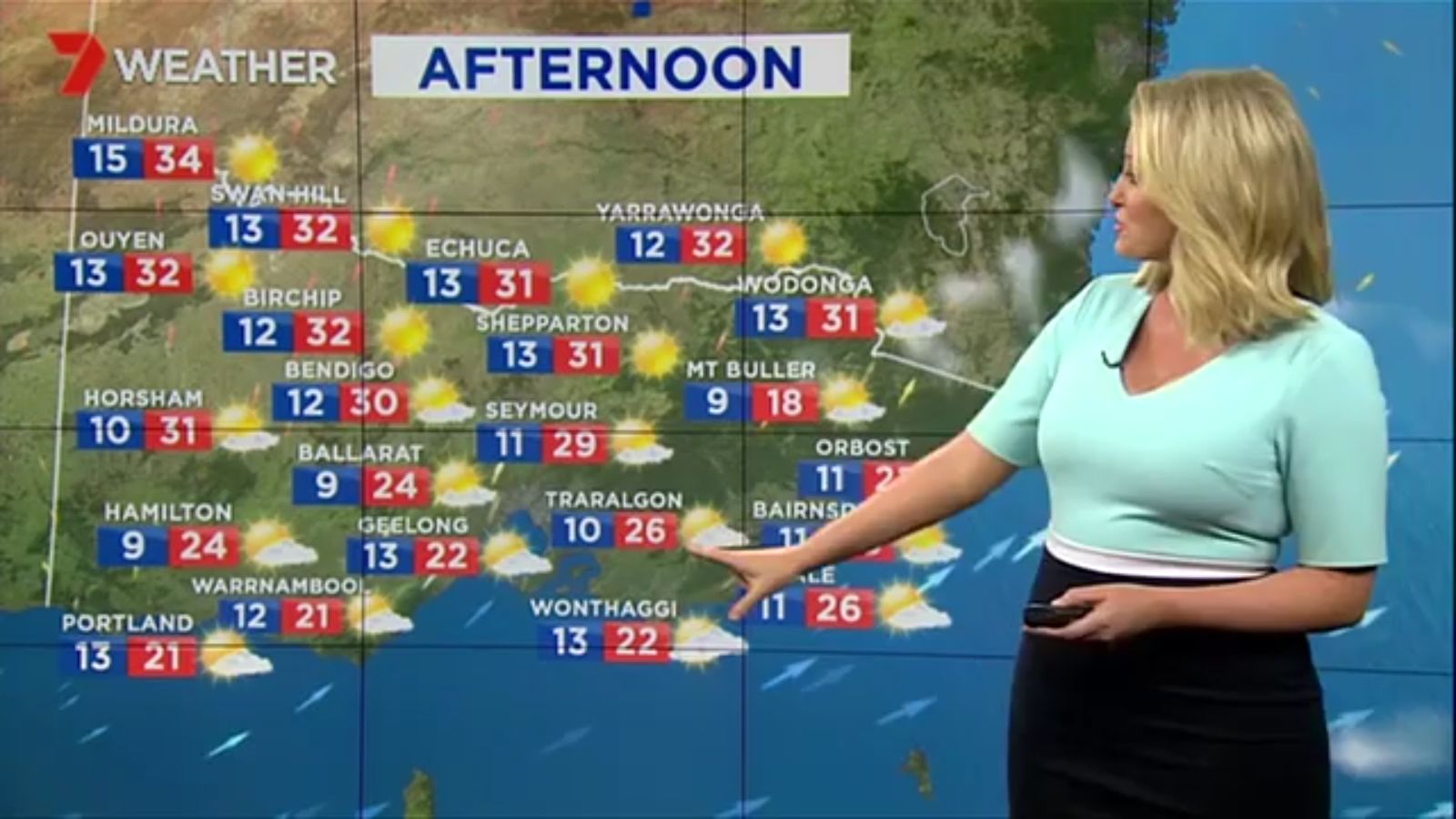 Jane has an interestingly unorthodox presentation style, always saying "we'll be warmer" "we'll be colder" and then she says, "there will be rainfall in this part of the state (points at Gippsland). If I didn't know any better I would assume she thinks the audience are a bunch of low life morons who just stare at her tits and hip wiggles. Keep up the great work boys