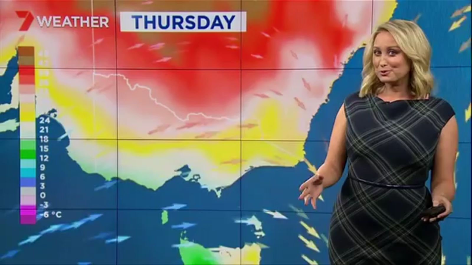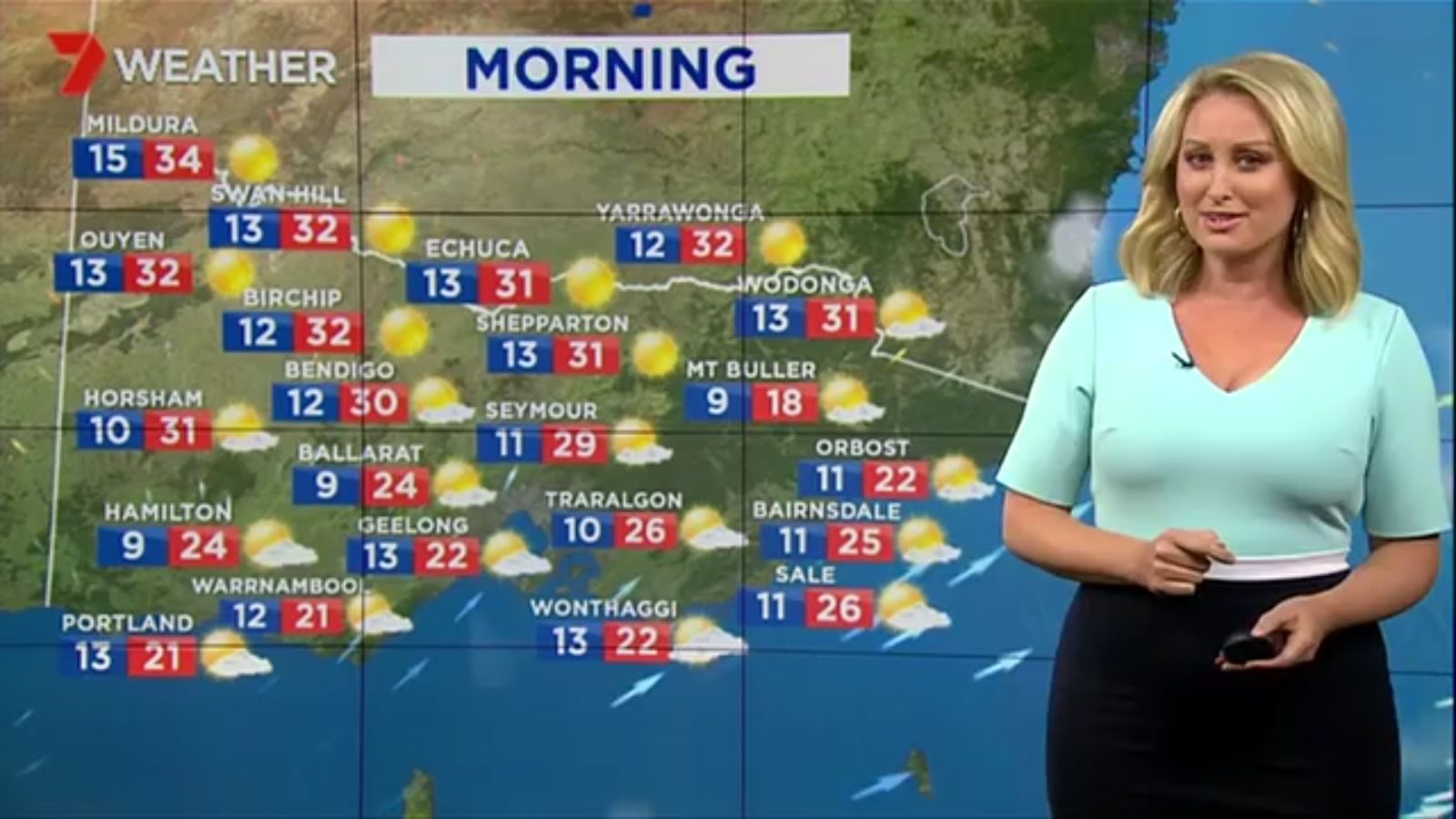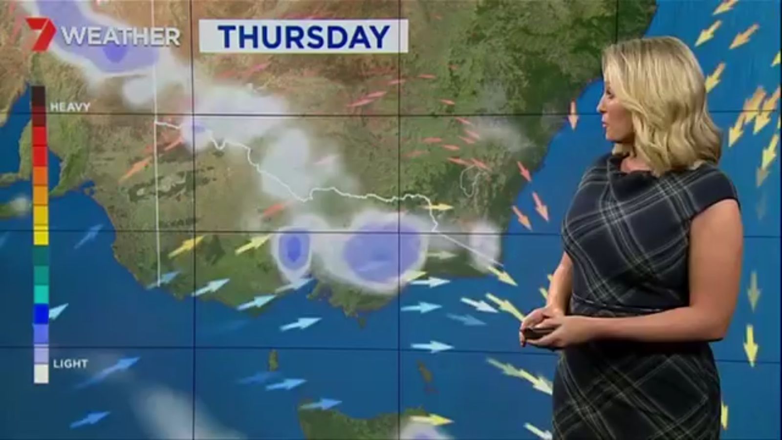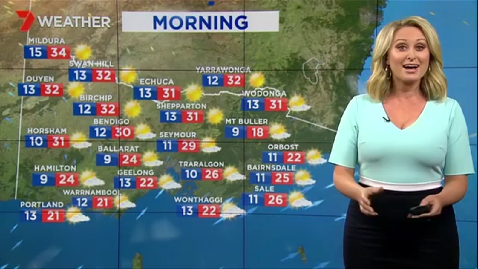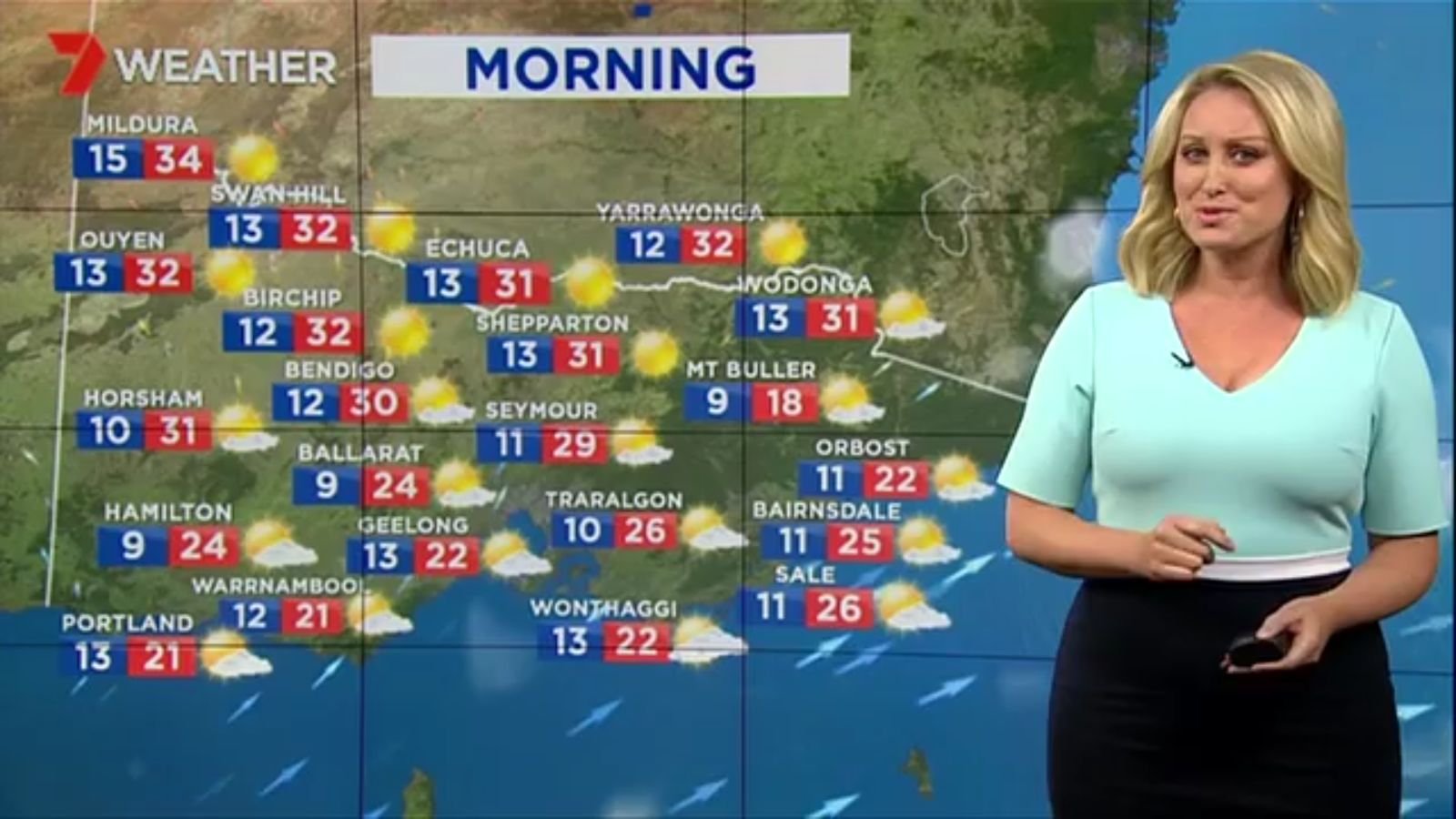Jane has an interestingly unorthodox presentation style, always saying "we'll be warmer" "we'll be colder" and then she says, "there will be rainfall in this part of the state (points at Gippsland). If I didn't know any better I would assume she thinks the audience are a bunch of low life morons who just stare at her tits and hip wiggles. Keep up the great work boys