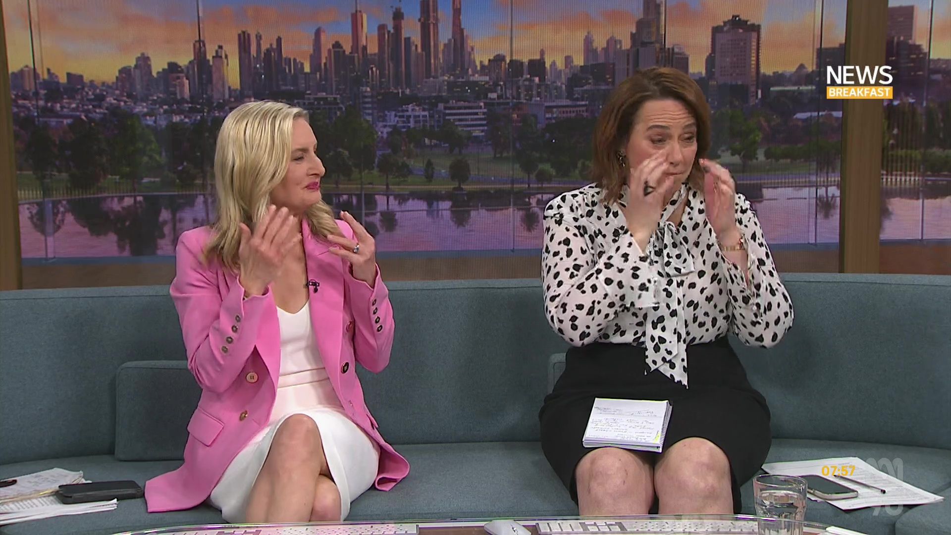 Stephanie Ferrier displaying an unintended generous serve of thigh under the presenting desk this morning...