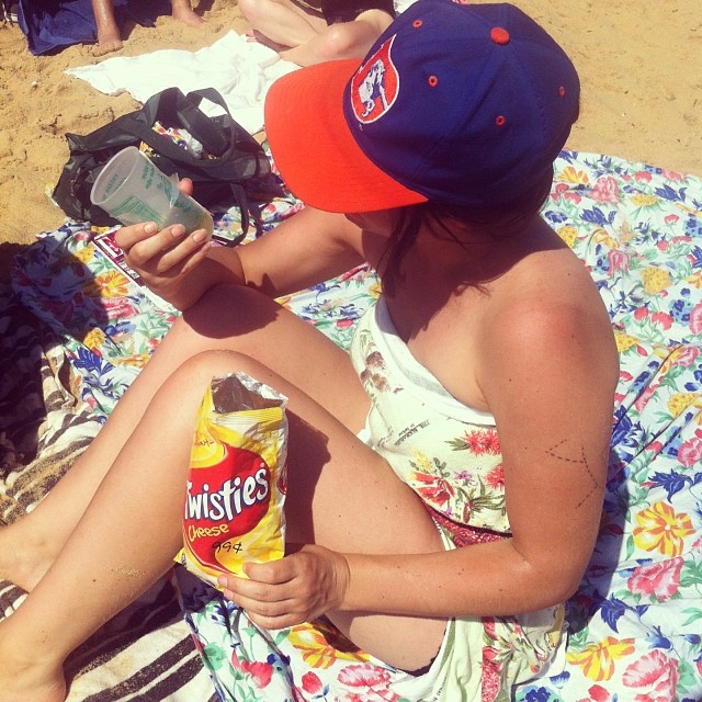 At the beach today for the birthday of young petertones with rum in young coconut juice, twisties, friends, favourite floral sheet sarong, broncos cap and sun.. lots of sun.