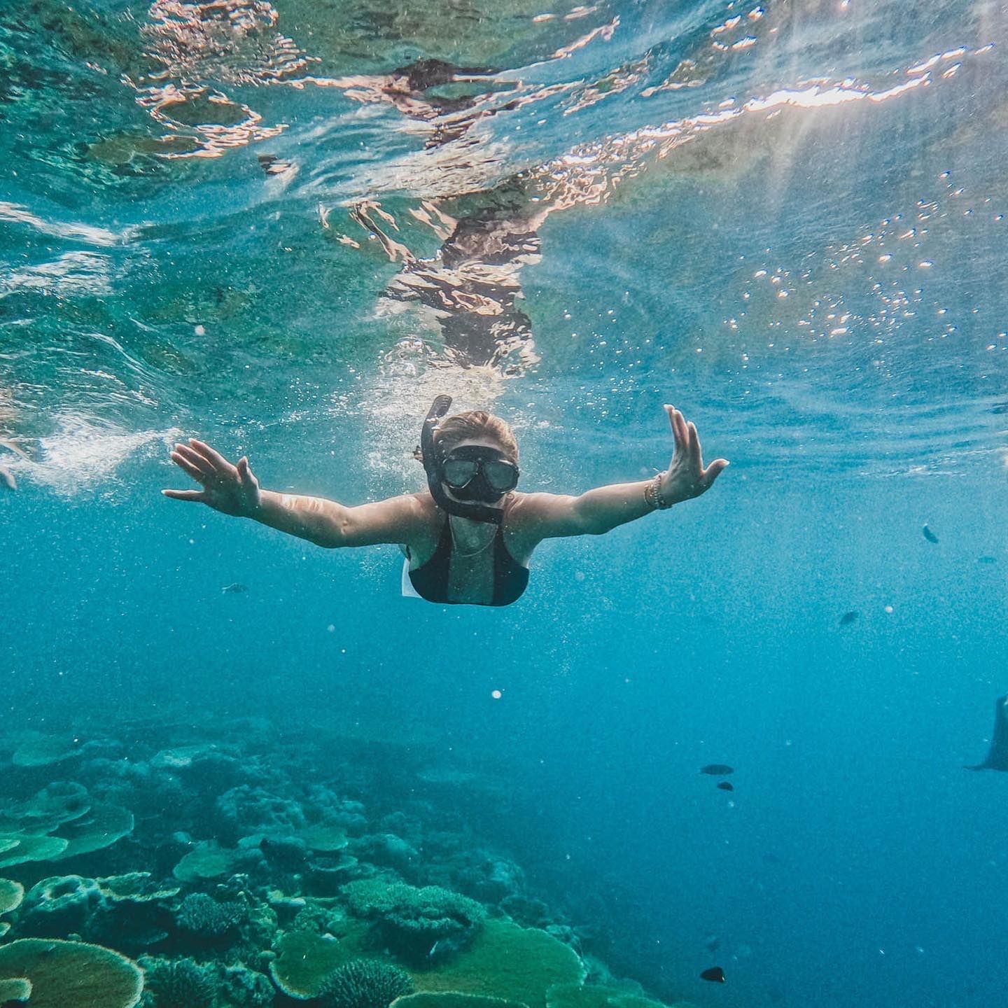 So lucky to be here 🫶🏻 A day of snorkelling was HILARIOUS all of us trying to swim through the waves not realising how big they would be. Beautiful dolphins joining us on our way back -magical. ❤️ Loving the Maldives!!!