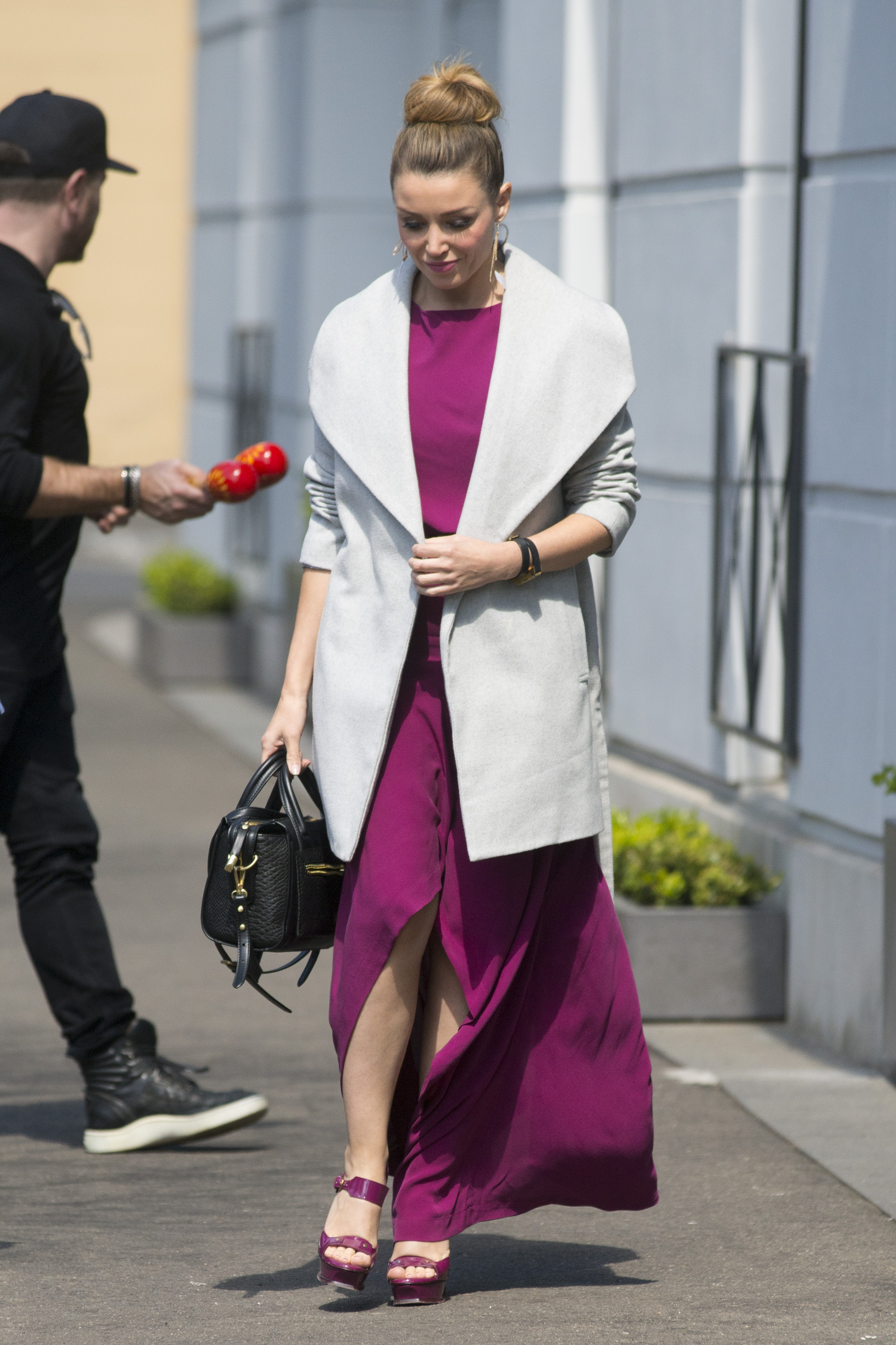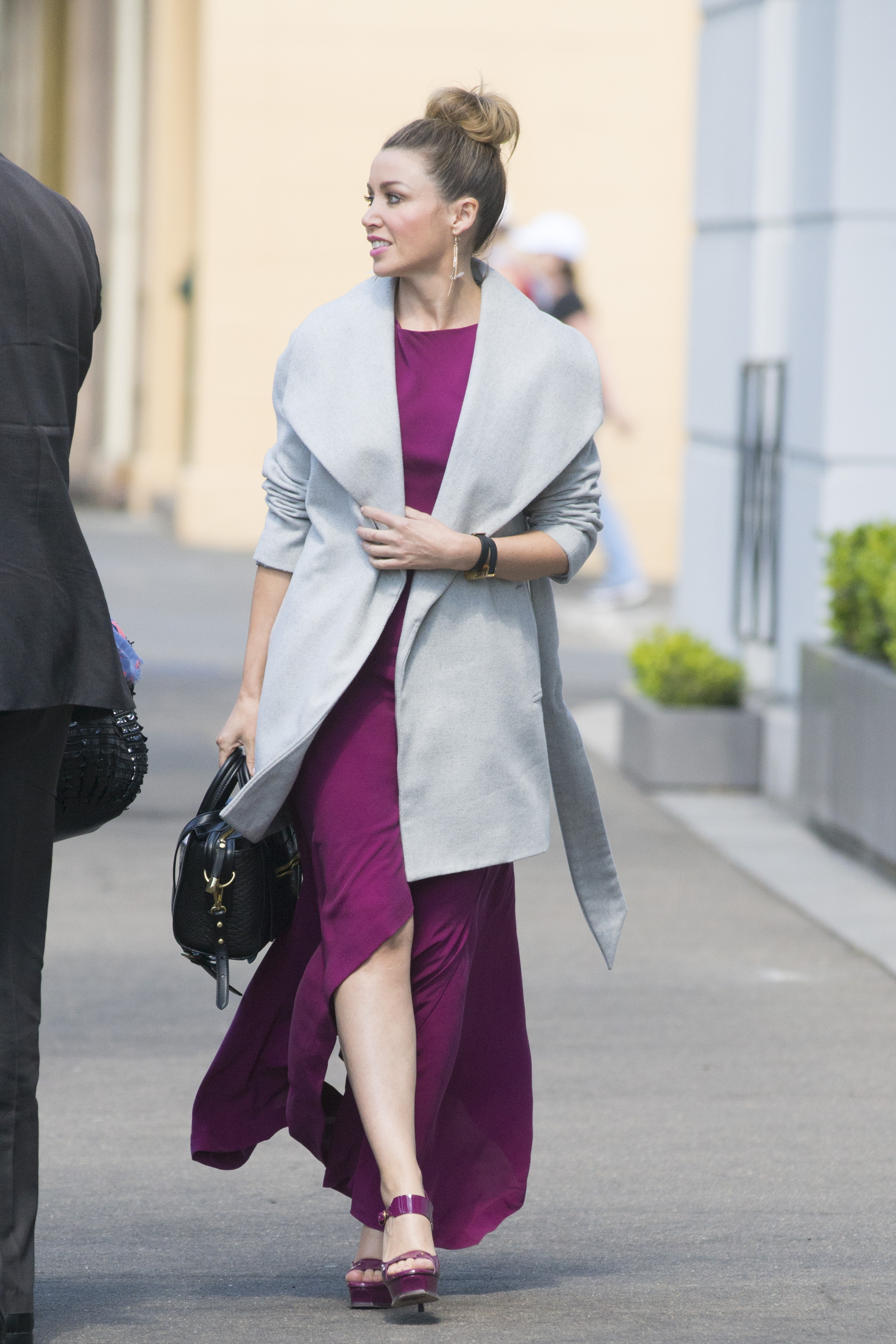 Looks like she's wearing pasties or something on her nipples, given the lack of the bra-line, and the shininess from under the dress right over her nippples.