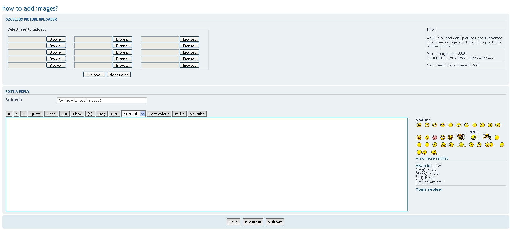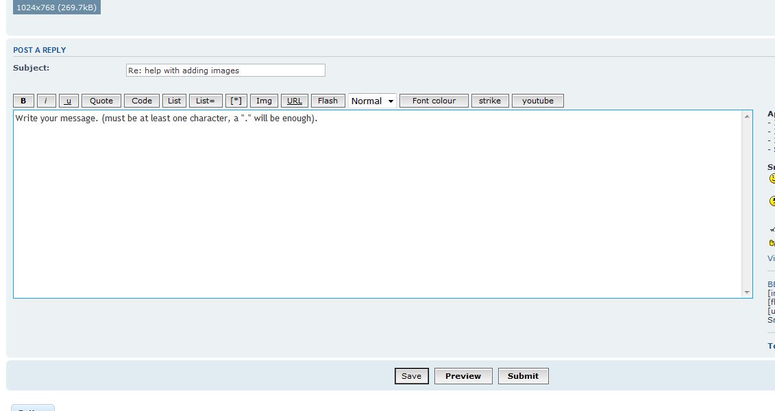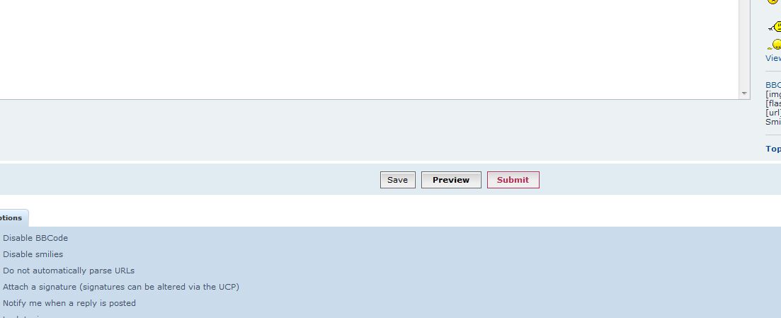 jedda wrote: I'm just getting the regular text box. With the icons above B i U quote code etc. Clicking on the Img or URL only puts those words in the text box. It doesn't open up to the picture as seen in the above posts. what am i doing wrong. Thanks, Jedda So, when you hit the "POSTREPLY" button, your screen does not look like this?