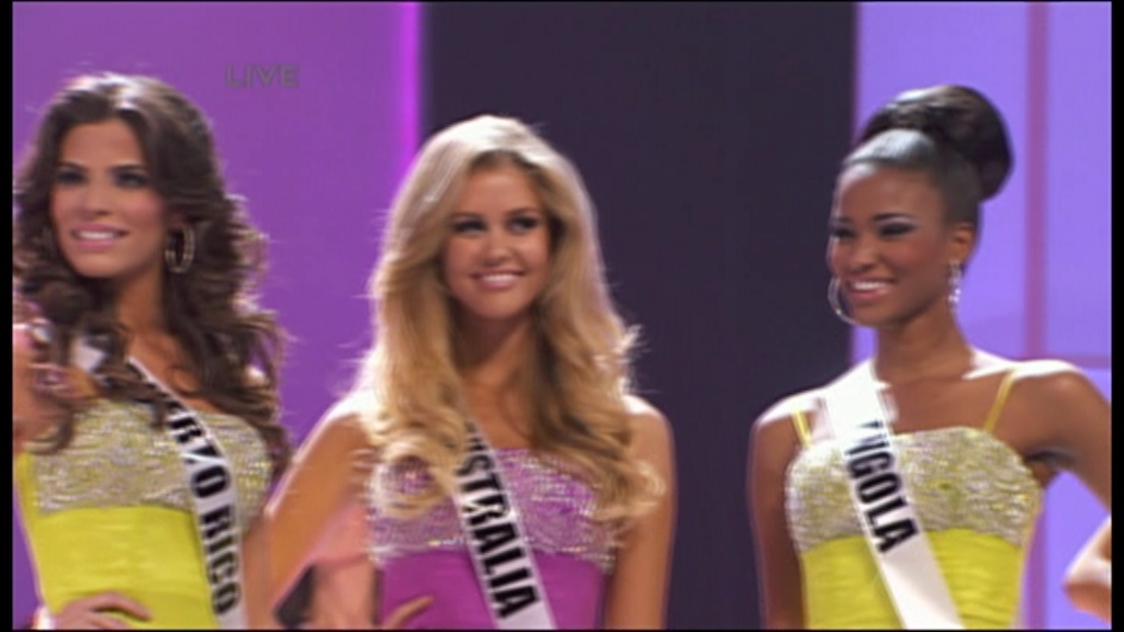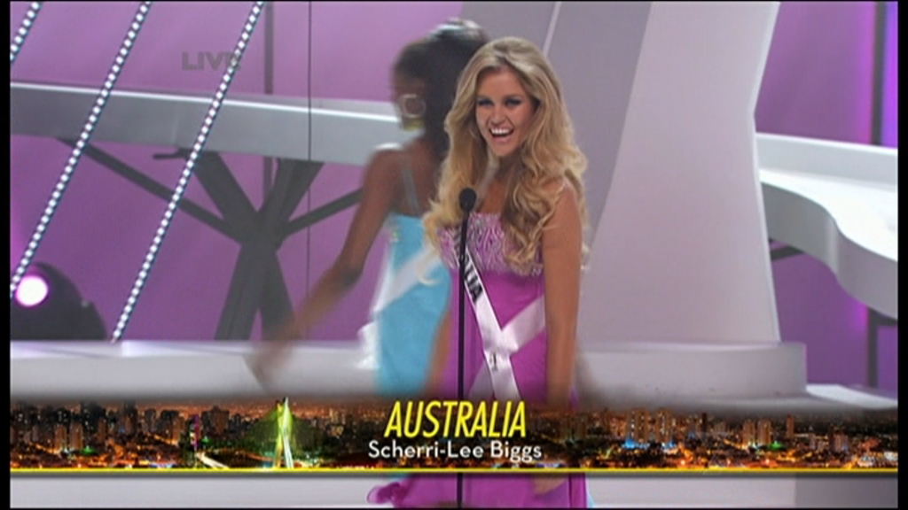 Biggs, a popular delegate and favourite to win the competition, became Miss Universe Australia on 7 July 2011 in a ceremony held at Melbourne's Sofitel hotel, outdoing 21 other delegates from across the country. This certified her with a place in the Miss Universe pageant, held in São Paulo, Brazil on 12 September 2011, where she placed in the Top 10 before losing.