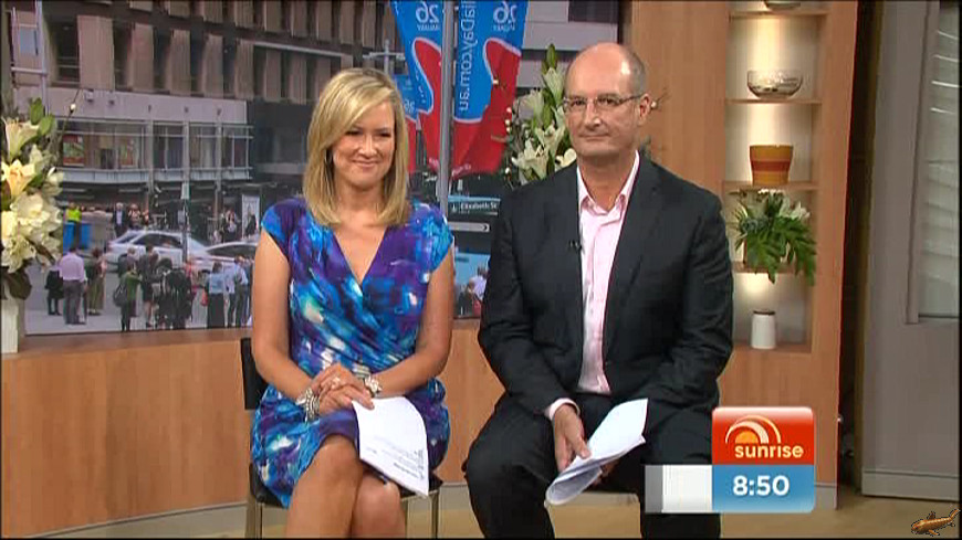 That black and white number its wearing seems to make her look more and more like the cash cow. Is that why they stopped it , because she went on holiday.. Personally im getting pretty sick of sunrise and have watched it almost every day for over 10 years, Viewing area is smaller, Tops are Higher, Skirts are longer, Mel seems to be very self concience of herself by continually looking into the monitors to see if she needs to cross her hands over her knee caps. Why would you cover up the most gorgeous pair of legs  in the business and no doubt an asset that has helped make sunrise what it is today. If this bulls#**t keeps up, I'll finally have to start using my remote control