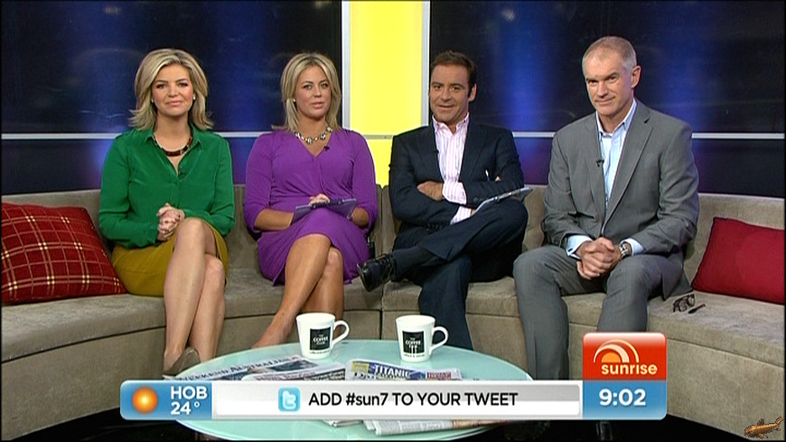 Thank you weekend sunrise! Sam & Bec on the couch together.. Horray!! Sam that purple dress.. WOW.. Bec u could wear a potato sack for all i care and i'd be happy!!