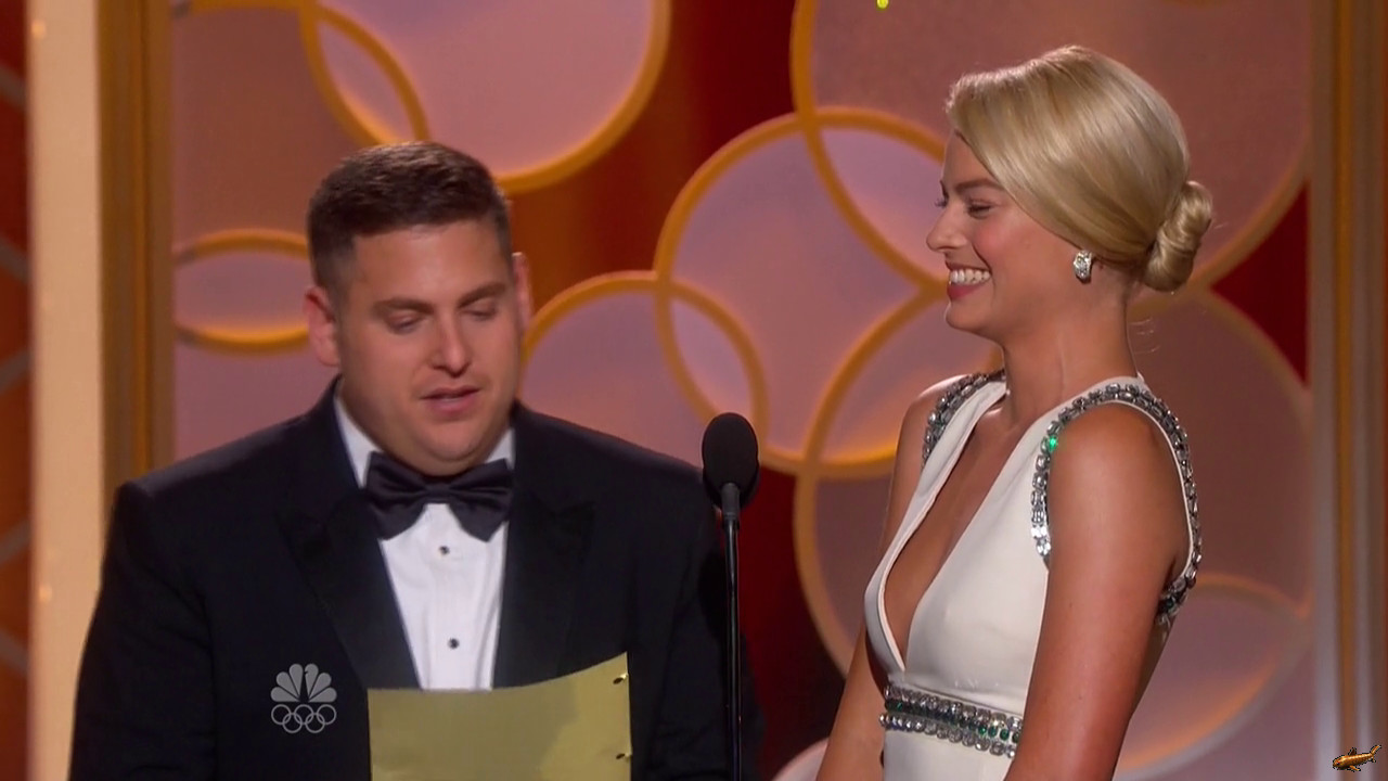golden globes "Margot Robbie lit up the red carpet in a plunging white Gucci dress with jewel embellishment" (quote daily mail)