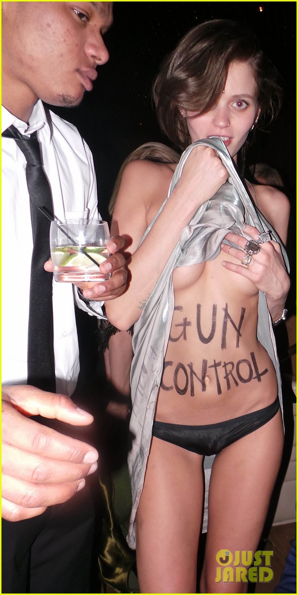 Abbey Lee Kershaw lifts up her dress to show off her support for gun control at a party following the 2013 Met Gala at the Standard Hotel on Monday (May 6) in New York City.