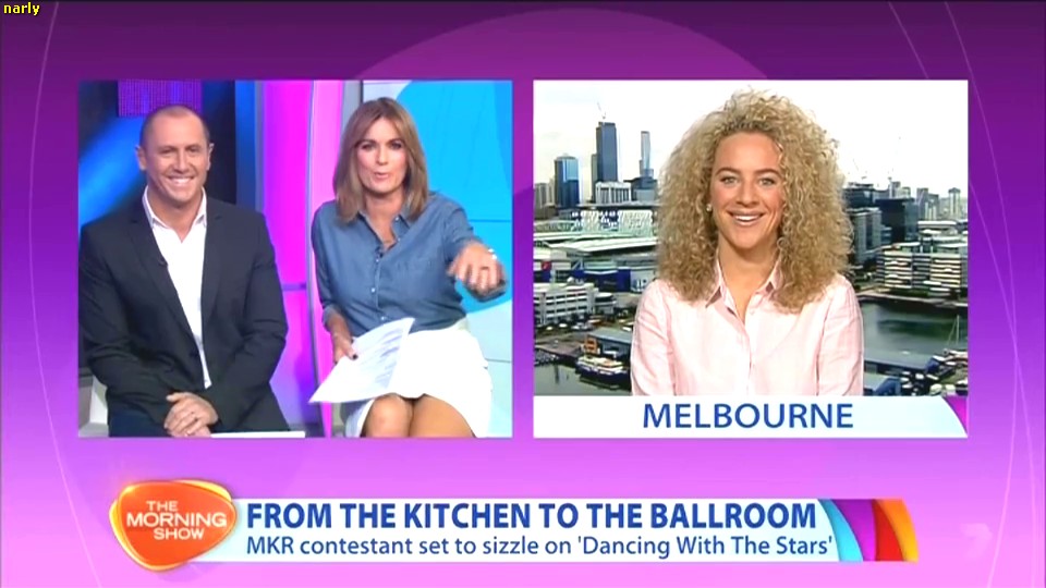 Scythe73 wrote: Check out the interview with former MKR contestant who is on DWS, Kylie gives a very good opportunity for upskirt  Good opportunity for upskirt, are you kidding? I REALLY HOPE that someone capped this, it was after 10.00 am this morning, Kylie gave us the absolute best full on upskirt I have ever seen. She was sitting on the chair next to Larry interviewing that woman and her skirt had ridden up very high, then she just opened up TOTALLY EXPOSING her white panties right in front of the camera, before she crossed her legs. It was a real glory shot, so clear, shameless and right in your face as the camera was real close. I nearly had a heart attack. Absolutely amazing!