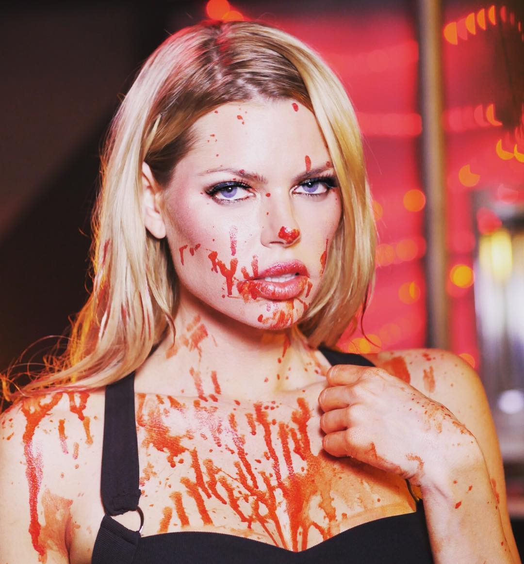 Quote: For a vegetarian I've got a lot of fake blood going on 😂 it tasted like sugar #calories 😝. #horrorfilm #bloodfeast #remake #2016