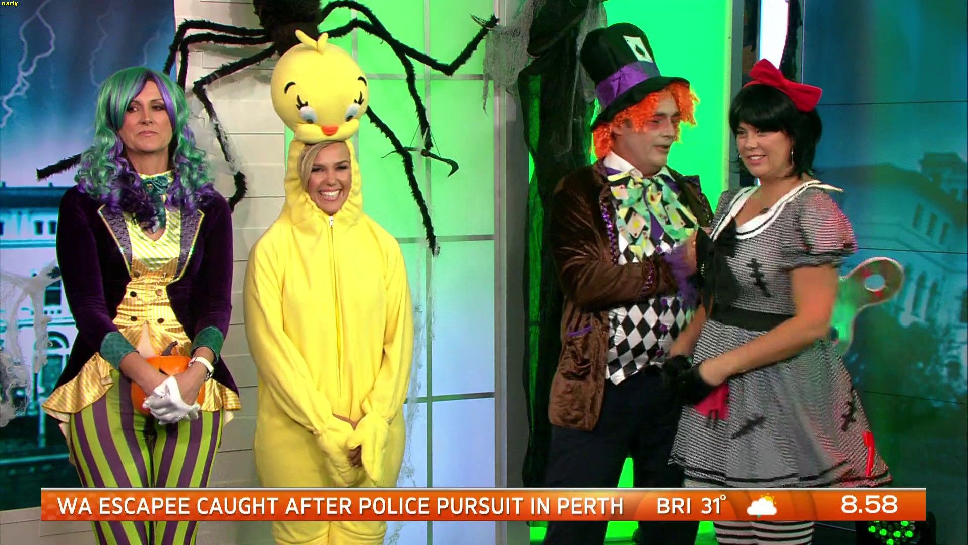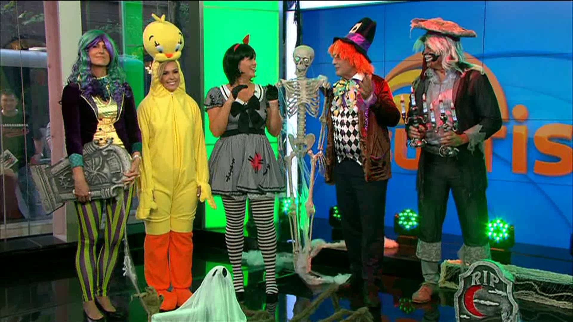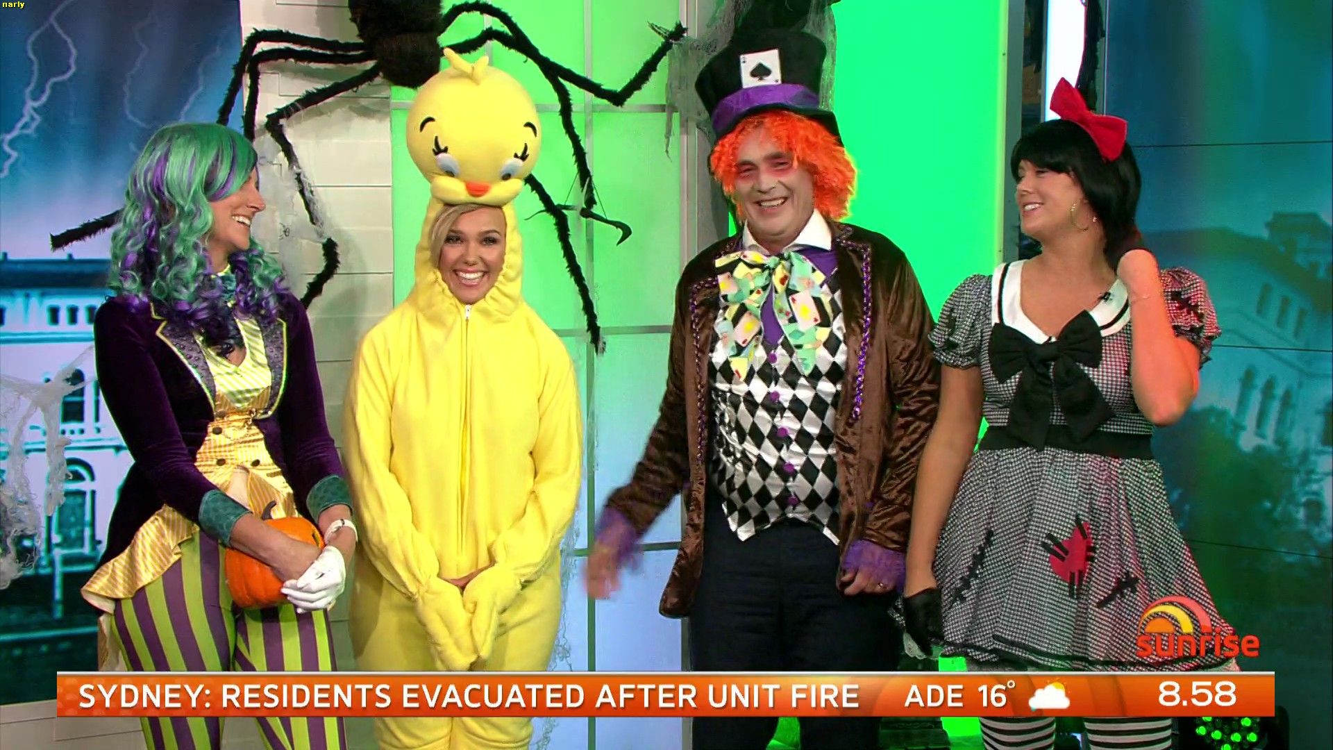 Not sure if anyone caught the end of Sunrise yesterday, but everyone was dressed in Halloween costumes. Nat was wearing skin tight leggings and she was obviously feeling very uncomfortable with them because she was holding a pumpkin in front of her crutch. Maybe covering a camel toe. Would have loved to have seen her without it and then have her realise later. There were comments made to her about covering herself up but I didn't catch what they were.