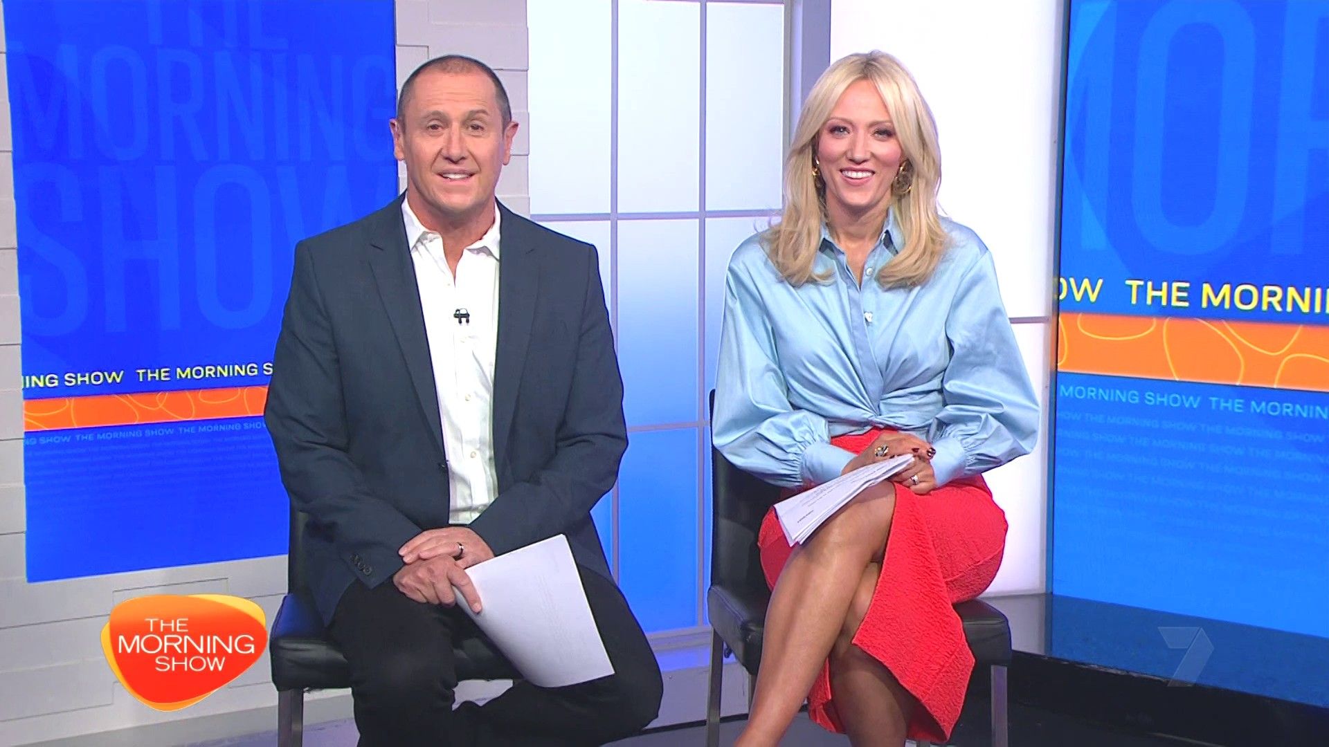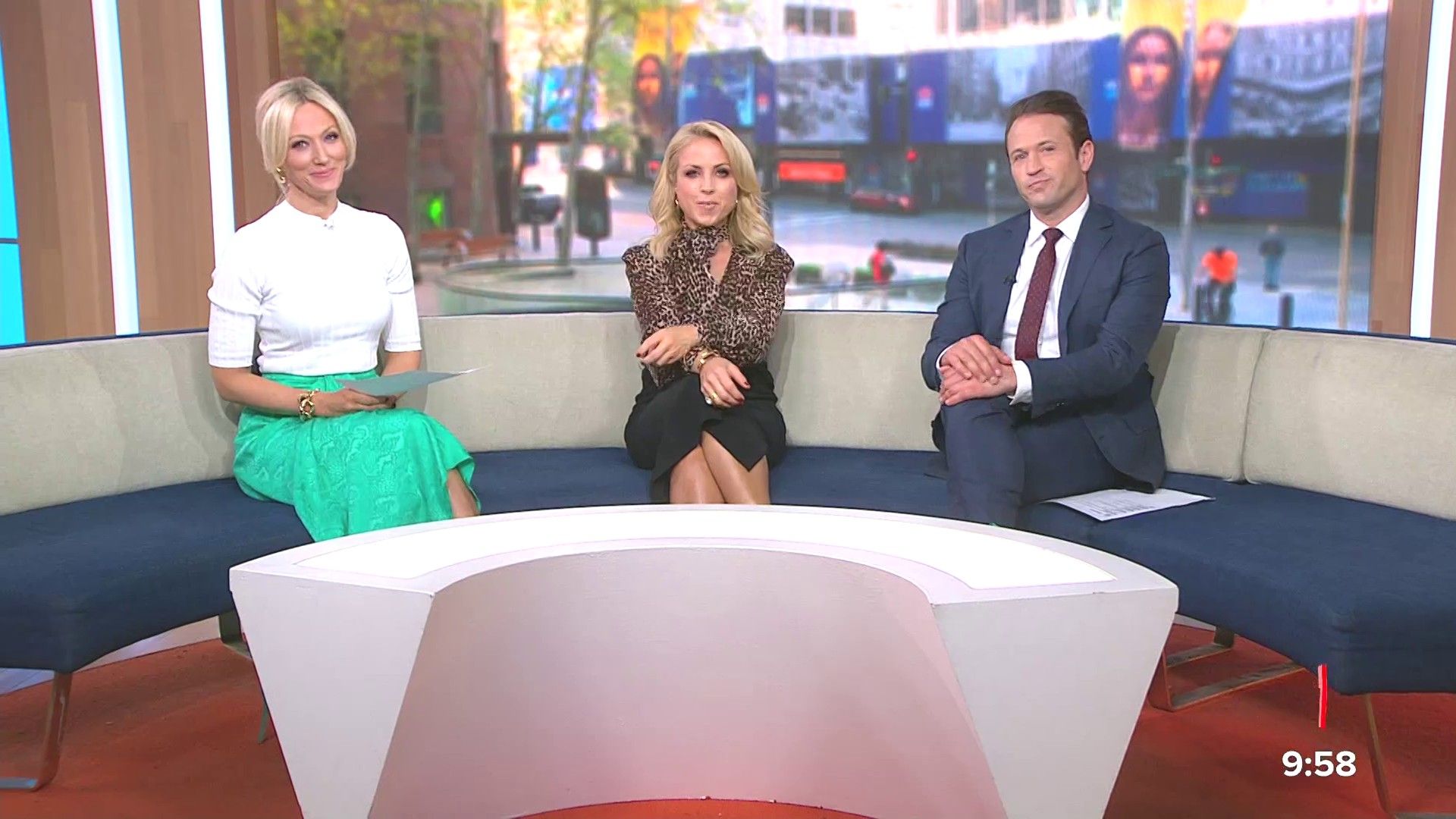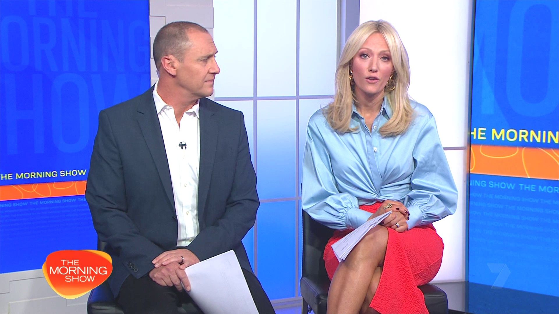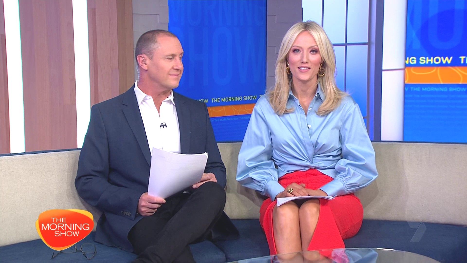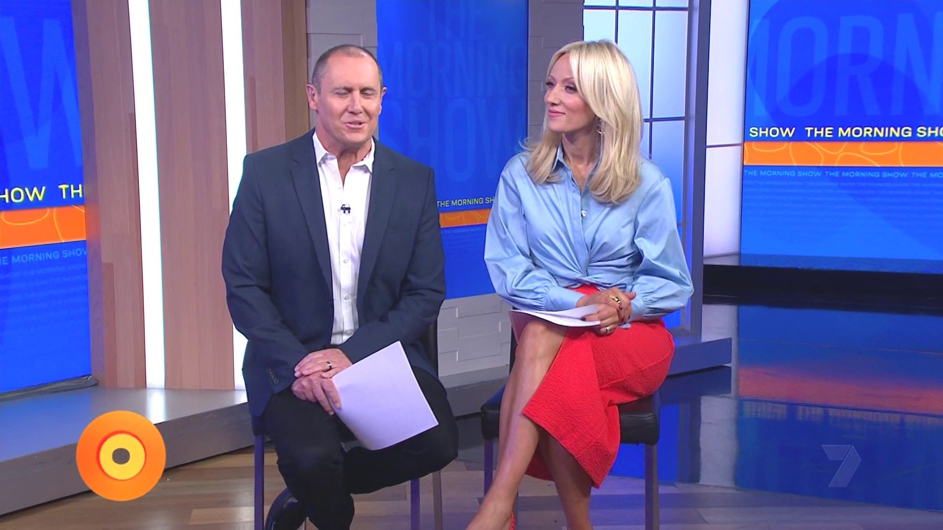 Sally hosting Morning Show in red split skirt today at about 9:35 with Gemma Acton saw her again on high chairs