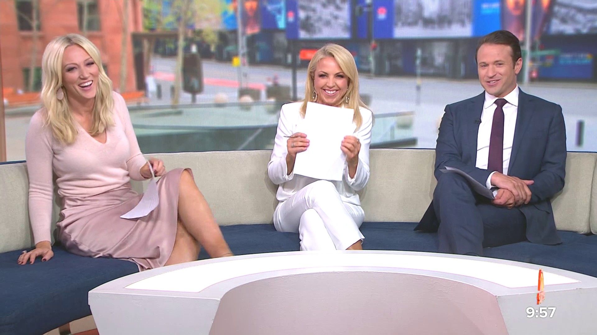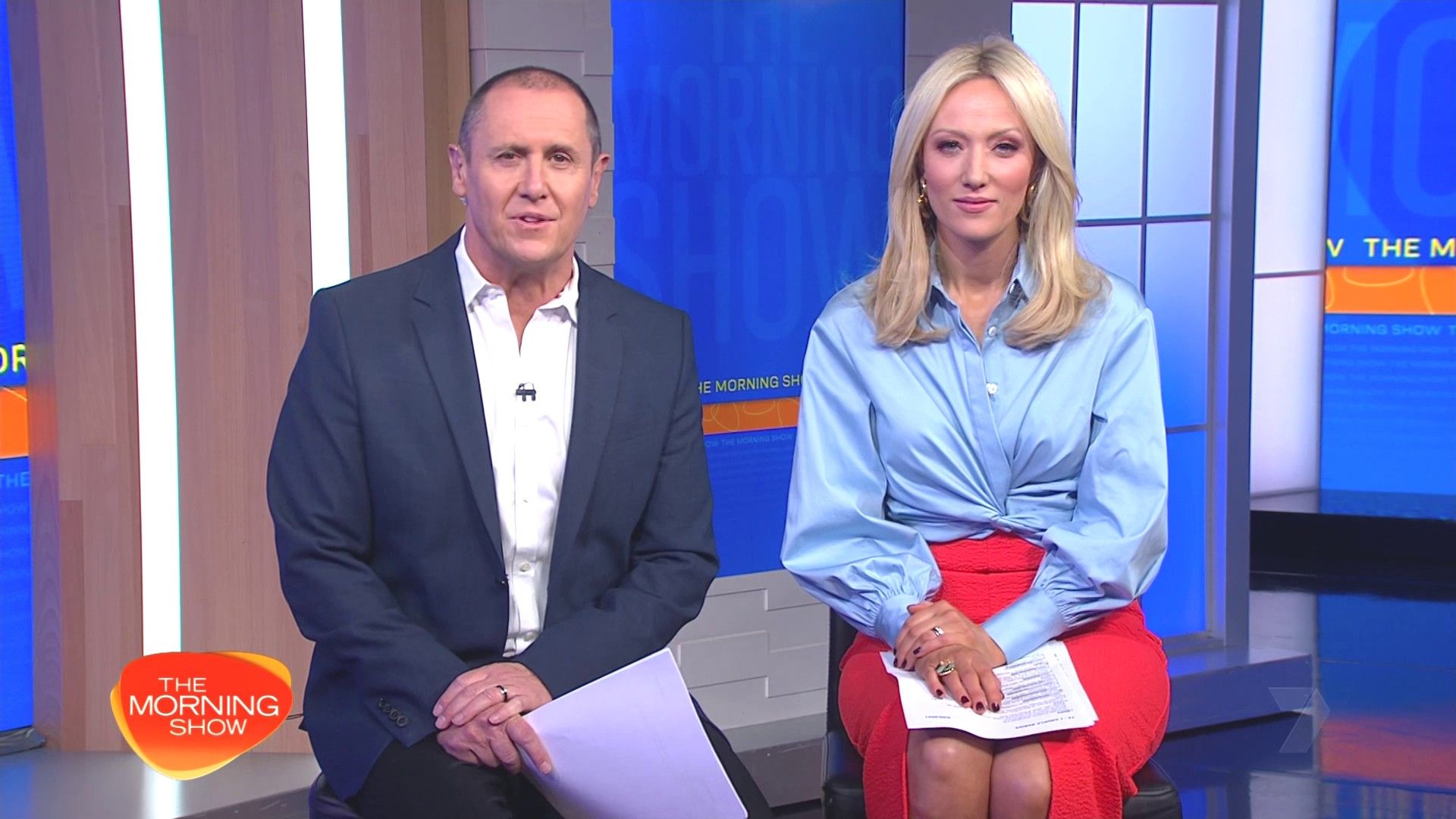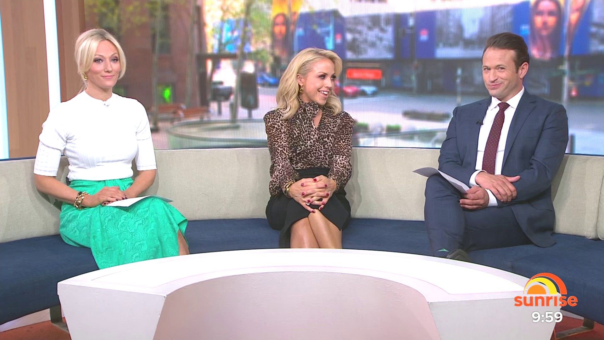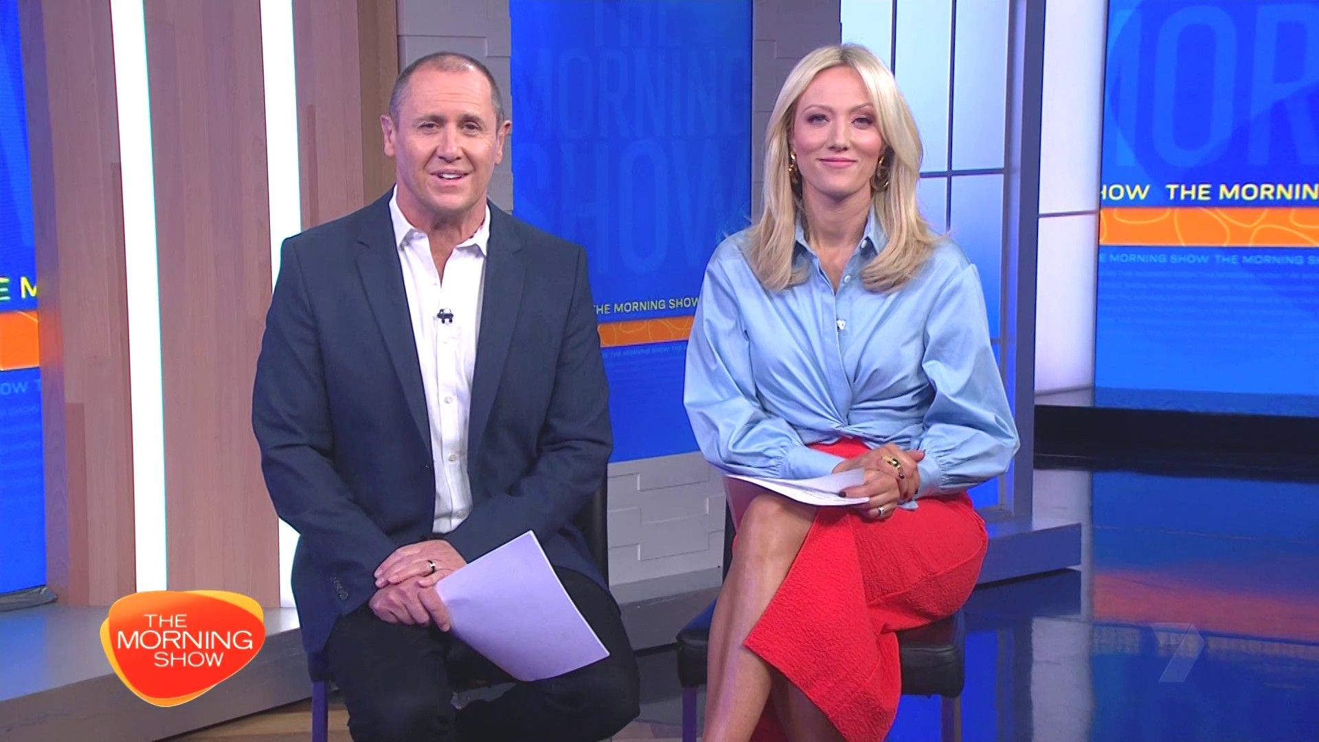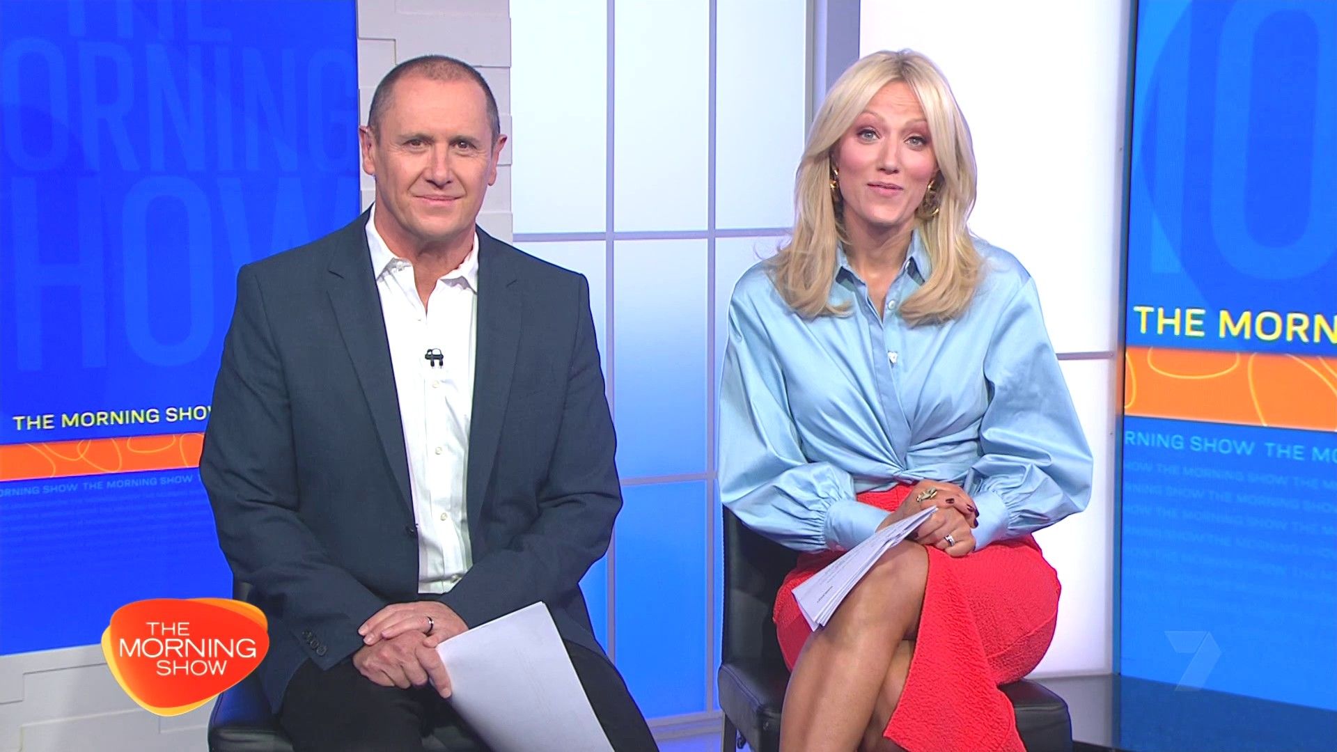Sally hosting Morning Show in red split skirt today at about 9:35 with Gemma Acton saw her again on high chairs